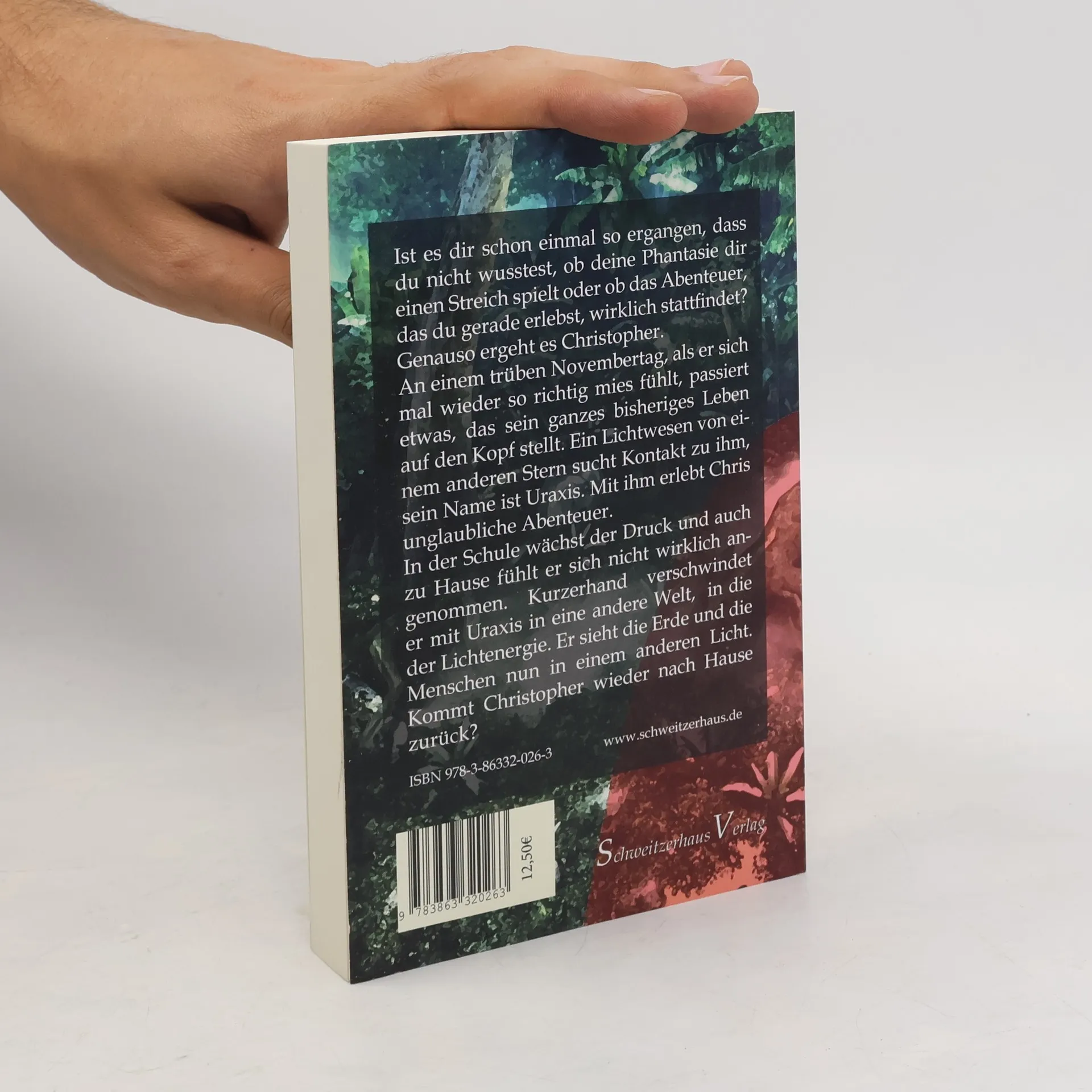 Ist es dir schon einmal so ergangen, dass du nicht wusstest, ob deine Phantasie dir einen Streich spielt oder ob das Abenteuer, das du gerade erlebst, wirklich stattfindet? Genauso ergeht es Christopher. An einem trüben Novembertag, als er sich mal wieder so richtig mies fühlt, passiert etwas, das sein ganzes bisheriges Leben auf den Kopf stellt. Ein Lichtwesen von einem anderen Stern sucht Kontakt zu ihm, sein Name ist Uraxis. Mit ihm erlebt Chris unglaubliche Abenteuer. In der Schule wächst der Druck und auch zu Hause fühlt er sich nicht wirklich angenommen. Kurzerhand verschwindet er mit Uraxis in eine andere Welt, in die der Lichtenergie. Er sieht die Erde und die Menschen nun in einem anderen Licht. Kommt Christopher wieder nach Hause zurück?