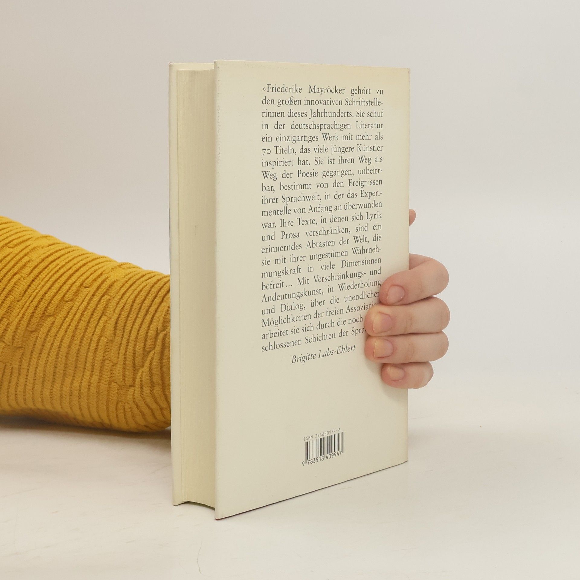 Friederike Mayröcker wurde am 20. Dezember 1924 in Wien geboren und starb am 4. Juni 2021 ebendort. Sie besuchte zunächst die Private Volksschule, ging dann auf die Hauptschule und besuchte schließlich die kaufmännische Wirtschaftsschule. Die Sommermonate verbrachte sie bis zu ihrem 11. Lebensjahr stets in Deinzendorf, welche einen nachhaltigen Eindruck bei ihr hinterließen. Nach der Matura legte sie die Staatsprüfung auf Englisch ab und arbeitete zwischen 1946 bis 1969 als Englischlehrerin an verschiedenen Wiener Hauptschulen. Bereits 1939 begann sie mit ersten literarischen Arbeiten, sieben Jahre später folgten kleinere Veröffentlichungen von Gedichten. Im Jahre 1954 lernte sie Ernst Jandl kennen, mit dem sie zunächst eine enge Freundschaft verbindet, später wird sie zu seiner Lebensgefährtin. Nach ersten Gedichtveröffentlichungen in der Wiener Avantgarde-Zeitschrift „Plan“ erfolgte 1956 ihre erste Buchveröffentlichung. Seitdem folgten Lyrik und Prosa, Erzählungen und Hörspiele, Kinderbücher und Bühnentexte.