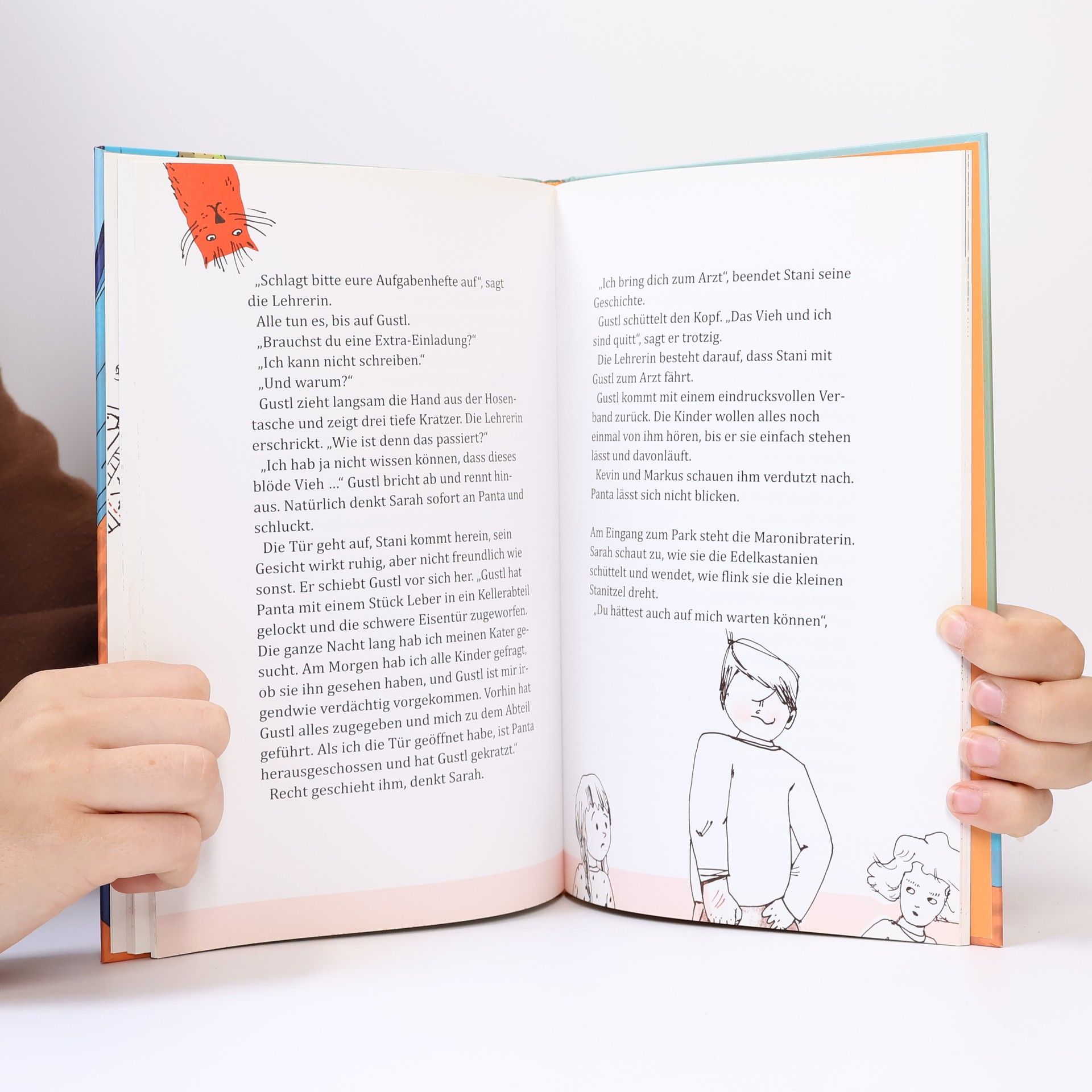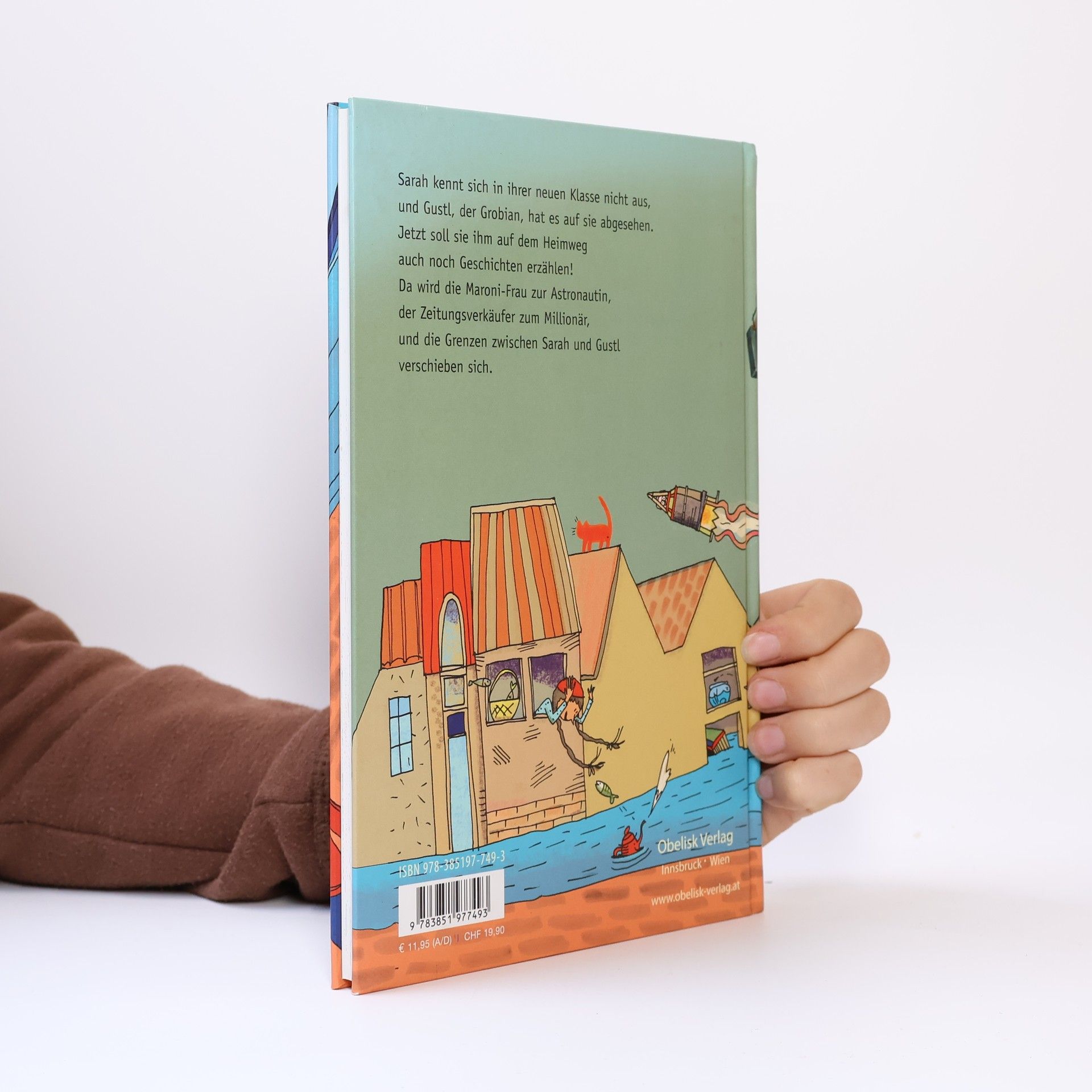 Sarah kann kein Rad schlagen, und ordentlich pfeifen kann sie auch nicht. Das hilft nicht unbedingt in einer neuen Klasse, und Gustl, der Grobian, macht ihr den Heimweg zur Hölle. Bis Gustl eine Geschichte verlangt – und Sarahs Worte sich einfach aneinanderreihen, bunt und vielversprechend. Die Maroni-Frau wird zur Astronautin, der Zeitungsverkäufer zum Millionär, der Radfahrer landet kurzerhand auf dem Kirchturm. Und langsam verschieben sich zwischen Sarah und Gustl die Größenverhältnisse.