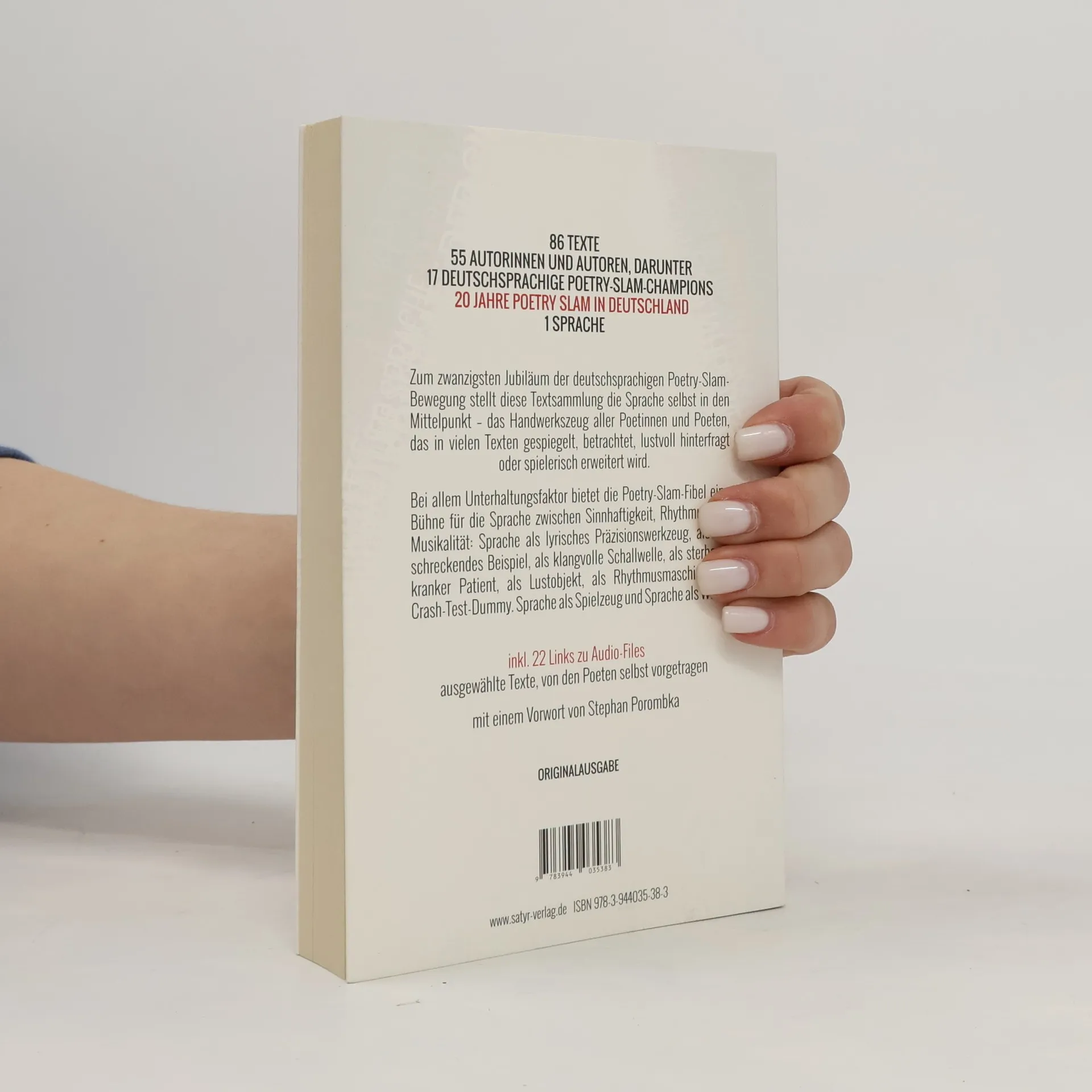 86 Texte – 55 Autorinnen und Autoren, darunter 17 Deutschsprachige Poetry-Slam-Champions – 20 Jahre Poetry Slam in Deutschland – 1 Sprache Zum zwanzigsten Jubiläum der deutschsprachigen Poetry-Slam-Bewegung stellt diese Textsammlung die Sprache selbst in den Mittelpunkt – das Handwerkszeug aller Poetinnen und Poeten, das in vielen Texten gespiegelt, betrachtet, lustvoll hinterfragt oder spielerisch erweitert wird. Bei allem Unterhaltungsfaktor bietet die Poetry-Slam-Fibel eine Bühne für die Sprache zwischen Sinnhaftigkeit, Rhythmus und Musikalität: Sprache als lyrisches Präzisionswerkzeug, als abschreckendes Beispiel, als klangvolle Schallwelle, als sterbenskranker Patient, als Lustobjekt, als Rhythmusmaschine, als Crash-Test-Dummy. Sprache als Spielzeug und Sprache als Waffe. Mit Beiträgen von Nora Gomringer, Marc-Uwe Kling, Bodo Wartke, Sebastian Krämer, Julian Heun, Theresa Hahl, Sebastian23, Patrick Salmen, Lars Ruppel, Andy Strauß, Pierre Jarawan, Volker Strübing u. v. a. m. Mit einem Vorwort von Stephan Porombka (Professor für Texttheorie und Textgestaltung an der Universität der Künste in Berlin, ehemaliger Poetry-Slammer) Buch inkl. 22 Links zu Audio-Files: ausgewählte Texte, von den Poeten selbst vorgetragen.