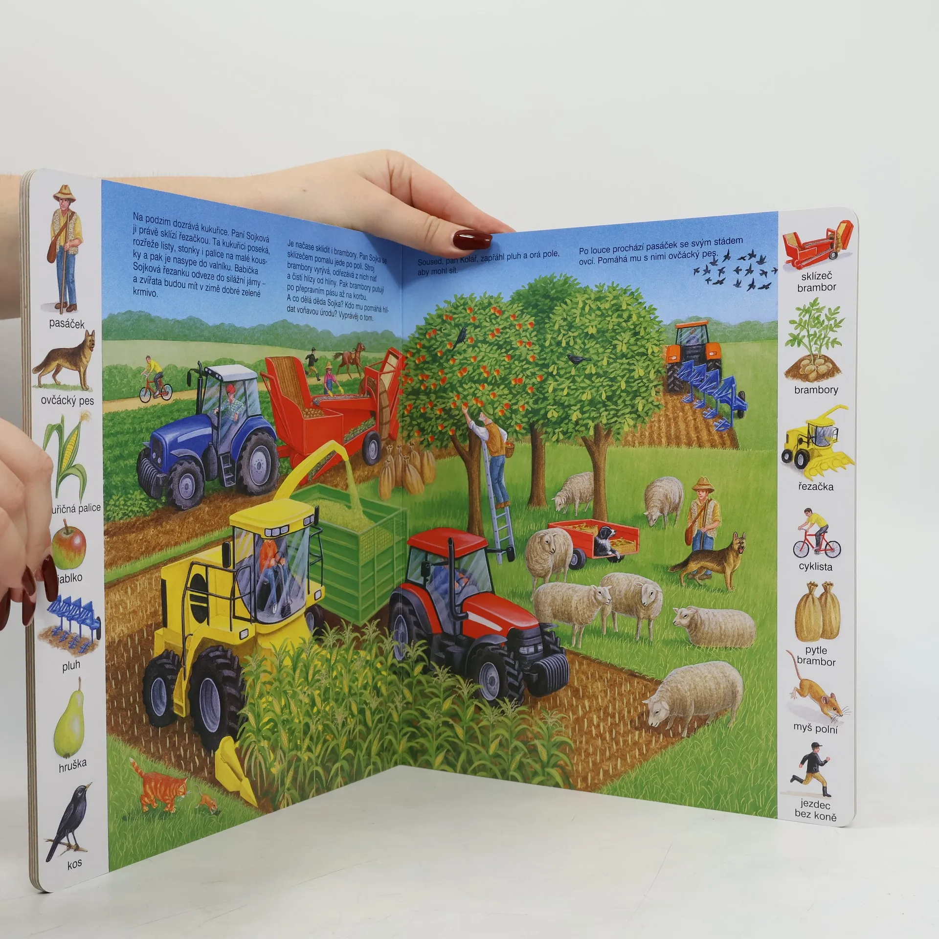 Toto leporelo je určeno pro děti, které se zajímají o život a dění kolem sebe. Kniha je seznamuje se stroji a nástroji používanými na statku, s rostlinami a zvířátky, které mohou na venkově vidět, ale i s činnostmi, které se na statku, na polích a loukách provádějí v průběhu čtyř ročních období. Nechybí ani jednoduché otázky, na které děti najdou srozumitelné odpovědi. Knížka je doplněna půvabnými názornými barevnými ilustracemi a rastrem s podrobnými vyobrazeními.