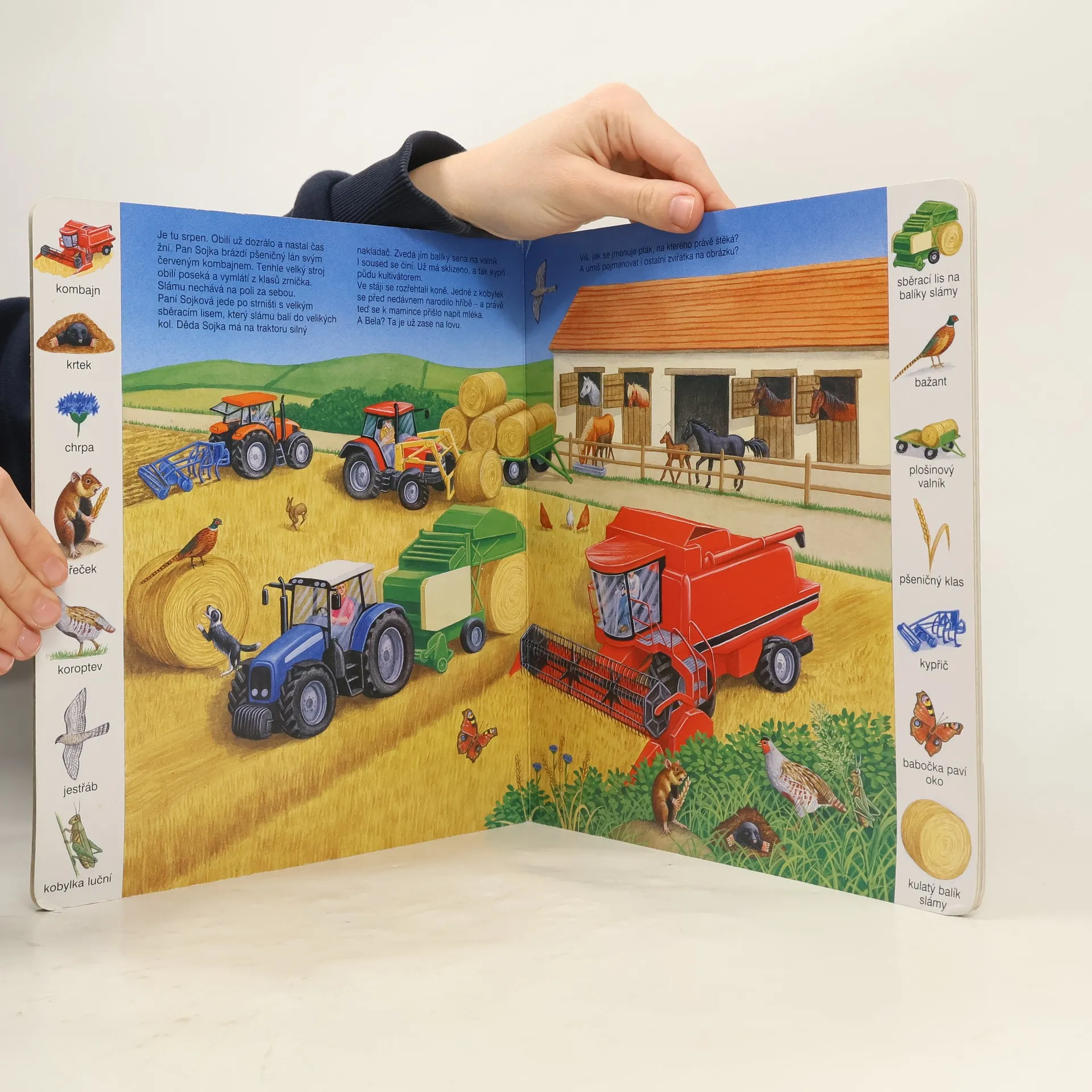 Toto leporelo je určeno pro děti, které se zajímají o život a dění kolem sebe. Kniha je seznamuje se stroji a nástroji používanými na statku, s rostlinami a zvířátky, které mohou na venkově vidět, ale i s činnostmi, které se na statku, na polích a loukách provádějí v průběhu čtyř ročních období. Nechybí ani jednoduché otázky, na které děti najdou srozumitelné odpovědi. Knížka je doplněna půvabnými názornými barevnými ilustracemi a rastrem s podrobnými vyobrazeními.