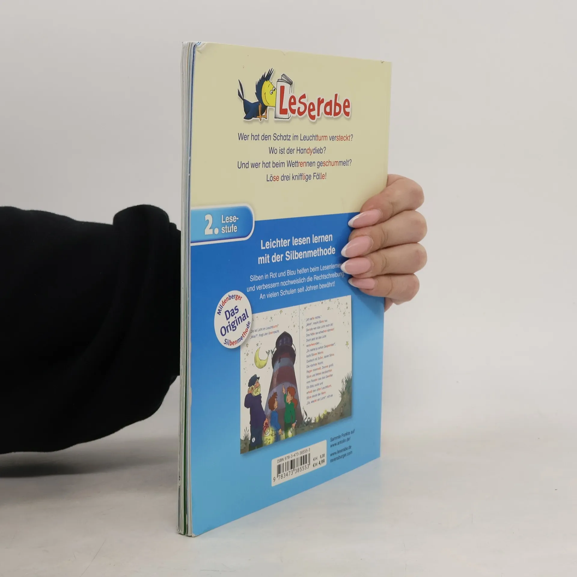Drei spannende Mitratekrimis für fortgeschrittene Erstleser ab der 2. Klasse: Nach einem Überfall auf einen Juwelier versteckt der Täter die Beute im Leuchtturm und quartiert sich in einer nahegelegenen Pension ein. Die Geschwister Silvie und Matteo, die mit ihren Eltern dort wohnen, kommen dem Dieb auf die Spur. Im Freibad verbringt Marie mit ihrer Mutter einen entspannten Tag, bis ein Taschendieb das Handy ihrer Mutter stiehlt. Marie setzt alles daran, den Täter zu entlarven. Bei einem Waldlauf treten Rick, Timo und Philipp gegeneinander an. Timo gewinnt, doch es stellt sich heraus, dass er während des Rennens von seinem Zwillingsbruder Tobi abgelöst wurde. Die Geschichten fördern die Lesekompetenz durch die original Mildenberger Silbenmethode, die mit farblich gekennzeichneten Silben arbeitet und nachweislich die Rechtschreibung verbessert. Die Bücher sind bei Antolin gelistet und bieten eine unterhaltsame Möglichkeit, das Lesen zu erlernen. So macht Lesenlernen Spaß!