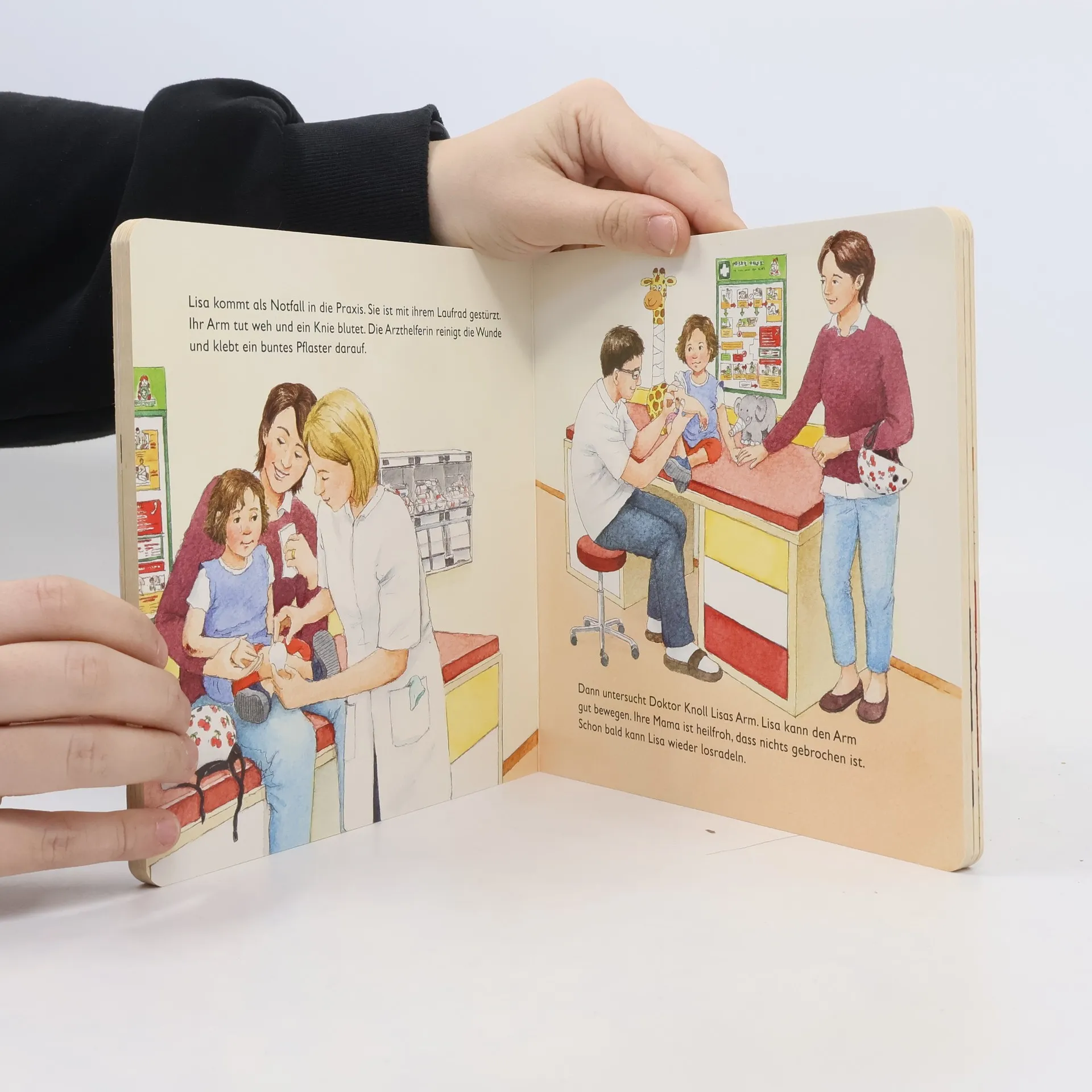 Beim Kinderarzt ist viel los. Finn hat Bauchweh, Amelie kommt zur Vorsorgeuntersuchung, Lisa hat sich das Knie aufgeschlagen und Emmi macht einen Sehtest.