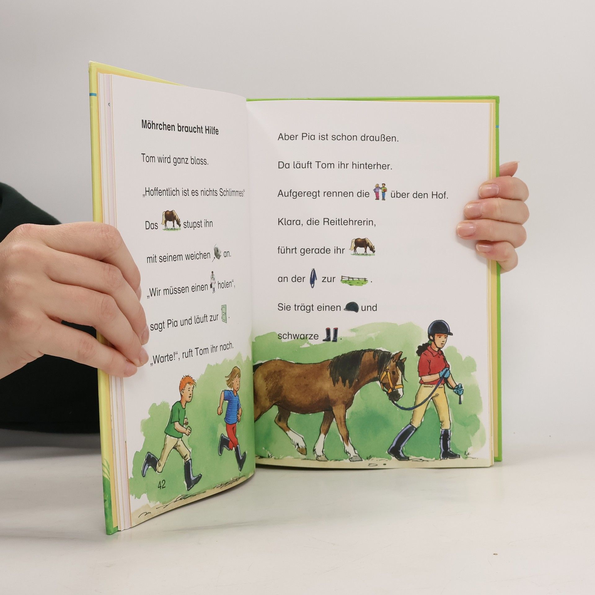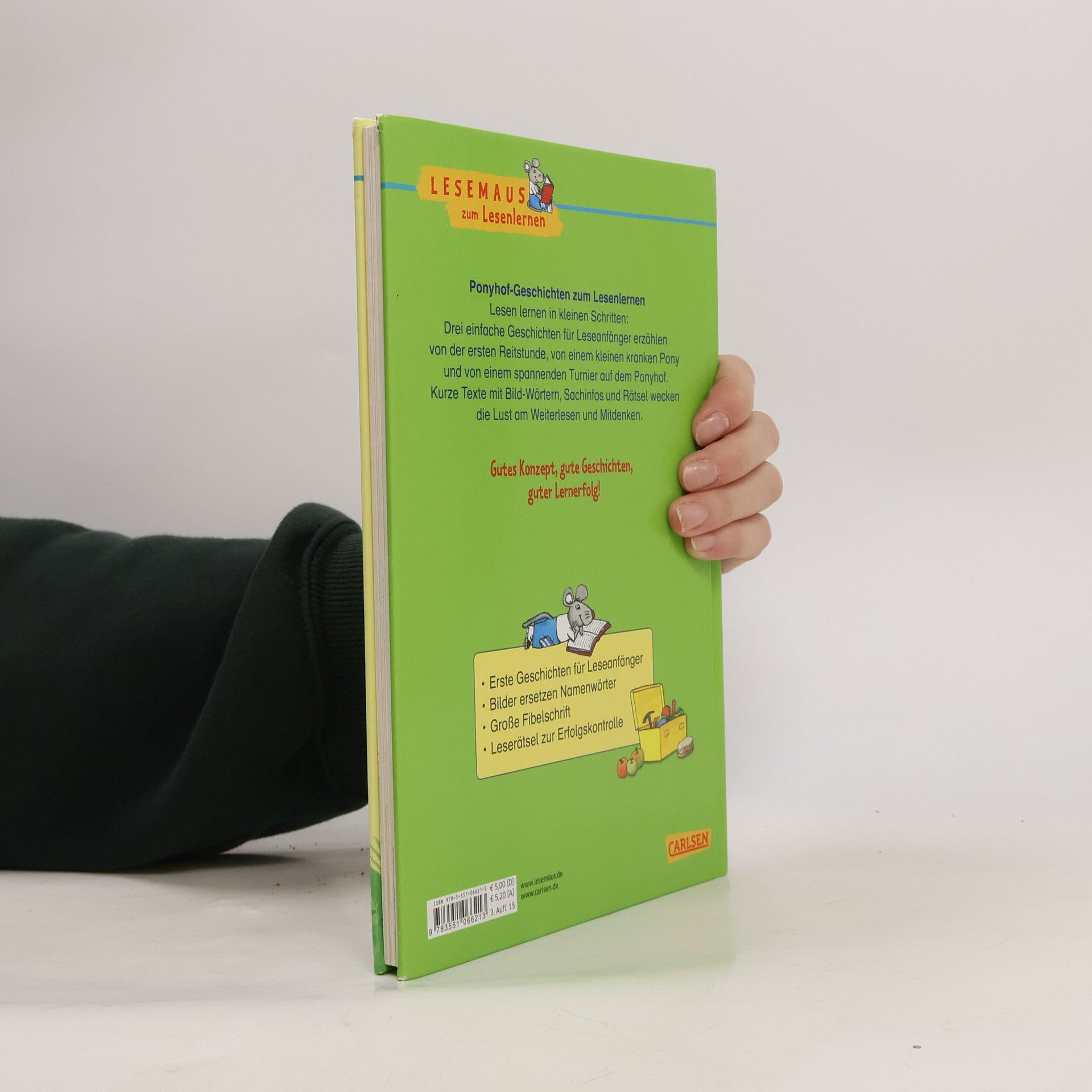 Lesen lernen in kleinen Schritten: Drei einfache Geschichten für Erstleser erzählen von der ersten Reitstunde, von einem kleinen kranken Pony und von einem spannenden Turnier auf dem Ponyhof. Kurze Texte mit Bild-Wörtern, kindgerechte Sachinfos und Rätsel wecken die Lust am Weiterlesen und Mitdenken. Lesemaus zum Lesenlernen: Gutes Konzept, gute Geschichten, guter Lernerfolg! Erste Geschichten für Leseanfänger Bilder ersetzen Namenwörter Große Fibelschrift Leserätsel zur Erfolgskontrolle Enthält folgende Geschichten: Pia auf dem Reiterhof, Ein kleines Pony wird wieder gesund, Ein spannendes Turnier auf dem Ponyhof