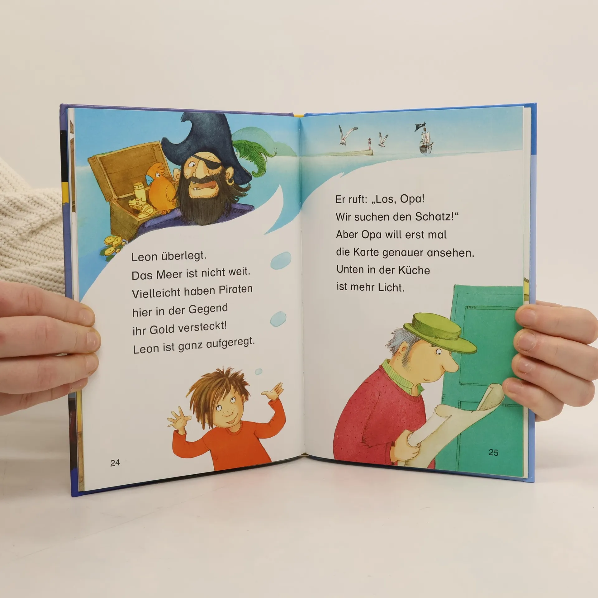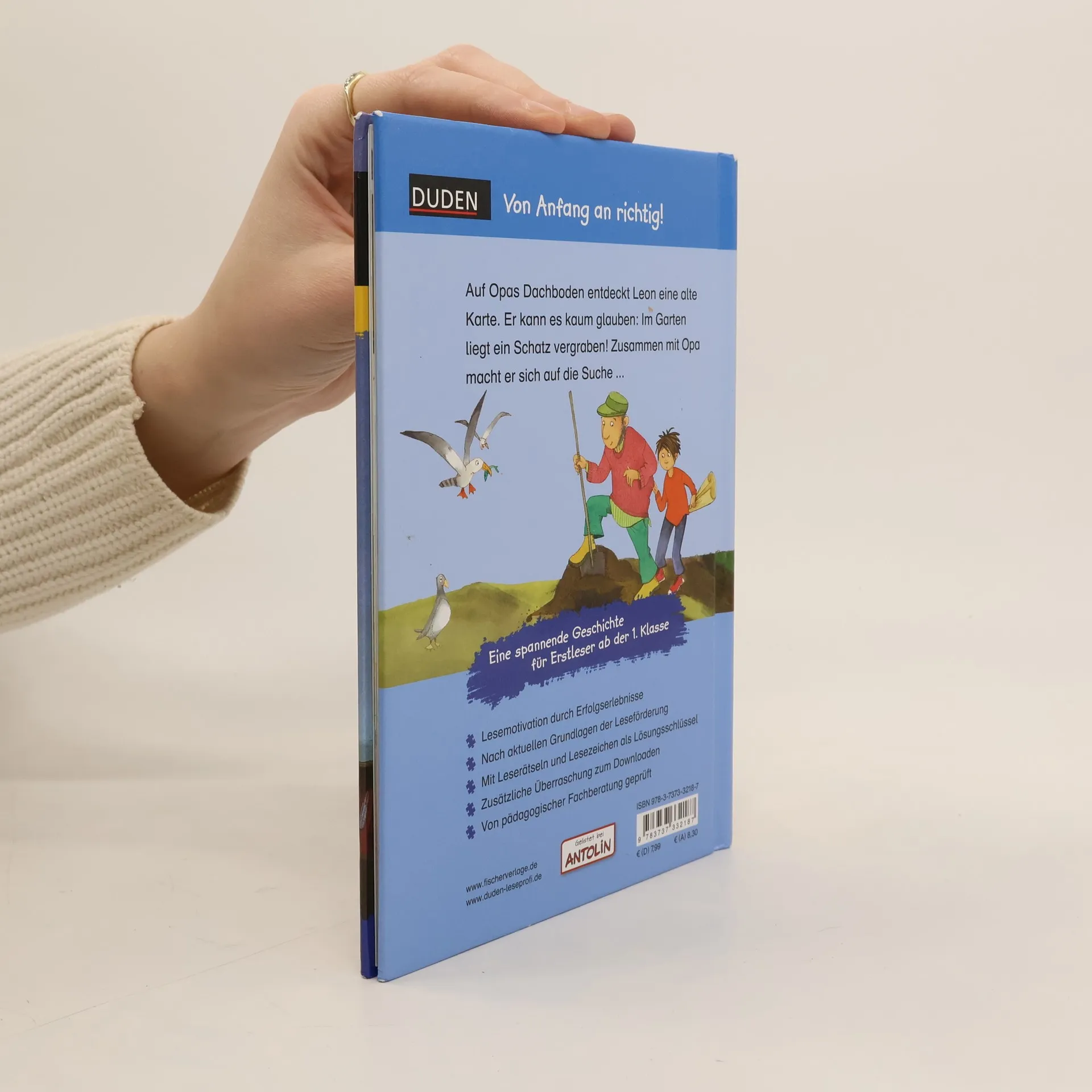 Eine spannende Abenteuergeschichte für Erstleser*innen ab der 1. Klasse In extragroßer Fibelschrift für Leseanfänger Mit kurzen, kindgerechten Sätzen und Sinnumbrüchen Aufregende Geschichte über eine Schatzsuche zum ersten Selberlesen ab 6 Jahren Mit kleinen, abwechslungsreichen Rätseln für jede Menge Lesespaß Mit Lesezeichen als Lösungsschlüssel Bei Antolin gelistet und von einer pädagogischen Fachberatung geprüft Auf dem Dachboden seines Großvaters entdeckt Leon eine alte Karte. Er kann es kaum glauben: Allem Anschein nach liegt in Opas Garten ein Schatz vergraben! Klar, dass die beiden sich sofort mit einem Spaten bewaffnen und der Sache auf den Grund gehen … Die geheimnisvolle Schatzkarte − Diese Erstlesegeschichte mit vielen bunten Bildern aus der DUDEN Leseprofireihe ist das perfekte Geschenk zum Schulanfang oder für die Schultüte . Der Text ist genau auf die Bedürfnisse der Jungen und Mädchen zugeschnitten. So erleben Kinder im Grundschulalter schnell motivierende Erfolge und werden für das Lesen begeistert . Die Leserätsel zur Sicherung des Textverständnisses begleiten dabei beim Lesen. Spielerisch wird somit die Lesekompetenz gefördert und das Lesen lernen zum Kinderspiel. Duden – von Anfang an richtig! Lesenlernen leicht gemacht: So geht zeitgemäße Leseförderung . Weitere Bände der Reihe: Band 1: Die geheimnisvolle Schatzkarte Band 2: Das Geheimnis im Schuppen Band 3: Die abenteuerliche Schatzsuche