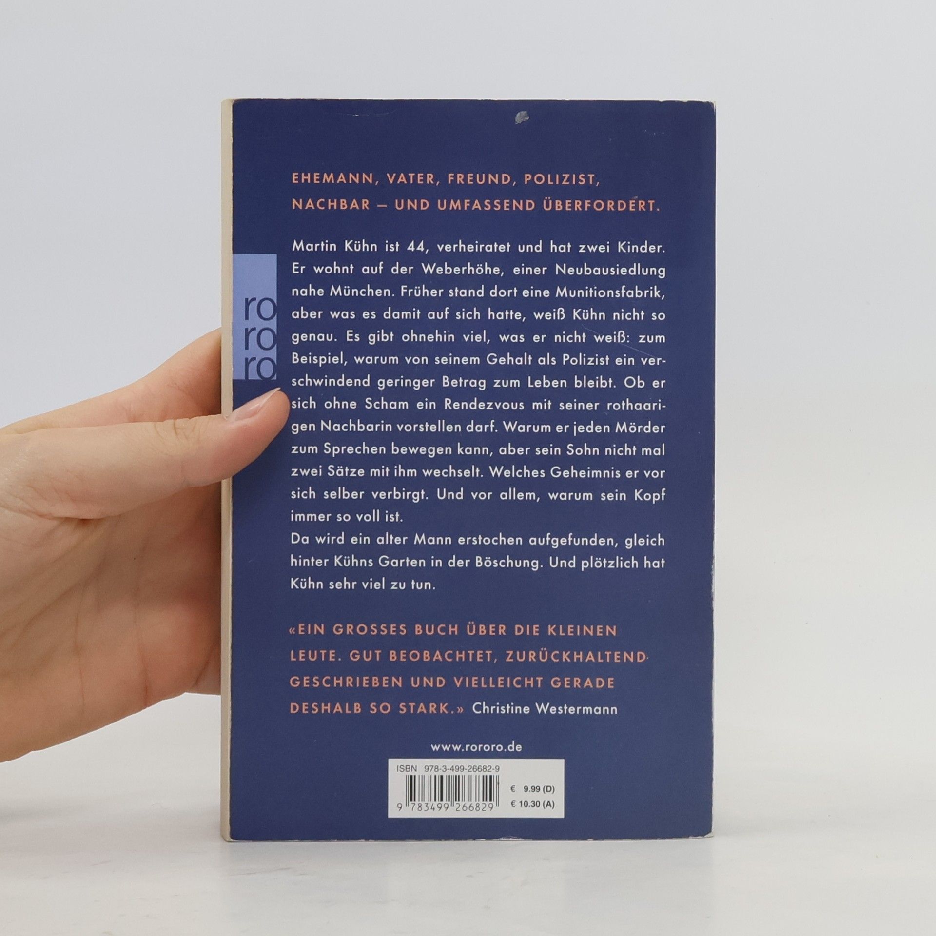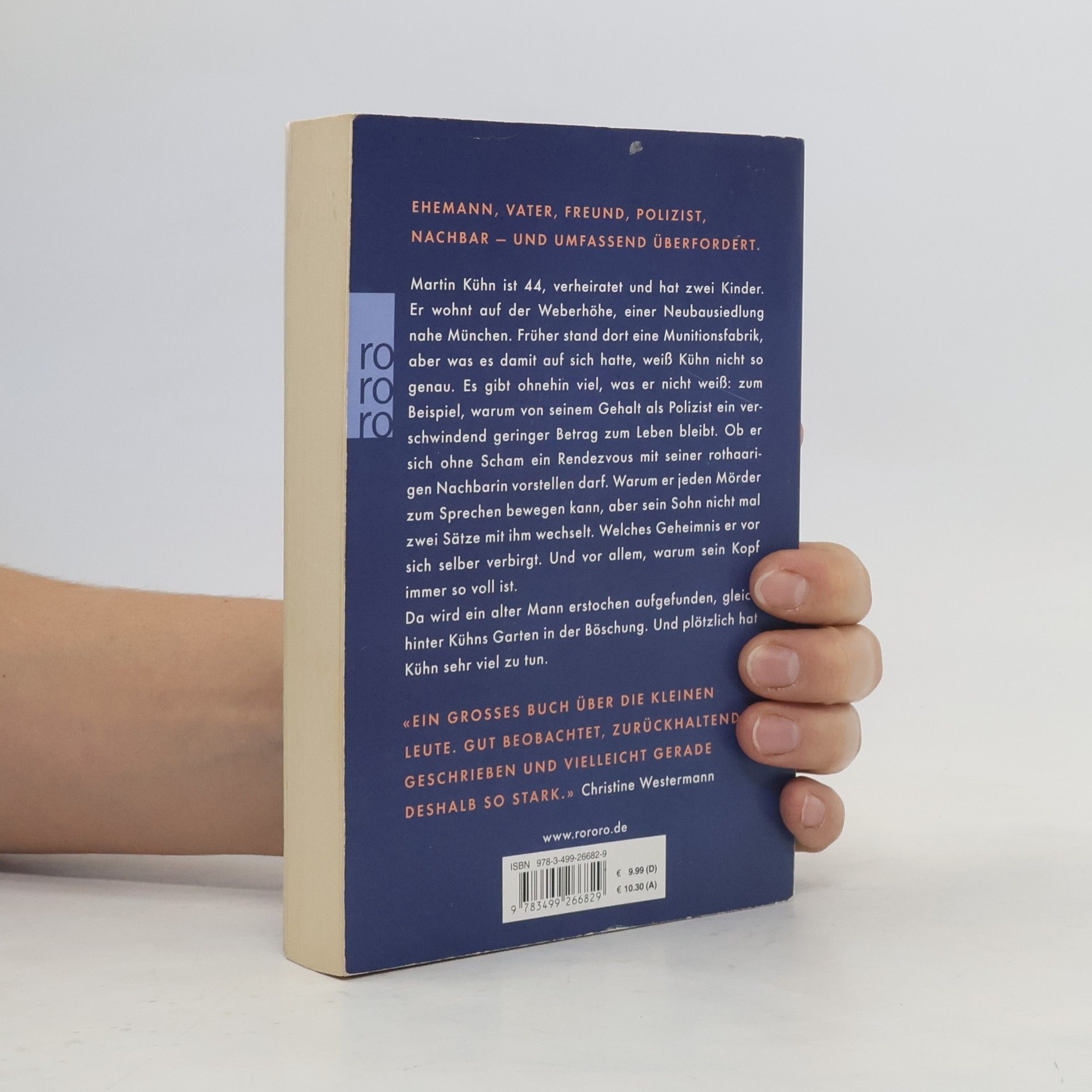 Ehemann, Vater, Freund, Polizist, Nachbar – und umfassend überfordert. Martin Kühn ist 44, verheiratet und hat zwei Kinder. Er wohnt auf der Weberhöhe, einer Neubausiedlung nahe München. Früher stand dort eine Munitionsfabrik, aber was es damit auf sich hatte, weiß Kühn nicht so genau. Es gibt ohnehin viel, was er nicht weiß: Zum Beispiel, warum von seinem Gehalt als Polizist ein verschwindend geringer Betrag zum Leben bleibt. Ob er sich ohne Scham ein Rendezvous mit seiner rothaarigen Nachbarin vorstellen darf. Warum er jeden Mörder zum Sprechen bewegen kann, aber sein Sohn nicht mal zwei Sätze mit ihm wechselt. Welches Geheimnis er vor sich selber verbirgt. Und vor allem, warum sein Kopf immer so voll ist. Da wird ein alter Mann erstochen aufgefunden, gleich hinter Kühns Garten in der Böschung. Und plötzlich hat Kühn sehr viel zu tun.