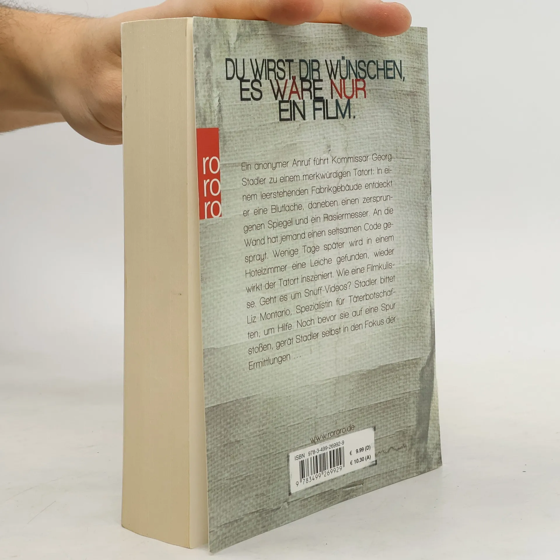 Du wirst Dir wünschen, es wäre nur ein Film. Ein anonymer Anruf führt Kommissar Georg Stadler zu einem merkwürdigen Tatort: In einem leerstehenden Fabrikgebäude entdeckt er eine Blutlache, daneben einen zersprungenen Spiegel und ein Rasiermesser. An die Wand hat jemand einen seltsamen Code gesprayt. Wenige Tage später wird in einem Hotelzimmer eine Leiche gefunden, wieder wirkt der Tatort inszeniert. Wie eine Filmkulisse. Geht es um Snuff-Videos? Stadler bittet Liz Montario, Spezialistin für Täterbotschaften, um Hilfe. Noch bevor sie auf eine Spur stoßen, gerät Stadler selbst in den Fokus der Ermittlungen …