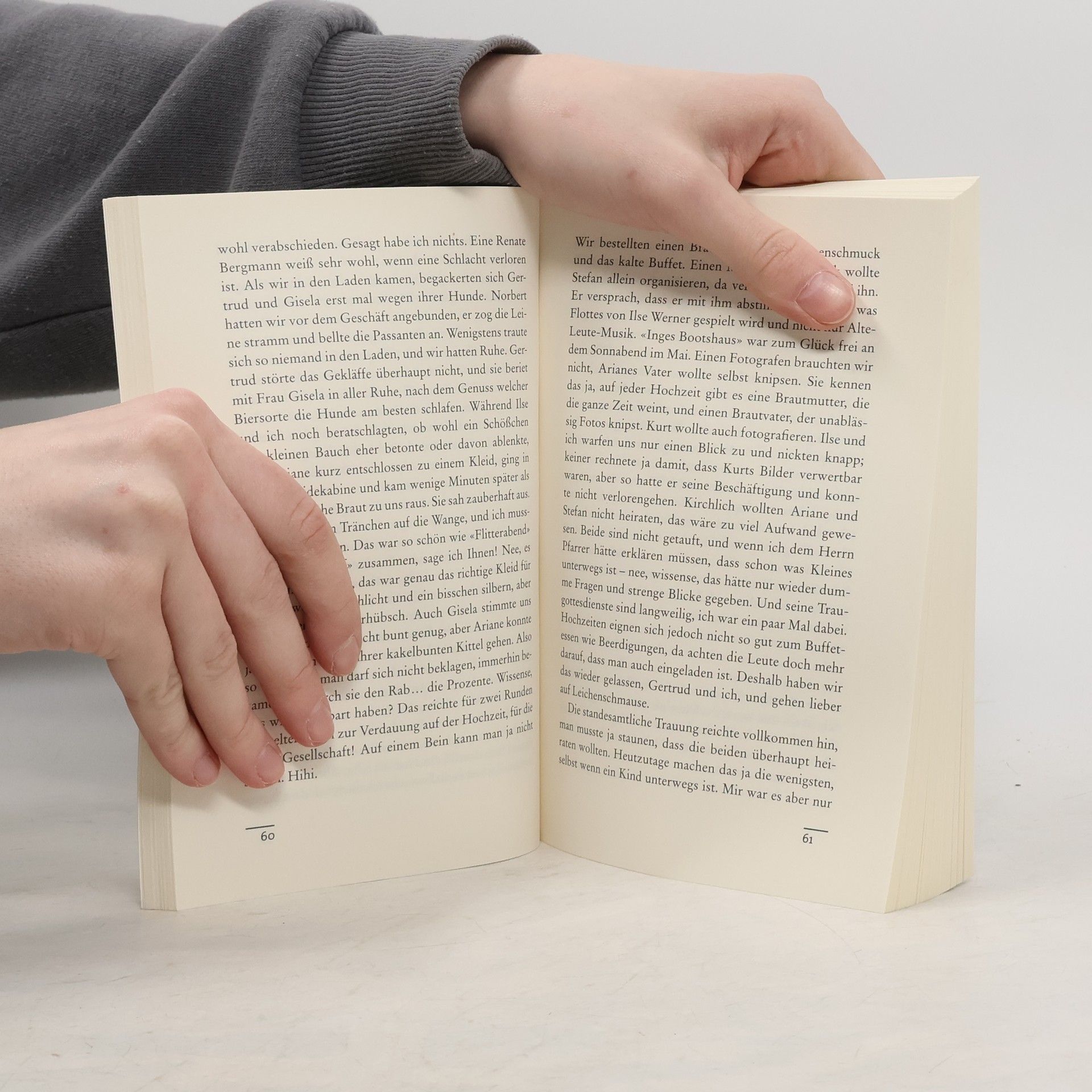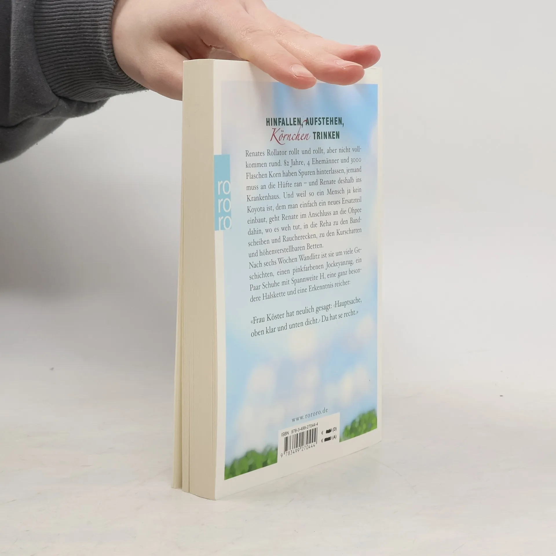 Hinfallen, Aufstehen, Körnchen trinken Renates Rollator rollt und rollt, aber nicht vollkommen rund: 82 Jahre, 4 Ehemänner und 3000 Flaschen Korn haben Spuren hinterlassen, jemand muss an die Hüfte ran – und Renate deshalb ins Krankenhaus. Und weil so ein Mensch ja kein Koyota ist, dem man einfach ein neues Ersatzteil einbaut, geht Renate im Anschluss an die Ohpee dahin, wo es wehtut, zu den Bandscheiben und Raucherecken, zu den Kurschatten und höhenverstellbaren Betten: In die Reha, die sie kurzerhand zur Kur erklärt und rockt. Nach sechs Wochen Wandlitz ist sie um viele Geschichten, einen pinkfarbenen Jockeyanzug, ein paar Schuhe mit Spannweite H, eine ganz besondere Halskette und eine Erkenntnis reicher: «Frau Köster hat neulich gesagt 'Hauptsache, oben klar und unten dicht.'»Da hat se recht.