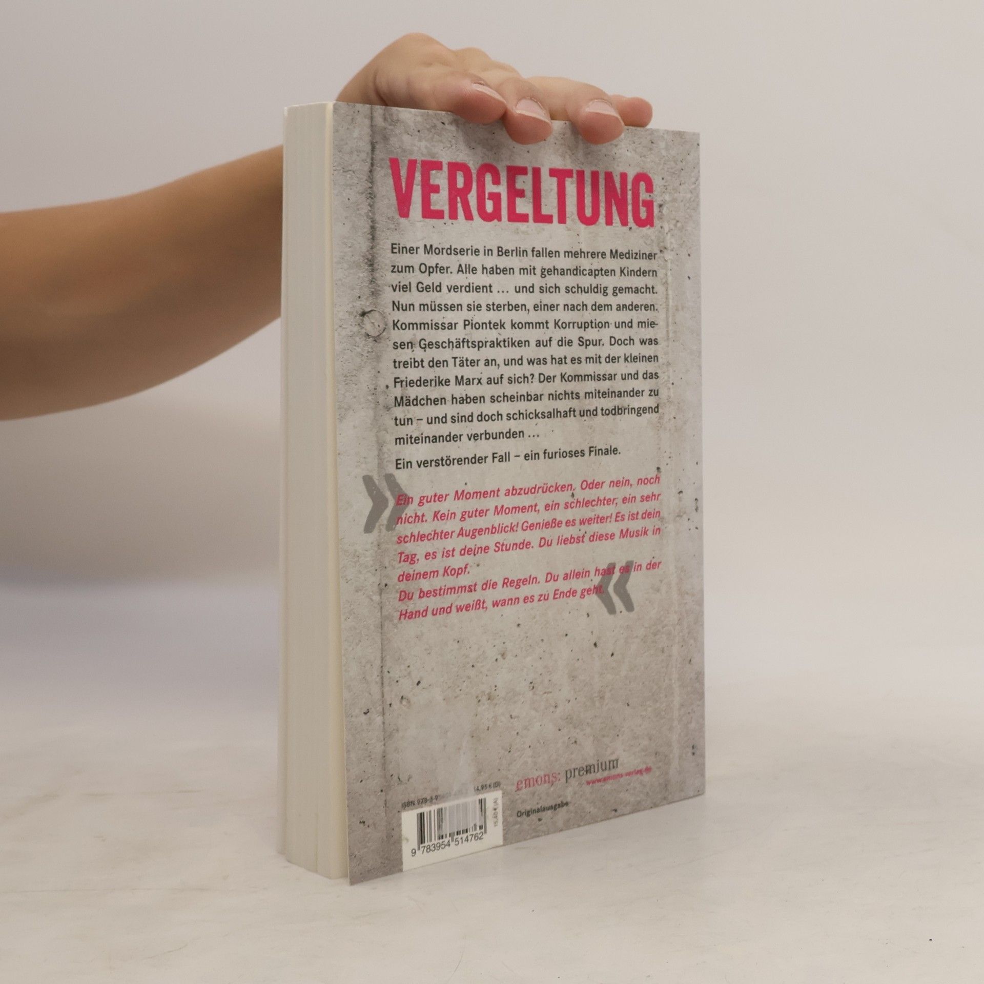 Einer Mordserie in Berlin fallen mehrere Therapeuten und Ärzte zum Opfer. Alle haben mit gehandicapten Kindern viel Geld verdient. und sich schuldig gemacht. Nun müssen sie sterben, einer nach dem anderen. Kommissar Piontek ermittelt und kommt Korruption und miesen Geschäftspraktiken auf die Spur. Doch was treibt den Täter an, und was hat es mit der kleinen Friederike Marx auf sich? Der Kommissar und das Mädchen haben scheinbar nichts miteinander zu tun – und sind doch schicksalhaft und todbringend miteinander verbunden…