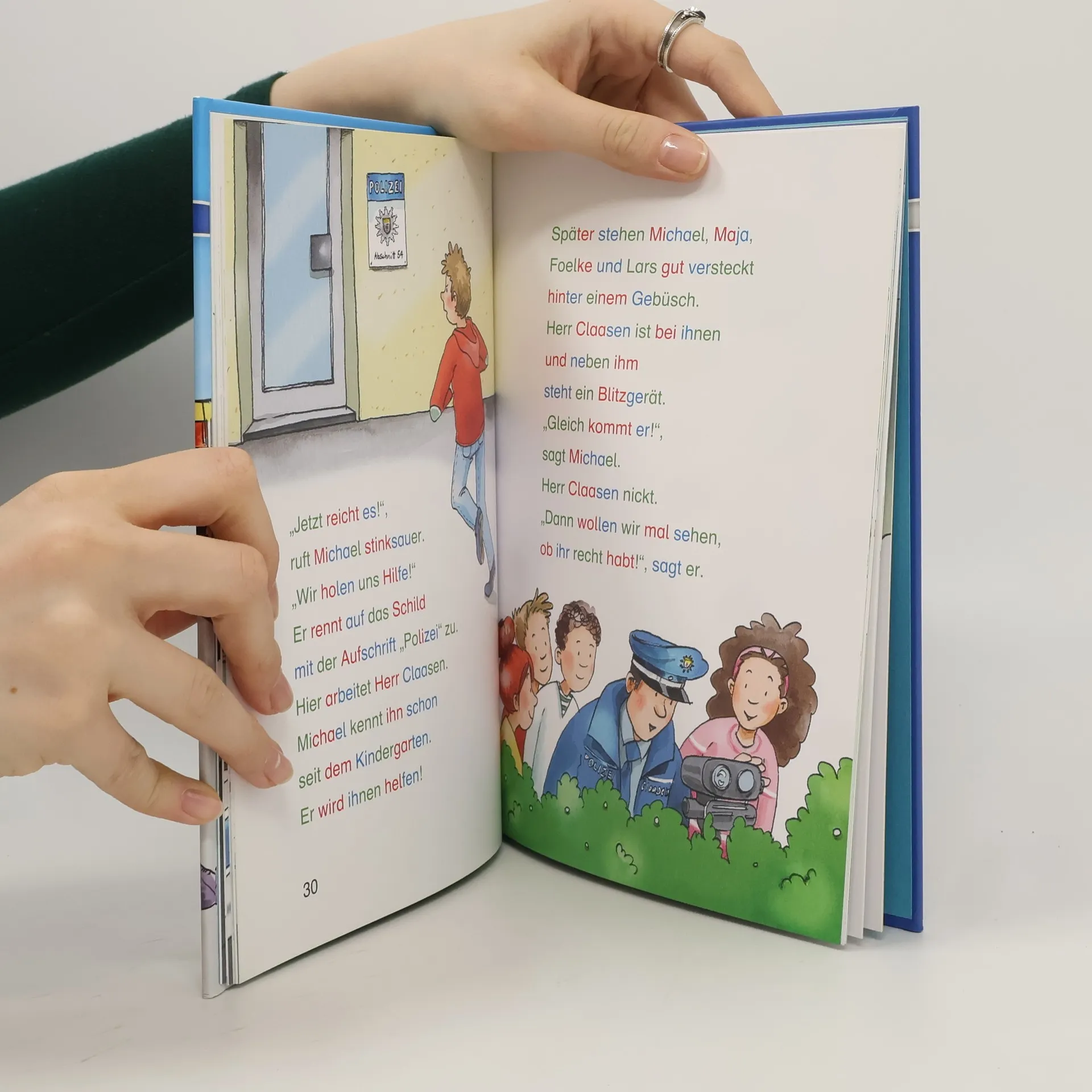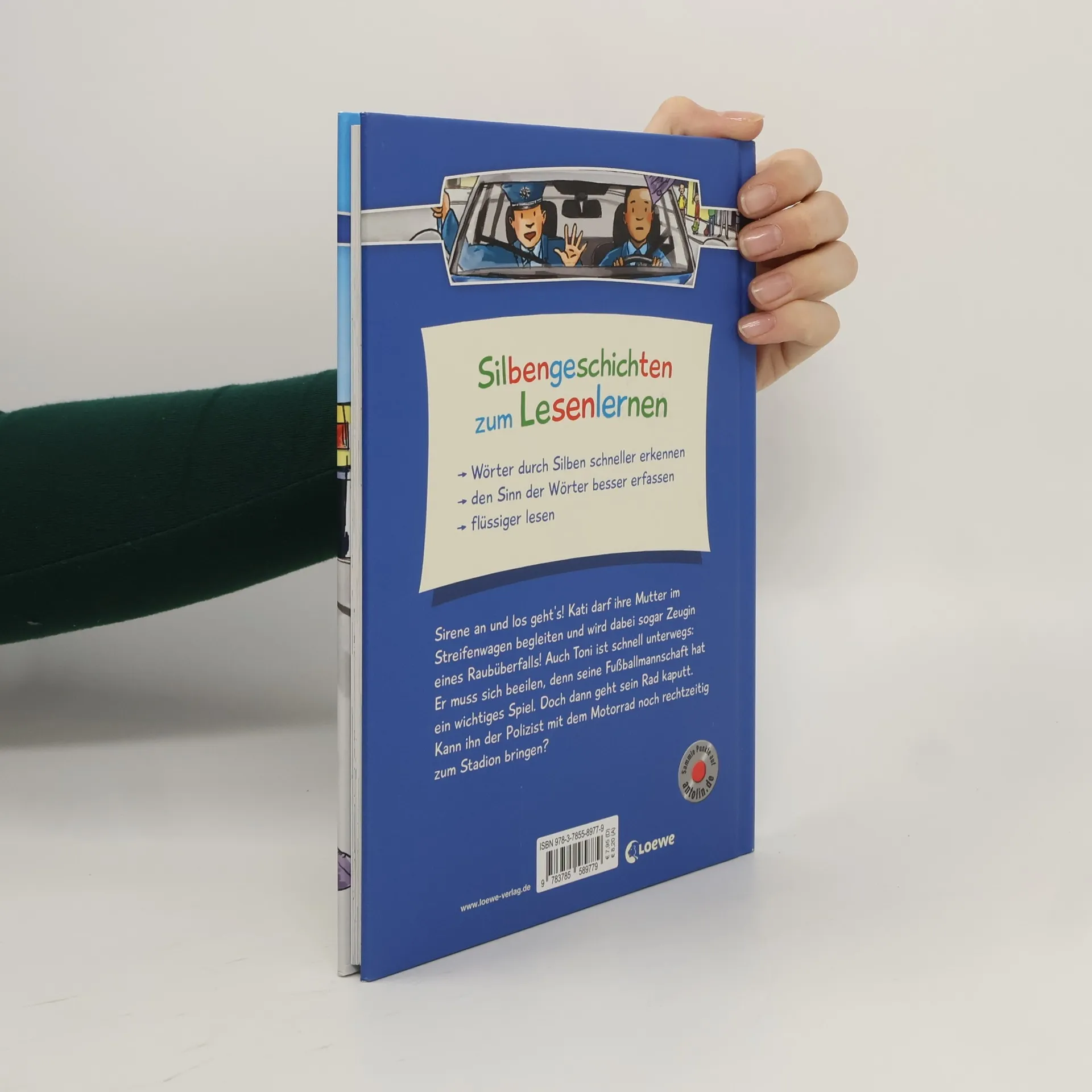 Das Buch ist bei deiner Buchhandlung vor Ort und bei vielen Online-Buchshops erhältlich!+ Bücher, die Kinder gerne lesen wollen + Beliebtes Thema: Polizei + Ausgewogenes Text-Bild-Verhältnis + Große Schrift + Kurze Kapitel + Geeignet zum Vorlesen und ersten Selberlesen + Ideal zum Lesenlernen + Hochwertiges Hardcover + Mit vielen farbigen Illustrationen + Bewährte Qualität + Sirene an und los geht’s! Kati darf ihre Mutter im Streifenwagen begleiten und wird dabei sogar Zeugin eines Raubüberfalls! Auch Toni ist schnell unterwegs: Er muss sich beeilen, denn seine Fußballmannschaft hat ein wichtiges Spiel. Doch dann geht sein Rad kaputt. Kann ihn der Polizist mit dem Motorrad noch rechtzeitig zum Stadion bringen? Mit Silben flüssig lesen lernen! Durch kurze, einfache Sätze in großer Fibelschrift können Kinder ab 7 Jahren (2. Klasse) leicht lesen lernen. Die Silbenmethode unterstützt sie dabei: Die farbige Markierung der einzelnen Silben sorgt für bessere Erkennbarkeit und damit für einen schnelleren Leseerfolg. Diese verbessert nachweislich die Rechtschreibung. Die vielen bunten Bilder in diesem Kinderbuch tragen zusätzlich zum Textverständnis bei. Auch auf Antolin gelistet.