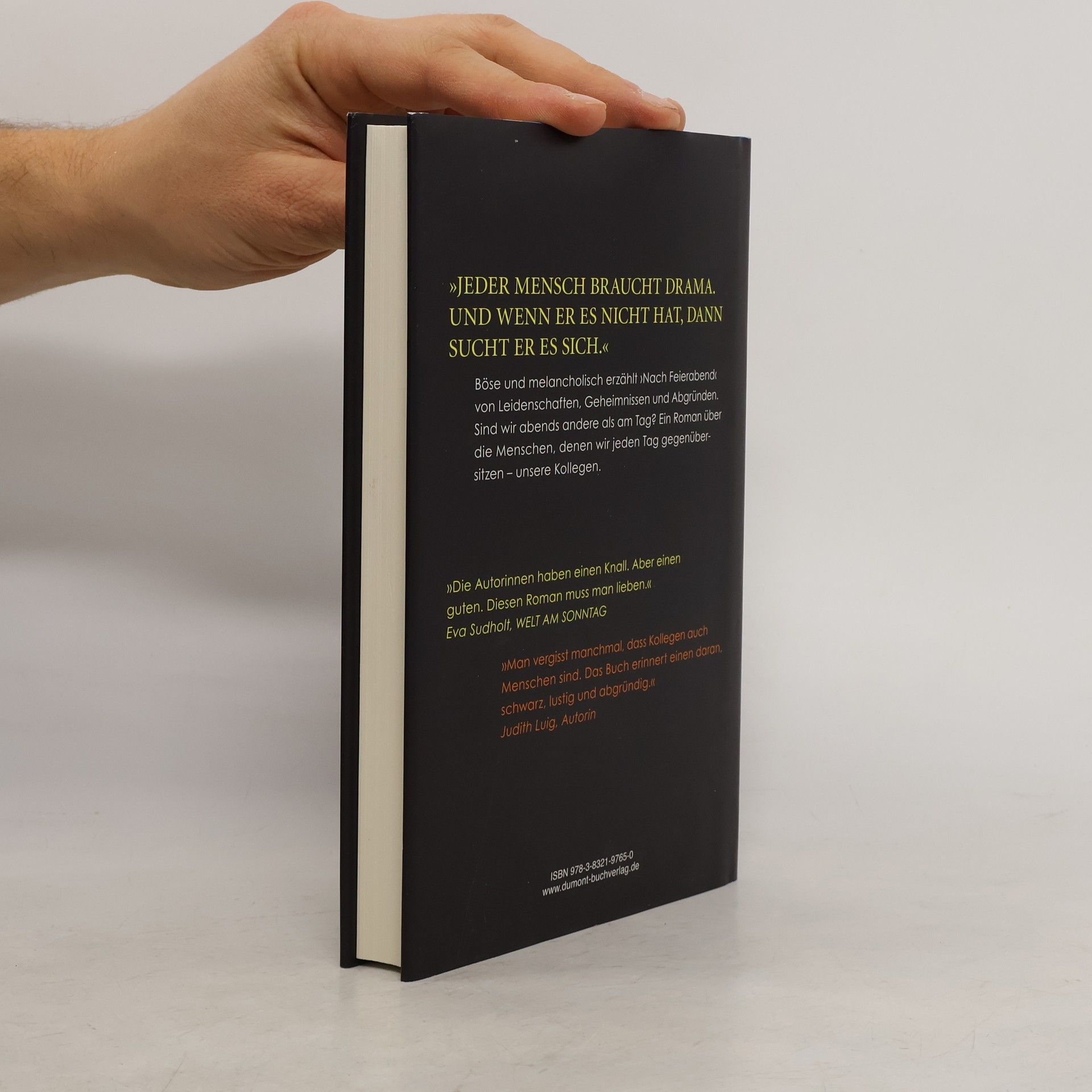Margot Stablo arbeitet im Garten. Sie jätet Unkraut. Warum gibt es dieses verdammte Unkraut?, fragt sie sich und Gott, den einzigen Gesprächspartner, der ihr nach Feierabend geblieben ist. Ida Scheurer und Marie Schlegl tauschen Ausstiegsfantasien aus, heute ist es eine Schweinezucht, bei der man das Aufwachsen der Tiere per Webcam verfolgen kann. Und Frank Staub erzählt eine Anekdote über einen Aquarienfisch, damit er den Moment noch ein wenig hinauszögern kann, in dem er das Zimmer seines sterbenden Sohnes betreten muss. Nach Feierabend begleitet die unterschiedlichsten Menschen auf dem Weg aus ihrem Büro in ihr jeweiliges Leben. Sie alle arbeiten in derselben Firma, haben aber keine Ahnung, wer die Kollegen wirklich sind. Ein Roman über Geheimnisse und Abgründe, über den Unterschied zwischen Arbeits-Ich und Nach-Arbeits-Ich und über die existenziellen Fragen, die sich in dem kleinen Raum dazwischen immer wieder auftun.