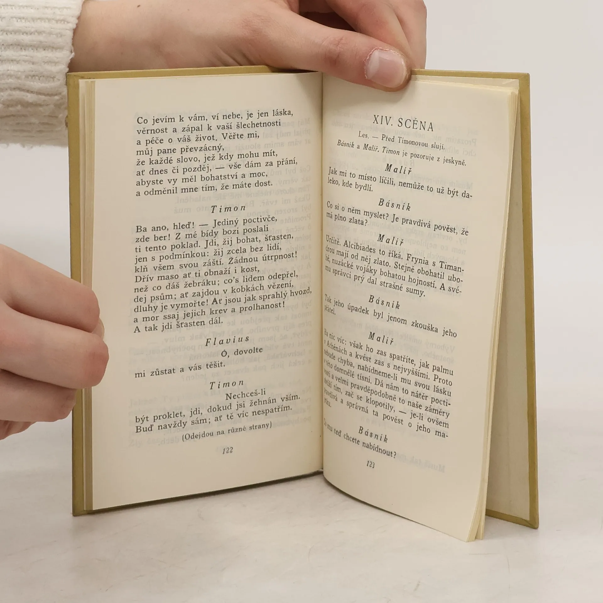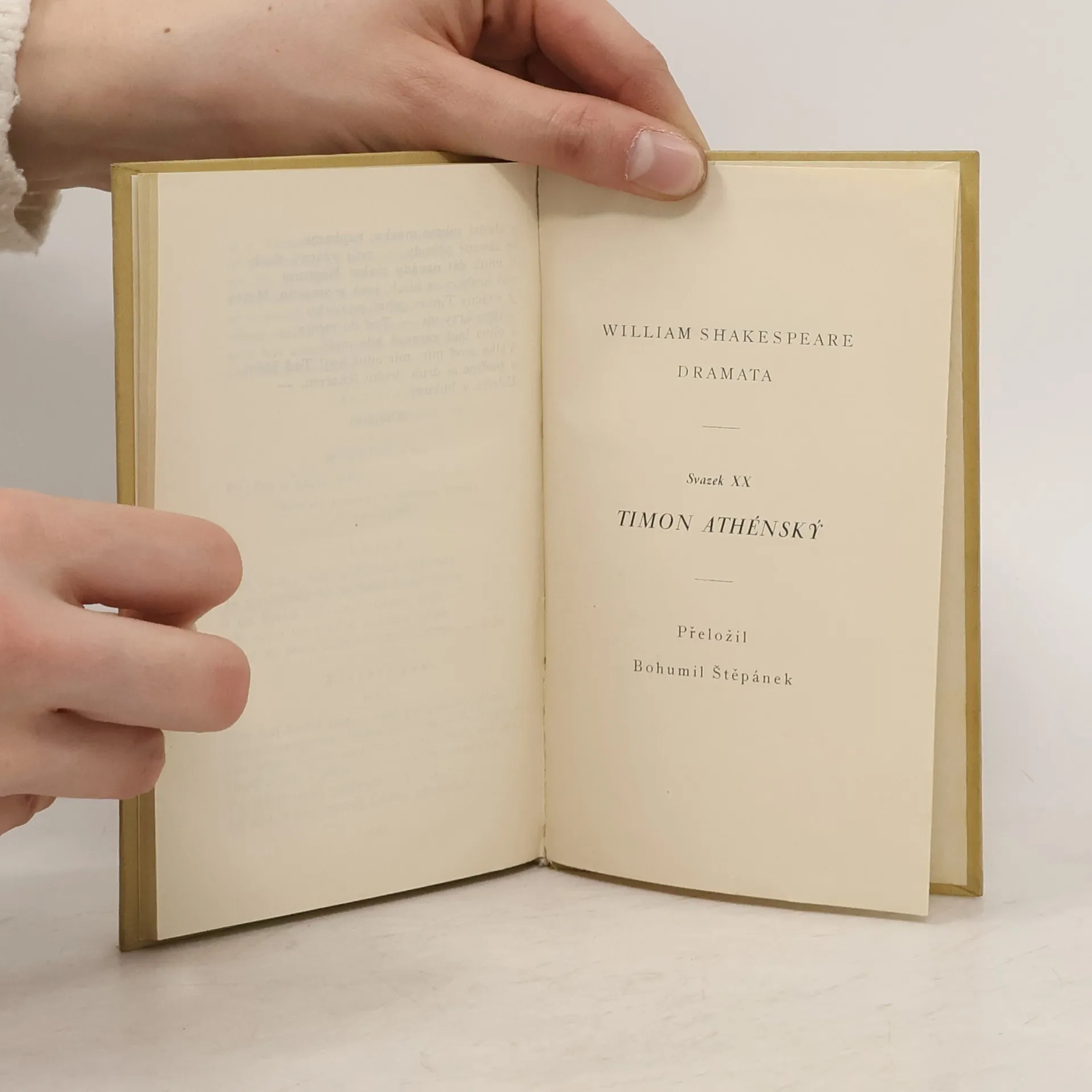 Timon Athenský: tragedie o sedmnácti scénách Timon je rozdavačný dobrák a filantrop, který by se rozdal a pragmatičtí obyvatelé Athén toho patřičně využívají. Nakonec Timon přijde o všechen majetek a zůstanou mu dluhy, pomoc chce najít u svých přátel, kterým daroval. Ti ho však pokaždé odmítnou. Vydal Fr. Borový v úpravě A. Chlebečka a tiskem Jos. B. Zápotočného v Rokycanech 1930. Pantheon. Vzorná vydání spisovatelů domácích i cizích. Kniha 79.