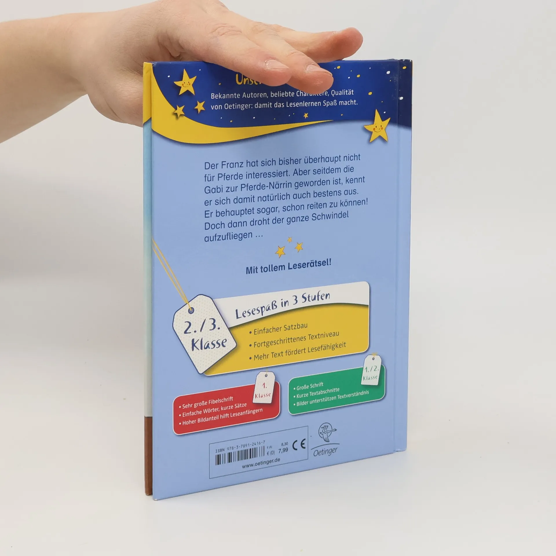 Aus Liebe zur Gabi wird der Franz zum Pferdenarr ... Der Franz hat mal wieder Probleme: Seit neuestem schwärmt die Gabi für Pferde, steckt nur noch mit ihrer Freundin Sandra zusammen und kümmert sich nicht mehr um den Franz. Aus Eifersucht erzählt der Franz der Gabi, dass er reiten kann und trumpft mit Fachwissen aus einem alten Pferdebuch seiner Mutter auf. Doch dann droht der ganze Schwindel aufzufliegen: Ein Freund von Gabis Vater eröffnet in Kürze einen Reiterhof, auf dem die Kinder kostenlose Reitstunden nehmen können ... Lustig, frech und typisch Franz! Die Fortsetzung der absoluten Long- und Bestsellerserie für Erstleser. Lesen lernen mit „Büchersterne“ für die 2./3. Klasse: einfacher Satzbau, fortgeschrittenes Textniveau und ein höherer Textanteil, der die Lesefähigkeit geübter Leseanfänger fördert. Dazu ein Leserätsel im Anhang.