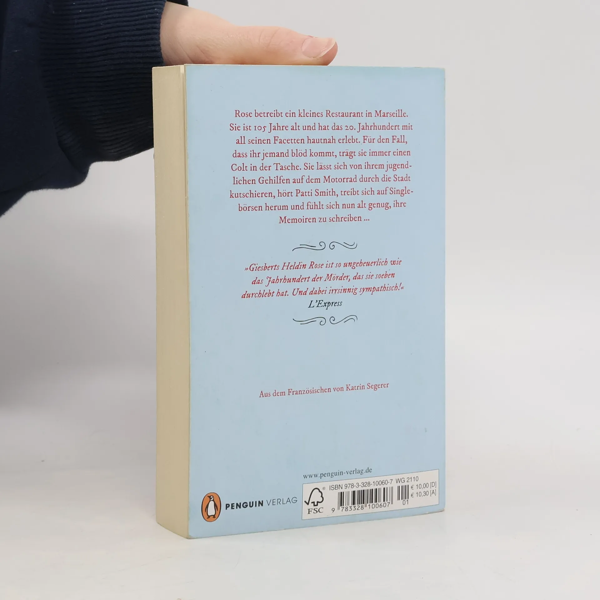 Rose ist eine begnadete Köchin und betreibt ein kleines Restaurant in Marseille. Sie ist 105 Jahre alt und hat das 20. Jahrhundert mit all seinen Abgründen hautnah erlebt. Deshalb hat sie vor nichts und niemandem mehr Angst. Sie glaubt an die Kraft der Liebe, des Lachens und der Vergeltung. Für den Fall, dass ihr einer blöd kommt, trägt sie deshalb immer einen Colt in der Tasche. Sie lässt sich von ihrem jugendlichen Gehilfen auf dem Motorrad durch die Stadt kutschieren, hört Patti Smith, treibt sich auf Singlebörsen im Internet herum und fühlt sich nun endlich alt genug, ihre Memoiren zu schreiben …