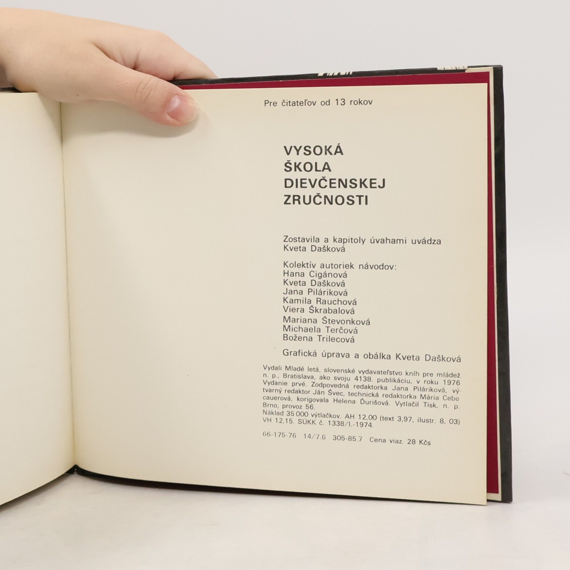 Kniha návodov. Nenájdeš tu návod na to, ako si ušiť módnu sukňu či upliesť šál. Nájdeš tu však mnohé iné námety a podnety pre prácu doma i v krúžku, v oddiele. Ak chceš niečo urobiť, nemusíš sa prísne držať nášho receptu - rozmýšľaj, prispôsobuj, dotváraj. Naša kniha ráta s tým, že s ihlou, nožnicami, ihlicami a háčikom už vieš narábať. No nielen to. Predpokládá, že sa nebojíš ani netradičných dievčenských nástrojov - nožíka, pílky, klieští, pilníka, nebožieca. A napokon už iba jednu radu: buď trpezlivá a vytrvalá, začínaj s menšími, jednoduchšími námetmi. Až keď si osvojíš techniku práce, zžiješ sa s materiálom, pusť sa do väčších výrobkov. Pre čitateľov od 13 rokov. Zostavila a úvahami uvádza Kveta Dašková.