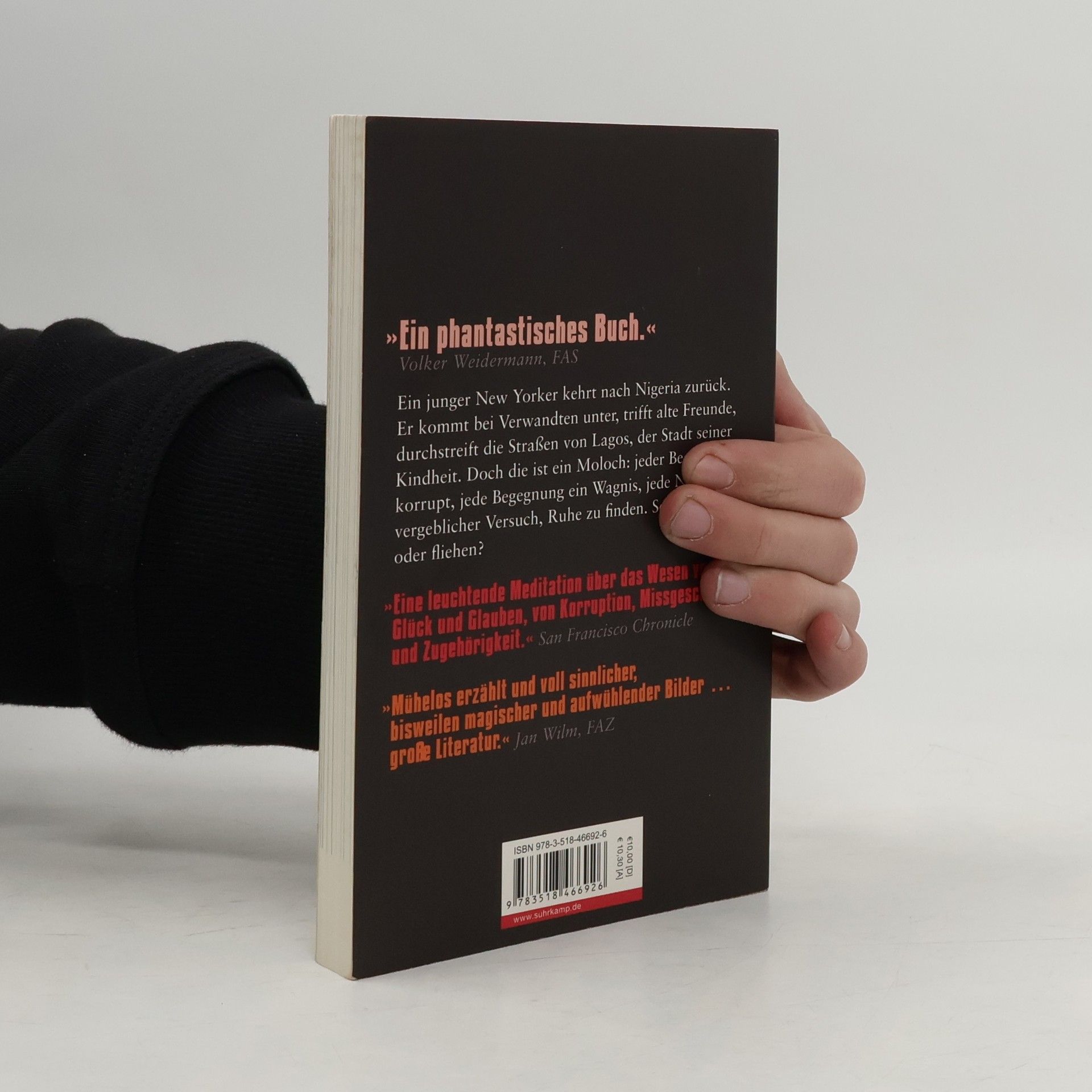 Ein junger New Yorker mit nigerianischen Wurzeln kehrt nach Nigeria zurück. Er wohnt in Lagos bei Verwandten, trifft alte Freunde, durchstreift die Straßen der Stadt seiner Kindheit. Doch die ist ein Moloch: jeder Beamte korrupt, jede Begegnung ein Wagnis, jede Nacht ein vergeblicher Versuch, Ruhe zu finden. Und jeder Tag ein Spiegel, in dem er sich selbst immer klarer sieht. Er erlebt die Stadt wie eine große, schrecklich enttäuschende Liebe. Soll er bleiben oder fliehen? »Ein phantastisches Buch … Memoir, Reportage, Selbstbetrachtung, Literaturgeschichte. Ein Bericht auch über die Schule der Gewalt, über die Ursprünge der Massenmorde von Boko Haram im Norden Nigerias.« Volker Weidermann, FAS »Ein lebenspralles Buch von der Verzweiflung eines Nigerianers über seine Heimat, die ihn zugleich anzieht und abstösst.« Regula Freuler, NZZ »Mühelos erzählt und voll sinnlicher, bisweilen magischer und aufwühlender Bilder … große Literatur.« Jan Wilm, FAZ