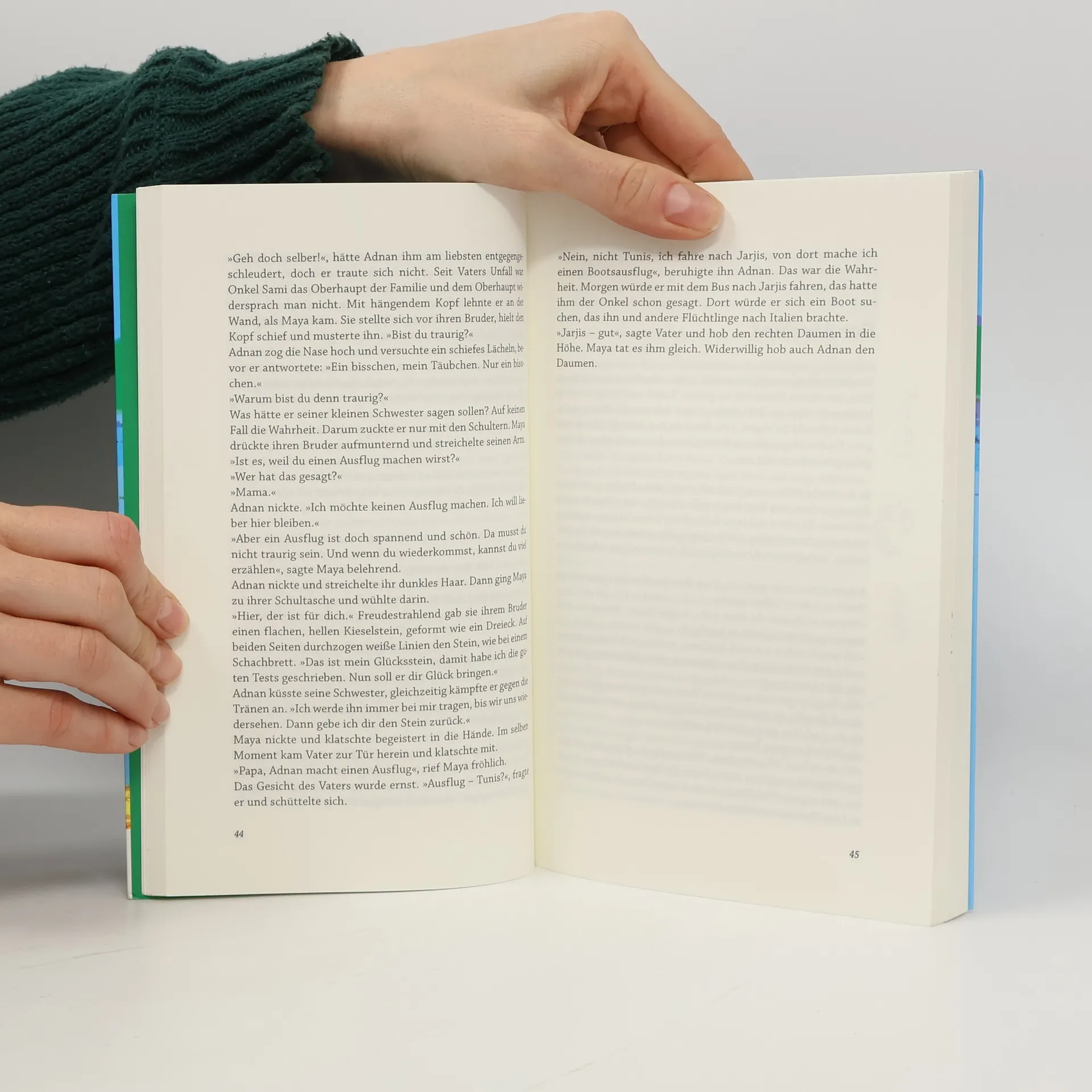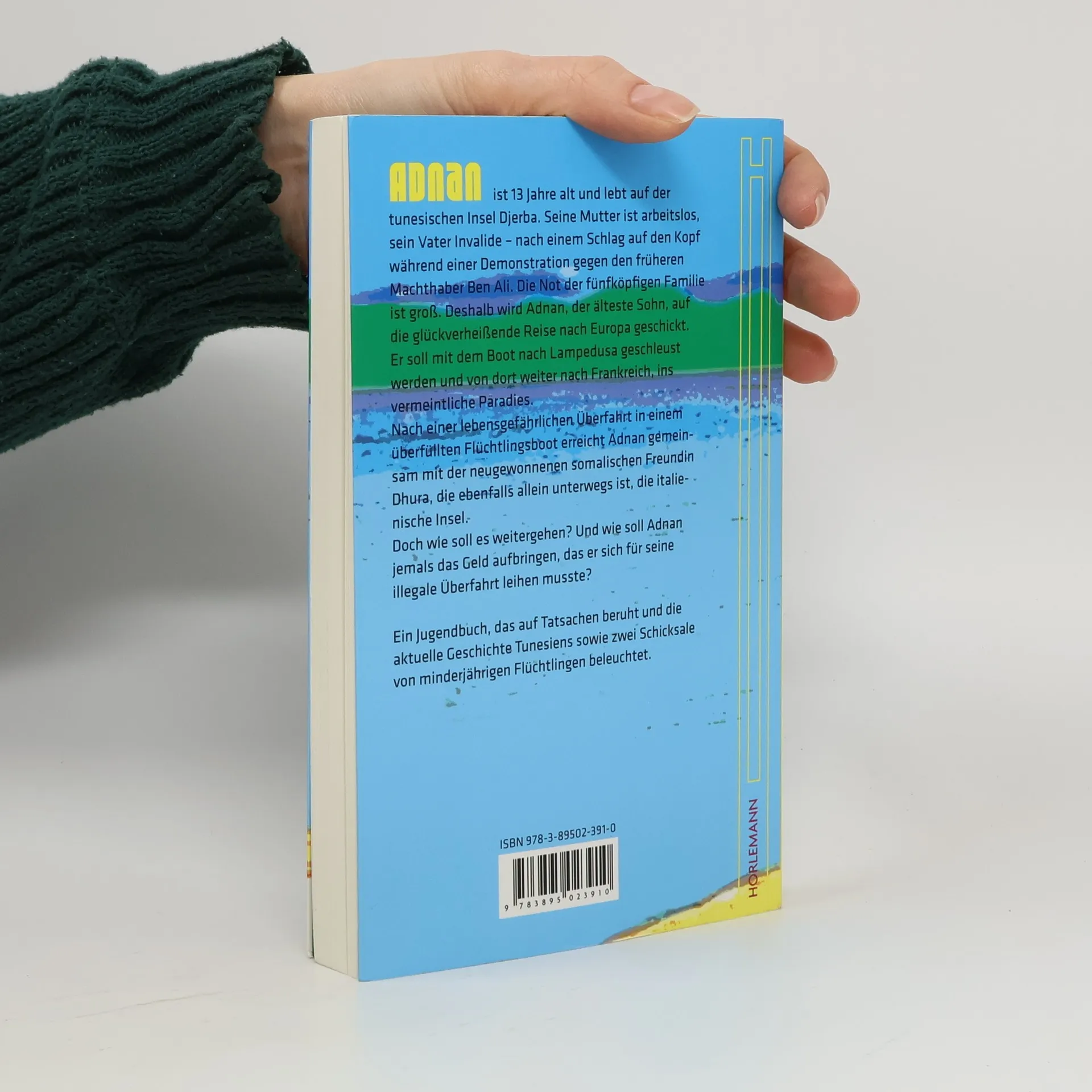 Adnan ist 13 Jahre alt und lebt auf der tunesischen Insel Djerba. Seine Mutter ist arbeitslos, sein Vater nach einem Schlag auf den Kopf während einer Demonstration gegen den früheren Machthaber Ben Ali Invalide. Die Not der vierköpfigen Familie ist groß. Deshalb wird Adnan, der älteste Sohn, auf die glückverheißende Reise nach Europa geschickt. Er soll mit dem Boot nach Lampedusa geschleust werden und von dort weiter nach Frankreich, ins vermeintliche Paradies. Nach einer lebensgefährlichen Überfahrt in einem überfüllten Flüchtlingsboot erreicht Adnan gemeinsam mit der neugewonnenen somalischen Freundin Dhura, die ebenfalls allein unterwegs ist, die italienische Insel und später Deutschland. Dort wird es einen Neuanfang für ihn geben. Das neue Jugendbuch von Iris Lemanczyk beruht auf Tatsachen und beleuchtet die aktuelle Geschichte Tunesiens sowie zwei Schicksale von minderjährigen Flüchtlingen.