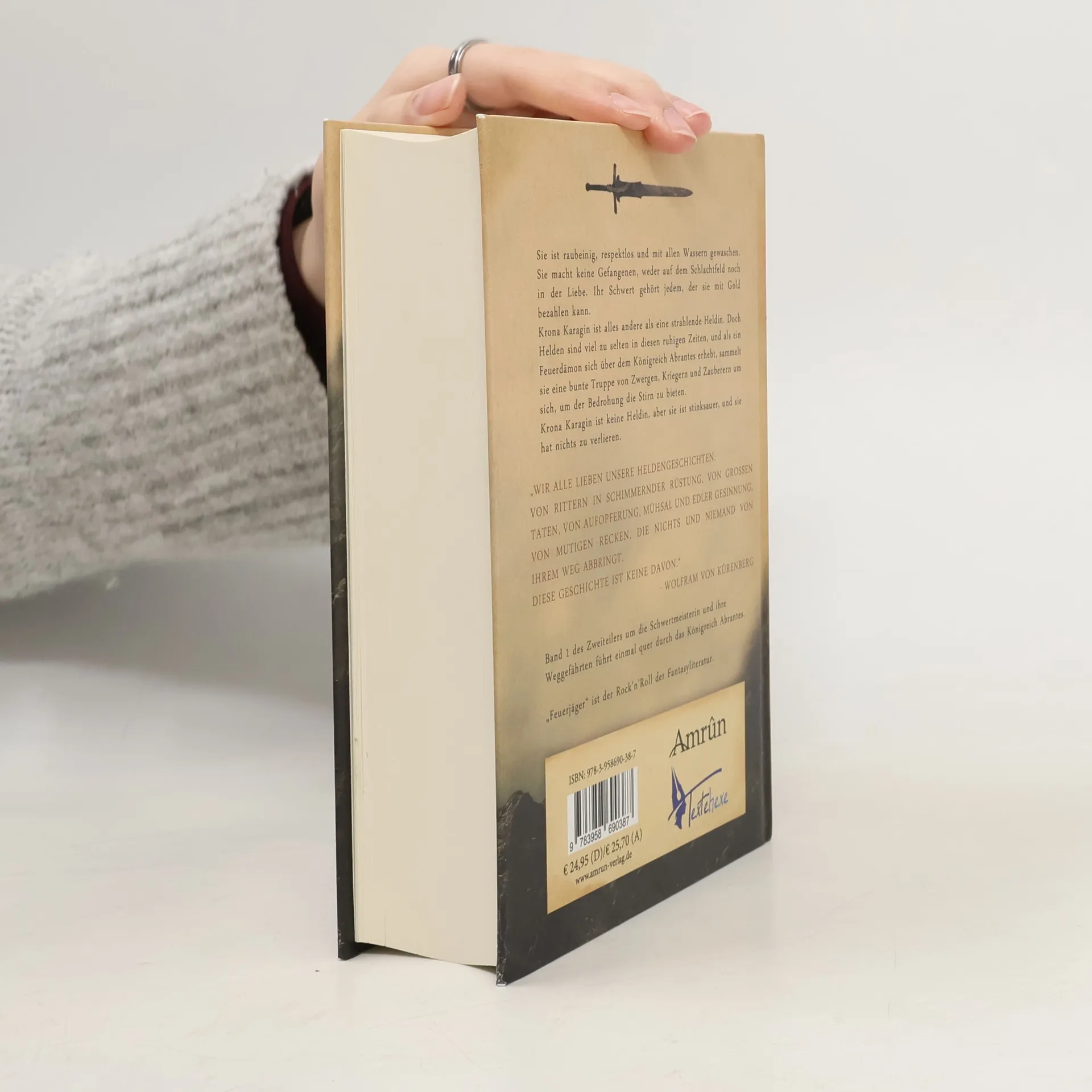 Sie ist raubeinig, respektlos und mit allen Wassern gewaschen. Sie macht keine Gefangenen, weder auf dem Schlachtfeld noch in der Liebe. Ihr Schwert gehört jedem, der sie mit Gold bezahlen kann. Krona Karagin ist alles andere als eine strahlende Heldin. Doch Helden sind viel zu selten in diesen ruhigen Zeiten, und als ein Feuerdämon sich über dem Königreich Abrantes erhebt, sammelt sie eine bunte Truppe von Zwergen, Kriegern und Zauberern um sich, um der Bedrohung die Stirn zu bieten. Krona Karagin ist keine Heldin, aber sie ist stinksauer, und sie hat nichts zu verlieren. „Wir alle lieben unsere Heldengeschichten: von Rittern in schimmernder Rüstung, von großen Taten, von Aufopferung, Mühsal und edler Gesinnung, von mutigen Recken, die nichts und niemand von ihrem Weg abbringt. Diese Geschichte ist keine davon.“ Wolfram von Kürenberg Band 1 des Zweiteilers um die Schwertmeisterin und ihre Weggefährten führt einmal quer durch das Königreich Abrantes. „Feuerjäger“ ist der Rock’n’Roll der Fantasyliteratur.