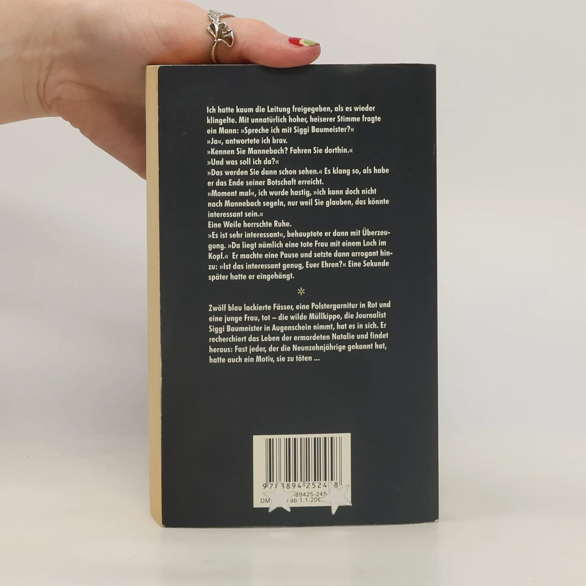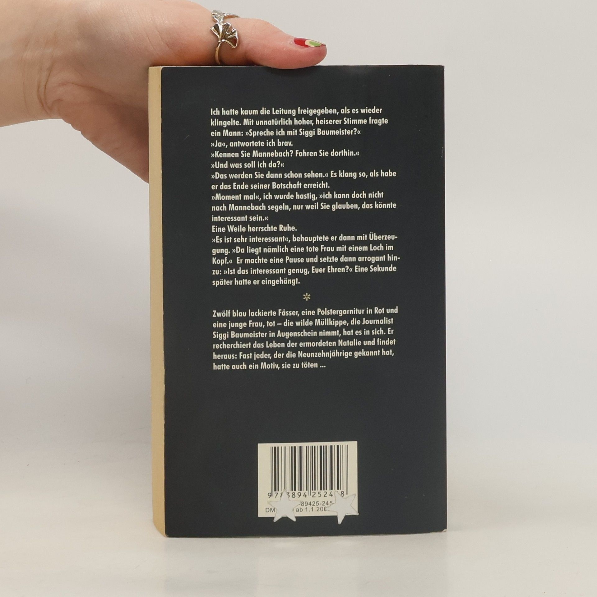 Zwölf blau lackierte Fässer, eine Polstergarnitur in Rot und eine junge Frau, tot – die wilde Müllkippe, die Journalist Siggi Baumeister in Augenschein nimmt, hat es in sich. Er recherchiert das Leben der ermordeten Natalie und findet heraus: Fast jeder, der die Neunzehnjährige gekannt hat, hatte auch ein Motiv, sie zu töten.