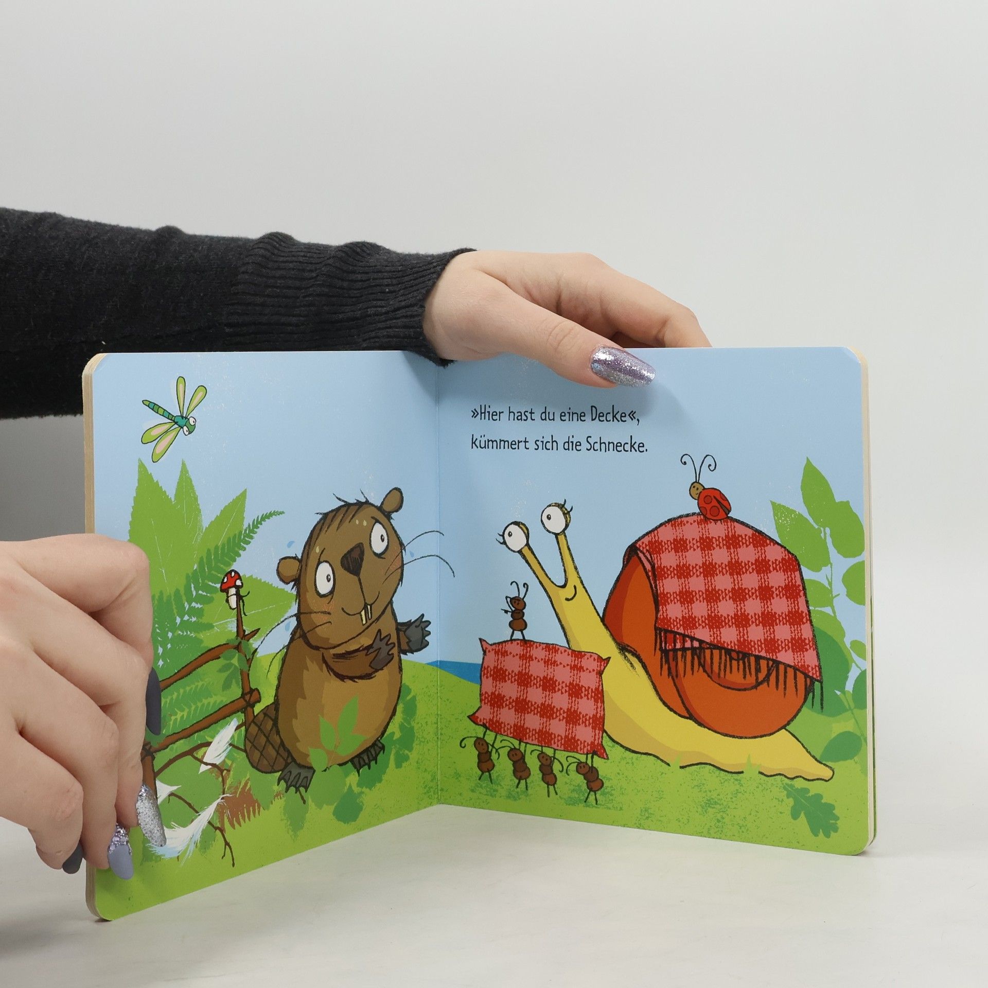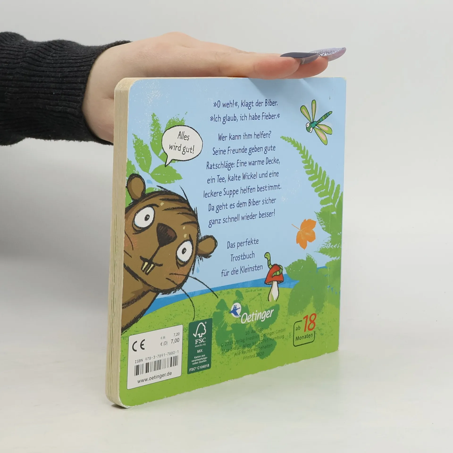 Wer hilft dem kleinen Biber? „O weh“, klagt der Biber. „Ich glaub, ich habe Fieber!“ Sofort wollen ihm alle seine Freunde helfen. Das Frettchen schickt ihn ins Bettchen, die Schnecke gibt ihm eine Decke, das Karnickel liefert kalte Wickel und die ganze Truppe kocht ihm eine warme Suppe! Da kann man doch nur gesund werden! Detailreich und kindgerecht illustriertes Pappbilderbuch für Kinder ab 18 Monaten. Lebendig erzählt mit hinreißend lustigen Reime zum Mitsprechen und Mitfühlen. Fördert Empathie und Fürsorge , indem Kindern auf spielerische Weise gezeigt wird, wie wichtig es ist, füreinander da zu sein und sich gegenseitig zu unterstützen. Ideal geeignet für kranke Tage - bietet Kindern Trost und Ablenkung und erinnert sie daran, dass Pflege und Liebe helfen können, schneller gesund zu werden.