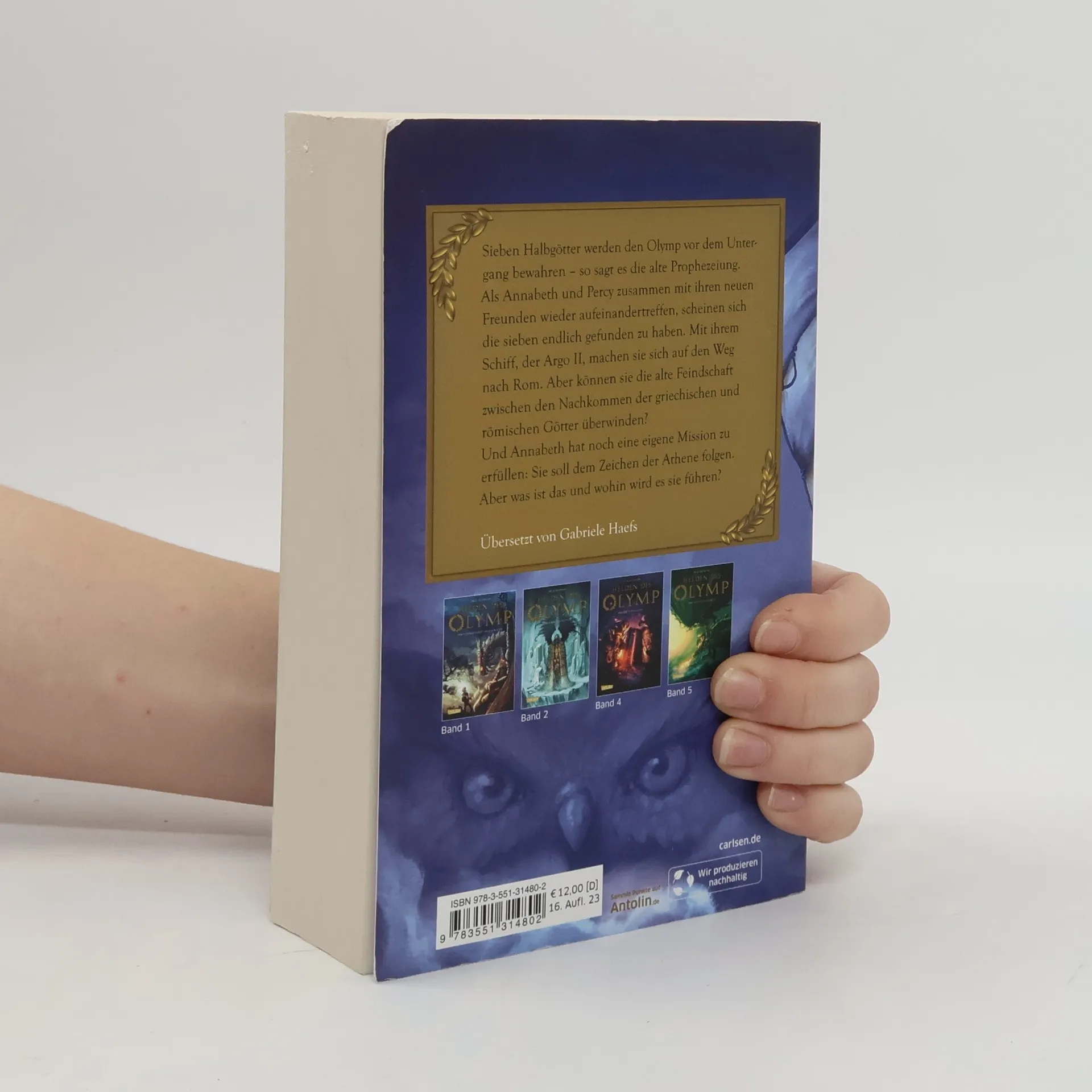 Mit einem magischen Schiff ins alte Rom: Die Mission der legendären Sieben beginnt! Sieben Halbgötter werden den Olymp vor dem Untergang bewahren – so sagt es die alte Prophezeiung. Als Annabeth und Percy zusammen mit ihren neuen Freunden wieder aufeinandertreffen, scheinen sich diese sieben endlich gefunden zu haben. Gemeinsam machen sie sich auf den Weg nach Rom, um ihren Auftrag zu erfüllen. Doch die alte Feindschaft zwischen den Nachkommen der griechischen und römischen Götter keimt immer wieder auf. Helden des Olymp: die Fortsetzung der Jugendbuch-Bestsellerserie ‘Percy Jackson’ Nachdem Jason ohne Erinnerung auf einer Klassenfahrt aufwacht, überschlagen sich die Ereignisse: Als Sohn des Jupiter zählt er zu den sieben legendären Halbgöttern, die den Olymp gegen die Urgöttin Gaia und ihre Gefolgschaft verteidigen sollen. Doch nur, wenn sich die römischen und die griechischen Halbgötter zusammenschließen können sie den Kampf gegen Gaia aufnehmen. „Helden des Olymp“ ist eine fünfteilige Fantasy-Buchreihe rund um die jugendlichen Halbgötter Jason, Piper, Leo, Percy, Annabeth, Hazel und Frank. Der spannende Mix aus Action, Witz und Mythologie begeistert Jung und Alt. ***Griechische Götter in der Gegenwart: actionreich, wild und urkomisch – für Leser*innen ab 12 Jahren und für alle Fans der griechisch-römischen Mythologie***