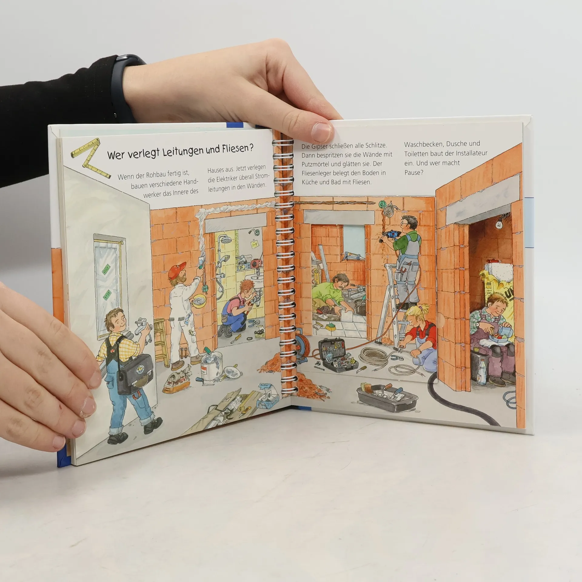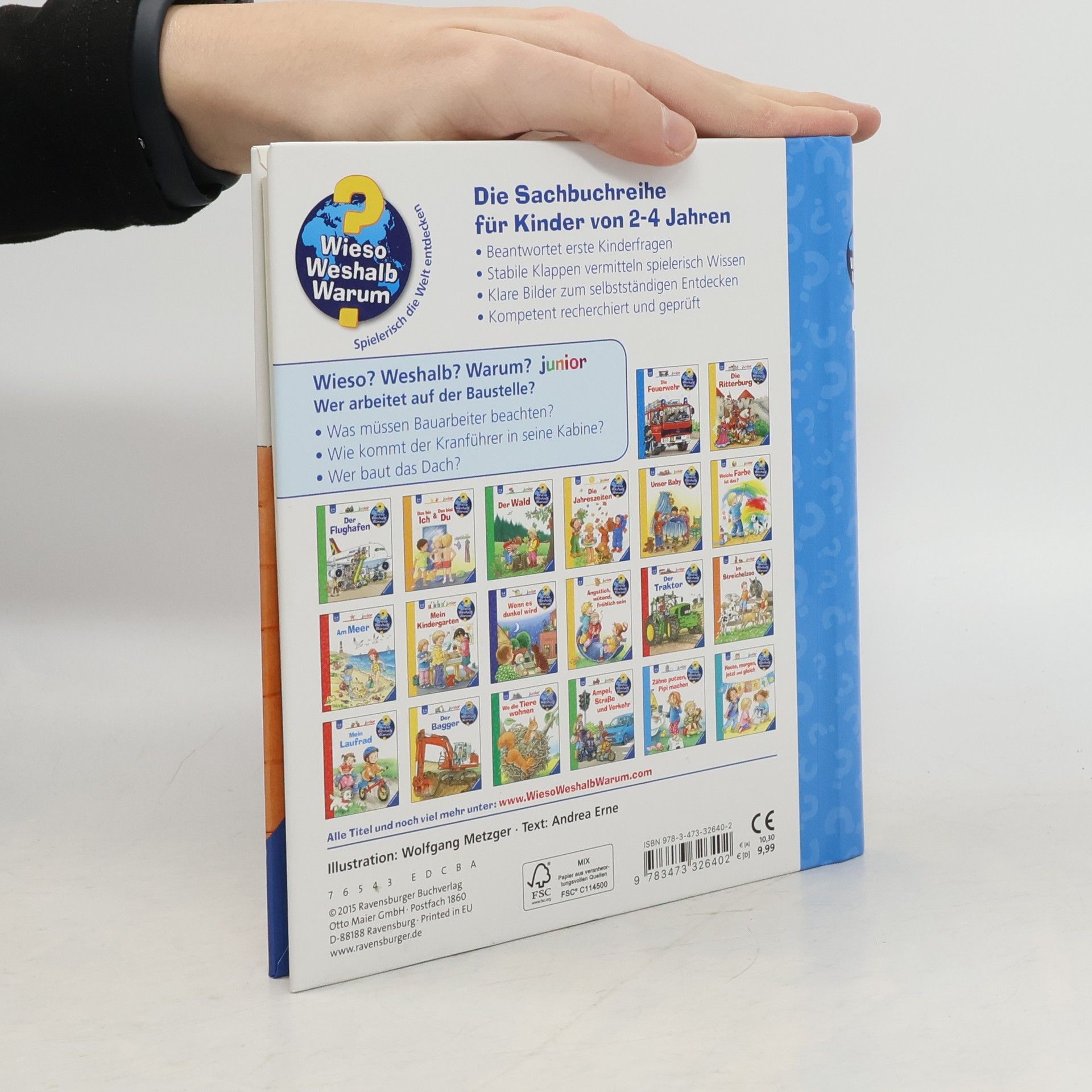 In diesem Buch entdecken Kinder die Welt der Handwerker: Baggerfahrer, Maurer, Zimmerleute, Dachdecker, Elektriker, Gipser, Maler, Fliesenleger und Heizungsmonteure. Am Neubau eines Hauses erfahren sie, wer beteiligt ist und in welcher Reihenfolge die Arbeiten erfolgen. Es wird gezeigt, welche Werkzeuge, Maschinen und Fahrzeuge zum Einsatz kommen. Mit Klappen können die Kinder den Bagger steuern, dem Kranführer helfen oder die Mischmaschine bedienen, wodurch alle Fragen beantwortet werden. Ideal für Baustellenfans und als Vorbereitung auf einen Umzug. Die Sachbuchreihe für Kinder von 2-4 Jahren, Wieso? Weshalb? Warum? junior, beantwortet neugierige Fragen aus dem Alltag. Themen wie die Feuerwehr, das Verhalten von Tieren im Winter oder die Notwendigkeit des Zähneputzens werden altersgerecht und detailverliebt beleuchtet. Die Reihe ist auf kleine Hände und die Bedürfnisse der Kleinsten abgestimmt. Klare, liebevolle Bilder, kurze Sachtexte und handliche Klappen veranschaulichen Bewegungen und bieten überraschende Einblicke. Dies ermöglicht es den Kindern, eigenständig zu entdecken. Der Spaß am Entdecken, die liebevolle Gestaltung und die hochwertige Ausstattung sorgen für anhaltende Freude an jedem Buch.