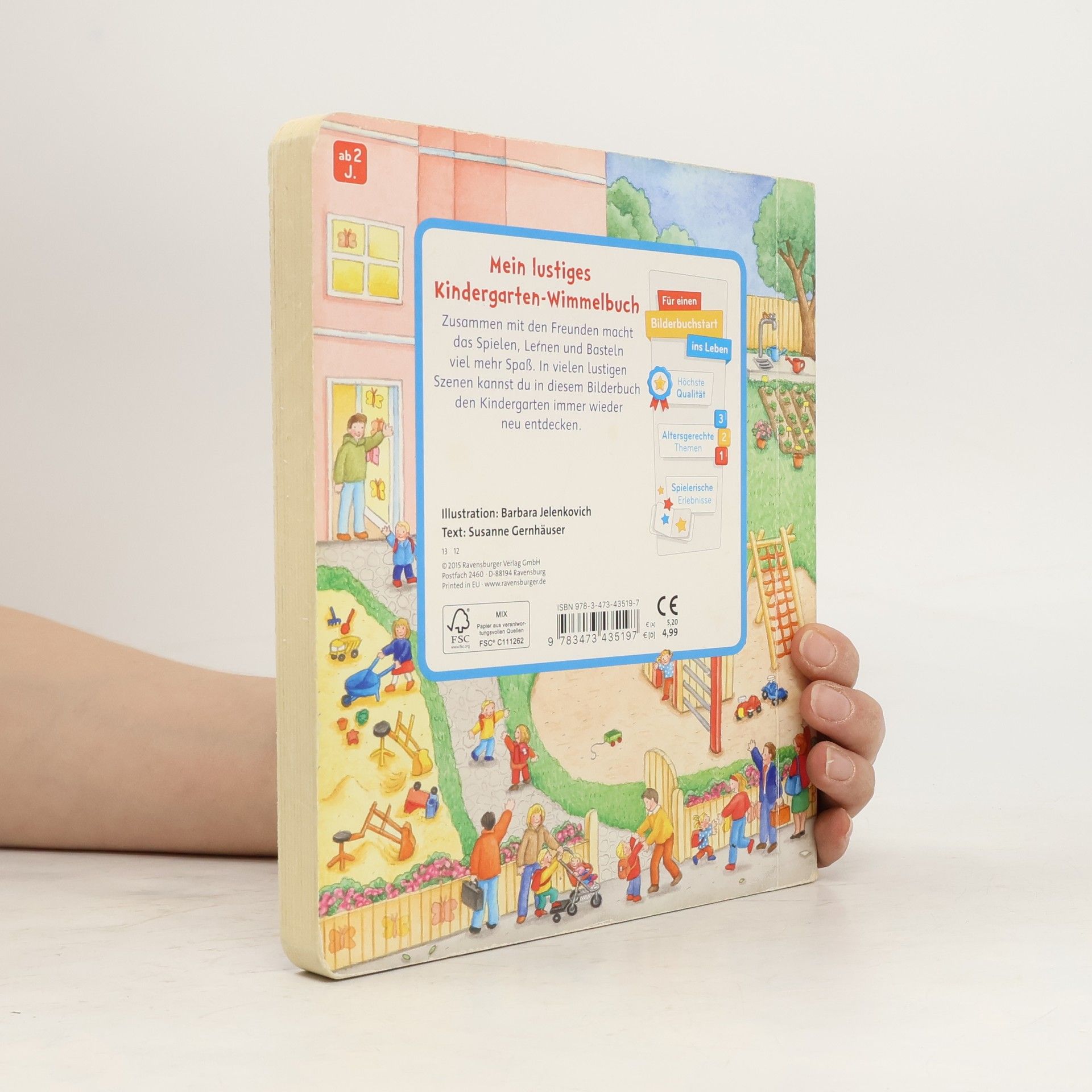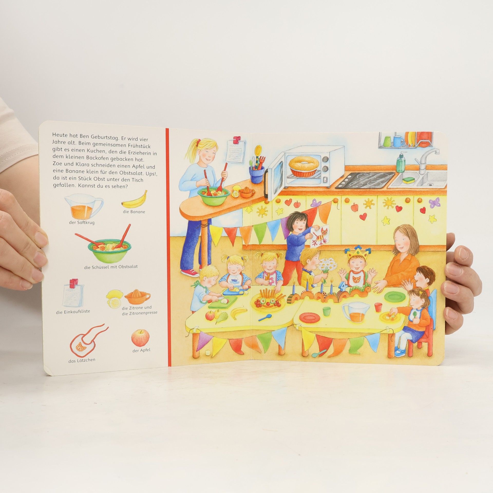 Willkommen im Kindergarten! Auf elf farbenfrohen, realitätsnahen Illustrationen werden alle Fragen zum Thema Kindergarten beantwortet. Ob drinnen oder draußen: hier macht das Spielen mit den kleinen Freunden Spaß. Es gibt eine Kinderküche, einen Waschraum, einen Turnraum und natürlich Spiel- und Kuschelecken. Die kurzen Texte beinhalten auf jeder Seite einen leichten Suchauftrag, der dazu motiviert die kleinen Bilder in den großen Schauseiten zu suchen und zu benennen. Das schult die Konzentrationsfähigkeit und fördert den Spracherwerb. Schon in der Garderobe wird klar: In diesem Kindergarten kommen alle Kinder gerne an. Die kleinen Freunde werden begrüßt und helfen sich gegenseitig. Es geht weiter in die Gemeinschaftsräume zum Spielen, Basteln, Singen und Turnen. Natürlich gibt es auch eine Kuschel- und Vorleseecke. Und der Waschraum hat extra kleine Waschbecken und niedrige Kindertoiletten. Da macht das Händewaschen Spaß! Auf einer weiteren Seite wird Geburtstag gefeiert, zusammen musiziert und auch geturnt. Natürlich gehen die Kinder zusammen nach draußen: Im Garten kann getobt, gebuddelt und geklettert werden. Ein umfangreiches Themenbuch, ideal als Einstiegshilfe in den Kindergartenalltag. Einfache Texte mit kleinen Suchaufträgen regen dazu an, die Bildervignetten auf der rechten Seite im großen Bild zu suchen und wiederzuentdecken.