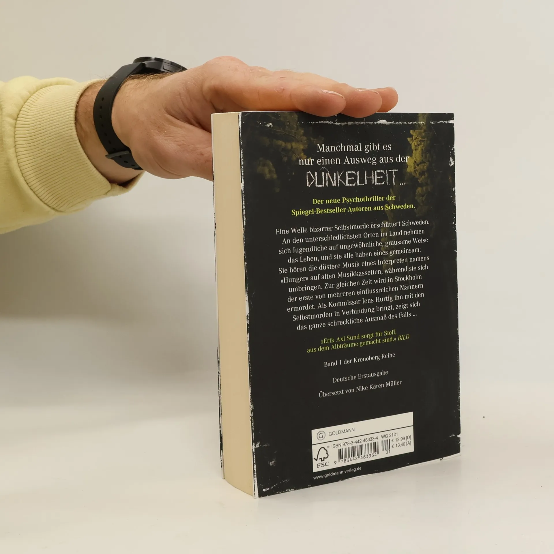 Der erste, in sich abgeschlossene Band der neuen Kronoberg-Reihe. Eine Welle bizarrer Selbstmorde erschüttert Schweden. An den unterschiedlichsten Orten im Land nehmen sich Jugendliche auf ungewöhnliche, grausame Weise das Leben, und sie alle haben eines gemeinsam: Sie hören die düstere Musik eines Interpreten namens „Hunger“ auf alten Musikkassetten, während sie sich umbringen. Zur gleichen Zeit wird in Stockholm der erste von mehreren einflussreichen Männern ermordet. Als Kommissar Jens Hurtig ihn mit den Selbstmorden in Verbindung bringt, zeigt sich das ganze schreckliche Ausmaß des Falls ... Ausstattung: eingelegtes Lesezeichen