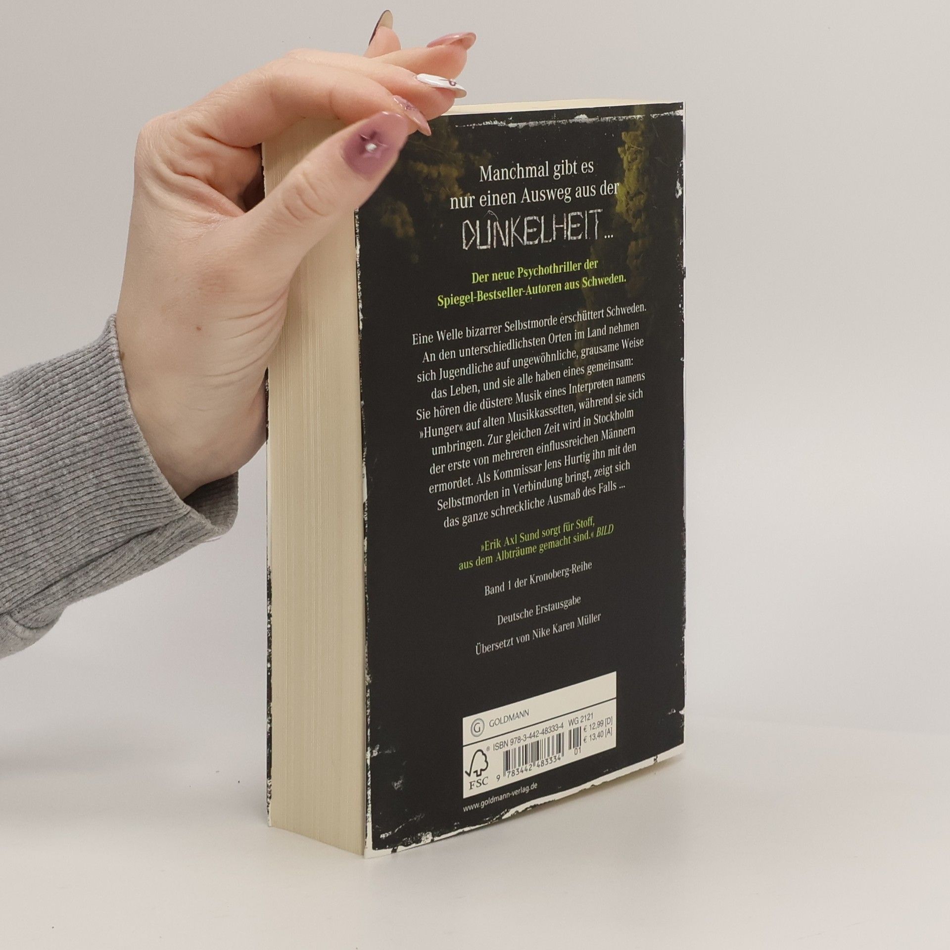 Der erste, in sich abgeschlossene Band der neuen Kronoberg-Reihe. Eine Welle bizarrer Selbstmorde erschüttert Schweden. An den unterschiedlichsten Orten im Land nehmen sich Jugendliche auf ungewöhnliche, grausame Weise das Leben, und sie alle haben eines gemeinsam: Sie hören die düstere Musik eines Interpreten namens „Hunger“ auf alten Musikkassetten, während sie sich umbringen. Zur gleichen Zeit wird in Stockholm der erste von mehreren einflussreichen Männern ermordet. Als Kommissar Jens Hurtig ihn mit den Selbstmorden in Verbindung bringt, zeigt sich das ganze schreckliche Ausmaß des Falls ... Ausstattung: eingelegtes Lesezeichen