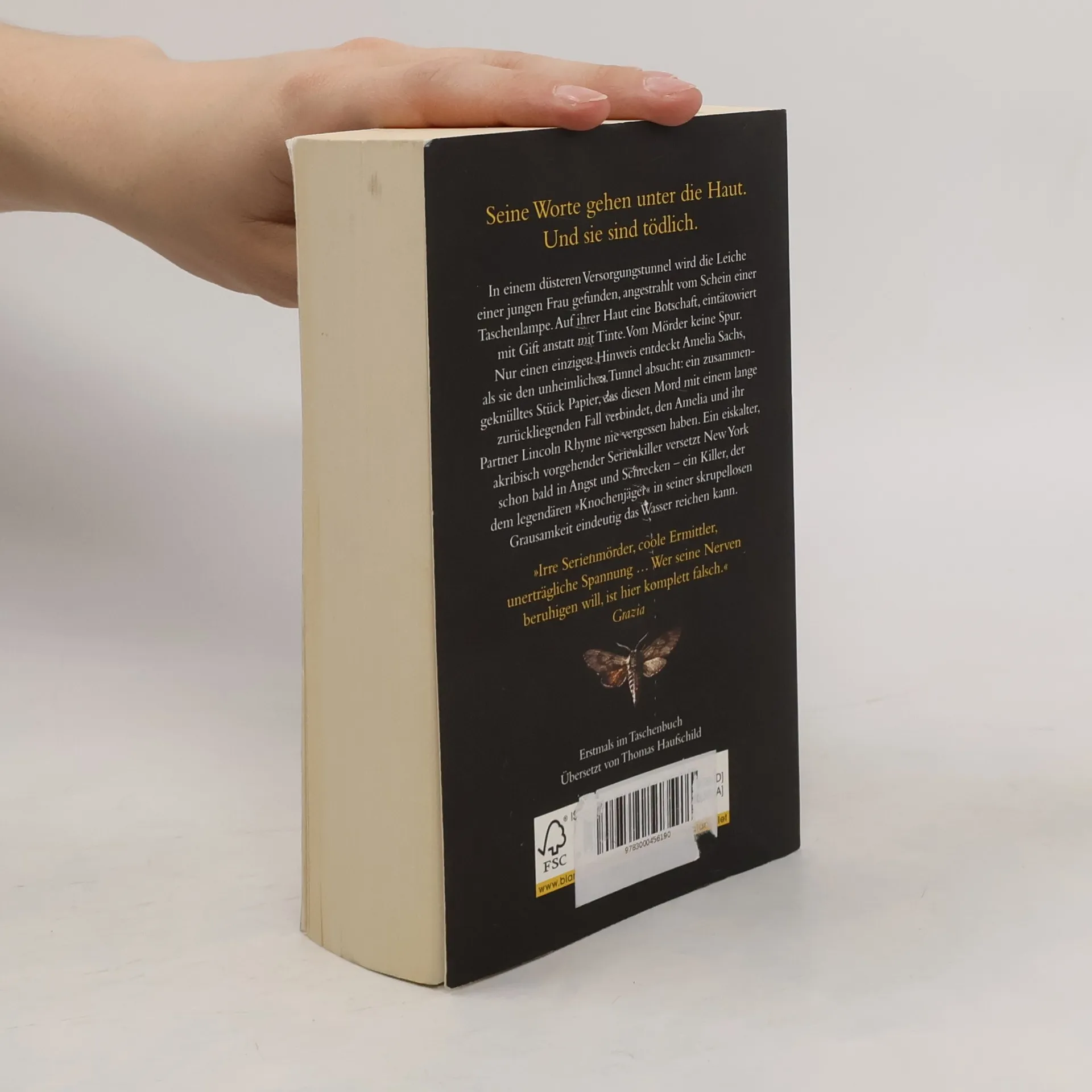 Der 11. Fall für Lincoln Rhyme und Amelia Sachs. In einem düsteren Versorgungstunnel wird die Leiche einer jungen Frau gefunden, angestrahlt vom Schein einer Taschenlampe. Auf ihrer Haut eine Botschaft, eintätowiert mit Gift anstatt mit Tinte. Vom Mörder keine Spur. Nur einen einzigen Hinweis entdeckt Amelia Sachs, als sie den unheimlichen Tunnel absucht: ein zusammengeknülltes Stück Papier, das diesen Mord mit einem lange zurückliegenden Fall verbindet, den Amelia und Lincoln Rhyme nie vergessen haben. Ein eiskalter, akribisch vorgehender Serienkiller versetzt New York schon bald in Angst und Schrecken – ein Killer, der dem legendären Knochenjäger in seiner skrupellosen Grausamkeit eindeutig das Wasser reichen kann.