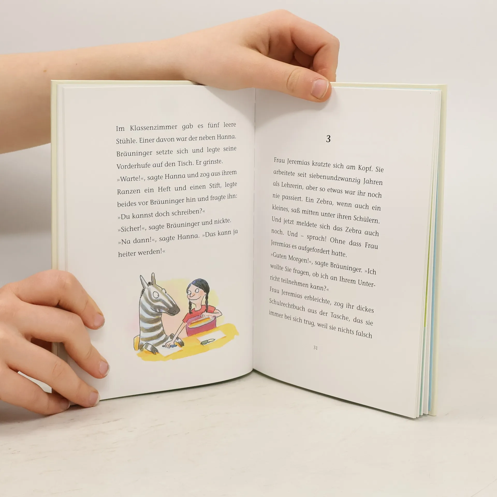 »Bräuninger? Komischer Name für ein Zebra.« »Find ich auch. Aber da kann man nichts machen.« Eines Morgens liegt unter Hannas Bett ein Zebra. Ein lebendiges Zebra! Einfach so. Hanna ist mit ihren beiden Papas neu in die Gegend gezogen und so ist es ihr recht, dass Bräuninger, so heißt das Zebra, sie in die Schule begleitet. Ein Zebra im Unterricht? Das geht nicht! Da Bräuninger aber verflixt gut schreiben, rechnen und turnen kann, darf er bleiben - zumindest fürs Erste. Diesen Schultag werden die Kinder nie vergessen: Schreiben lernen auf Bräuningers Streifen! Bocksprünge über seinen Rücken! Traumstunde! Doch plötzlich geht die Tür auf: Zwei Zoowärter erscheinen und führen Bräuninger ab. Was soll Hanna jetzt machen? Markus Orths erzählt witzig und tiefsinnig von Andersartigkeit und Fremdsein. Dass Hanna bei ihren »homosensationellen« Vätern aufwächst, wird herrlich unaufgeregt thematisiert. Kerstin Meyer hat die Stimmungslagen der Figuren in ihren Illustrationen großartig eingefangen.