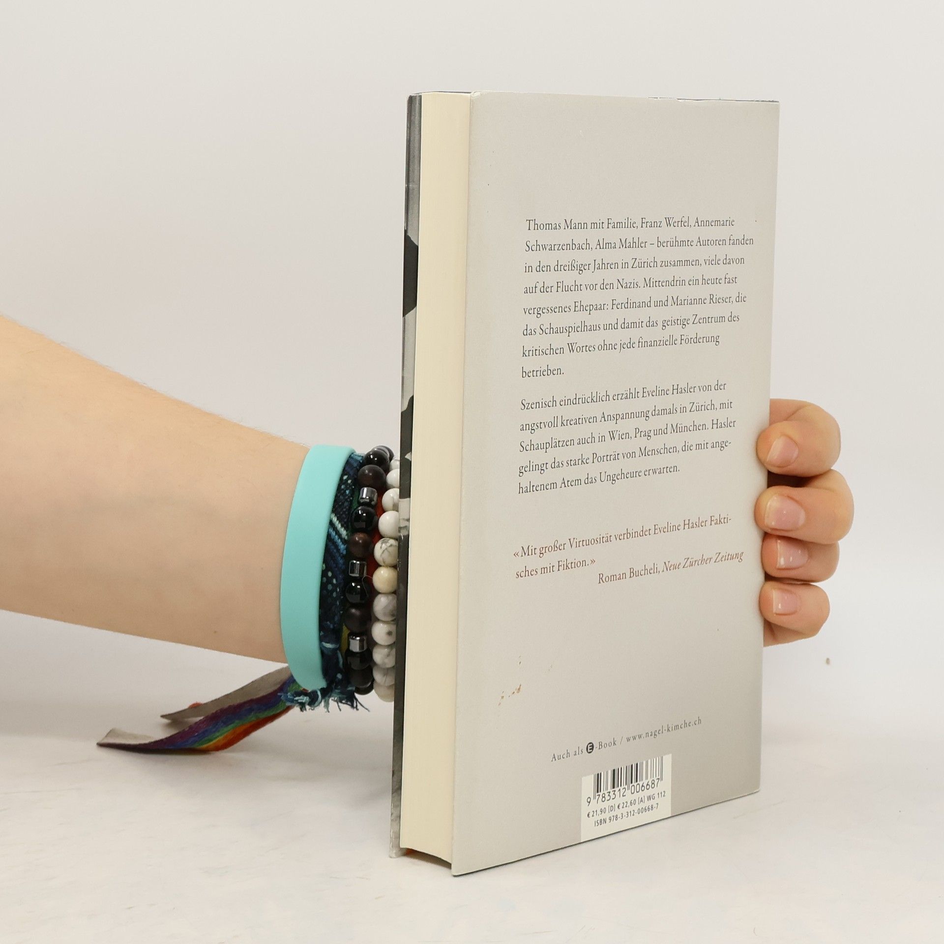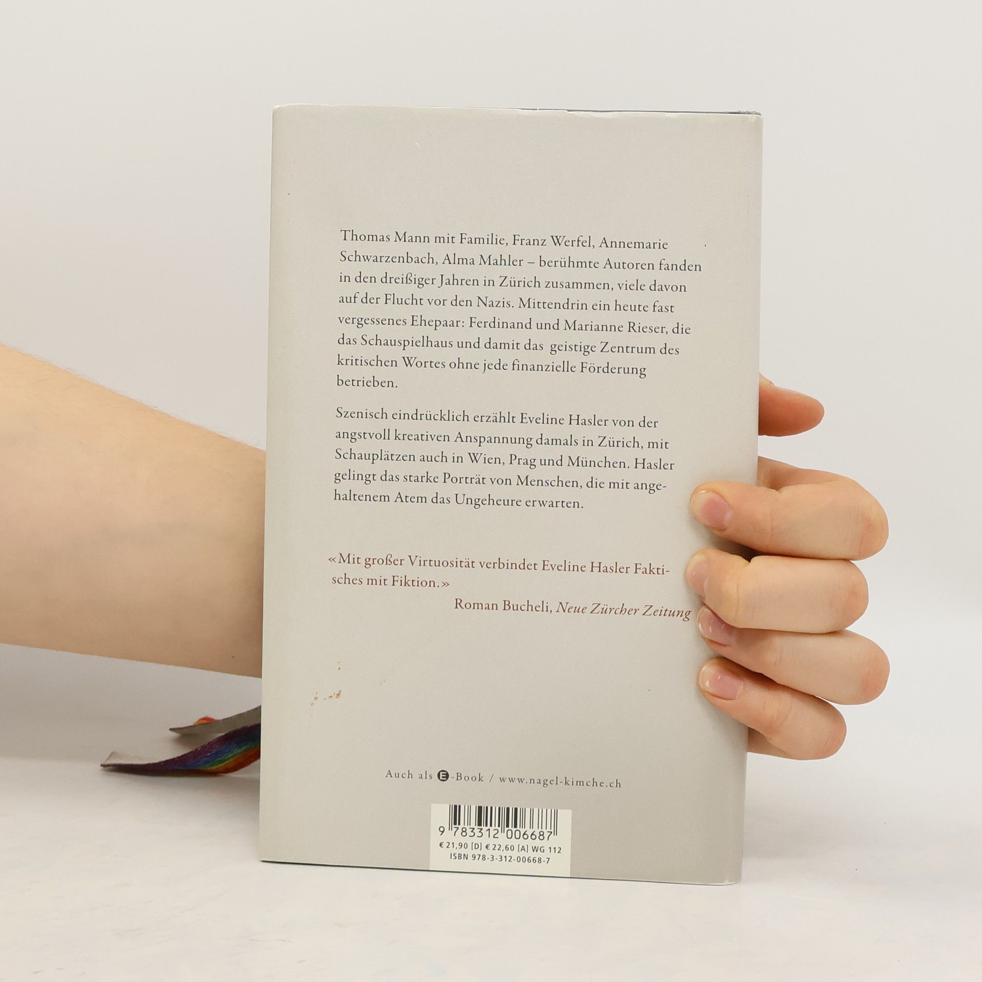 Thomas Mann mit Familie, Franz Werfel, Annemarie Schwarzenbach, Alma Mahler – berühmte Autoren fanden vor dem Krieg in Zürich zusammen, mittendrin das heute vergessene Ehepaar Ferdinand und Marianne Rieser. Ihrem Engagement war es zu verdanken, dass das von ihnen gekaufte und privat betriebene Theater am Pfauen zu einer Heimat im Exil für viele durch den Nationalsozialismus gefährdete Schauspieler aus Deutschland wurde. Sie spielten riskante, nazikritische Stücke. In ihrer romanhaften Art erzählt Eveline Hasler von der angstvoll kreativen Anspannung damals, Schauplätze sind auch Wien, Prag und München. Ein starkes Porträt von Menschen, die mit angehaltenem Atem das Ungeheure erwarten.