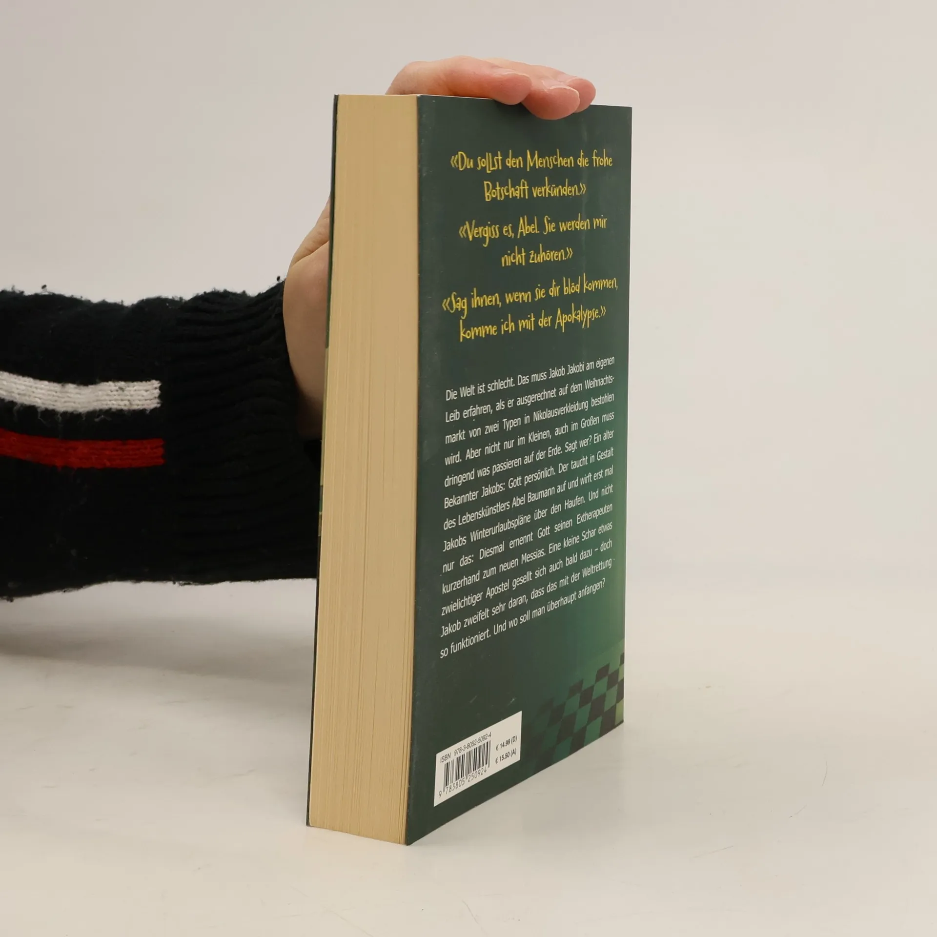 'Du sollst den Menschen die frohe Botschaft verkünden.' 'Vergiss es Abel. Sie werden mir nicht zuhören.' 'Sag ihnen, wenn sie dir blöd kommen, komme ich mit der Apokalypse.' Die Welt ist schlecht. Das muss Jakob Jakobi am eigenen Leib erfahren, als er ausgerechnet auf dem Weihnachtsmarkt von zwei Typen in Nikolausverkleidung bestohlen wird. Aber nicht nur im Kleinen, auch im Großen muss dringend was passieren auf der Erde. Sagt wer? Ein alter Bekannter Jakobs: Gott persönlich. Der taucht in Gestalt des Lebenskünstlers Abel Baumann auf und wirft erst mal Jakobs Winterurlaubspläne über den Haufen. Und nicht nur das: Diesmal ernennt Gott seinen Ex-Therapeuten kurzerhand zum neuen Messias. Eine kleine Schar etwas zwielichtiger Apostel gesellt sich auch bald dazu - doch Jakob zweifelt sehr daran, dass das mit der Weltrettung so funktioniert. Und wo soll man überhaupt anfangen?