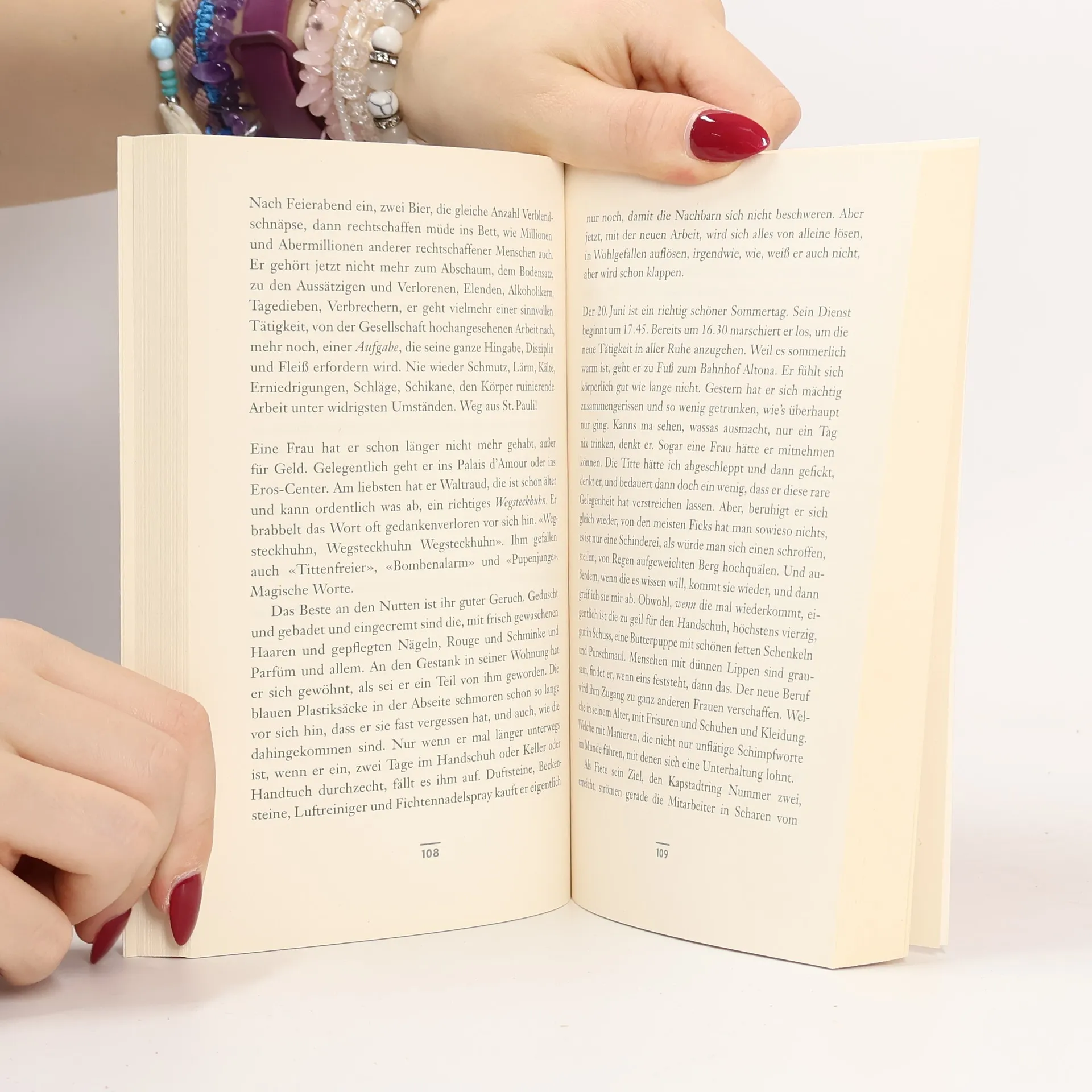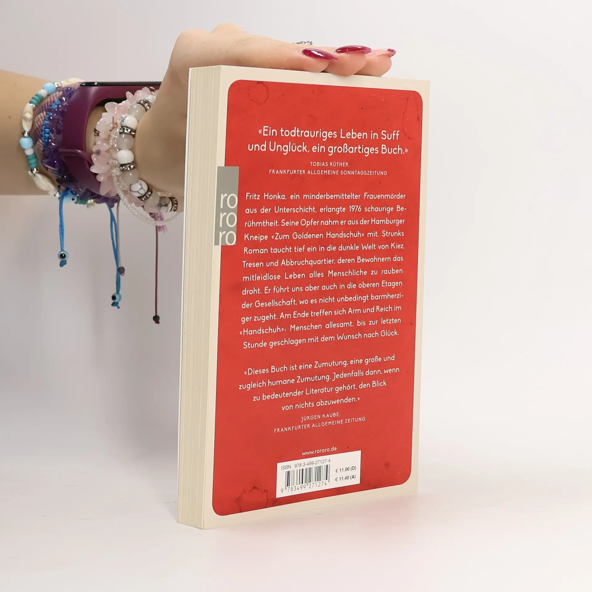 Fritz Honka, ein minderbemittelter Frauenmörder aus der Unterschicht, erlangte 1976 schaurige Berühmtheit. Seine Opfer nahm er aus der Hamburger Kneipe «Zum Goldenen Handschuh» mit. Strunks Roman taucht tief ein in die dunkle Welt von Kiez, Tresen, Abbruchquartier, deren Bewohnern das mitleidlose Leben alles Menschliche zu rauben droht. Er führt uns aber auch in die oberen Etagen der Gesellschaft, wo es nicht unbedingt menschlicher zugeht. Am Ende treffen sich Arm und Reich im «Handschuh»: Menschen allesamt, bis zur letzten Stunde geschlagen mit dem Wunsch nach Glück. Jetzt im Kino, verfilmt von Fatih Akin