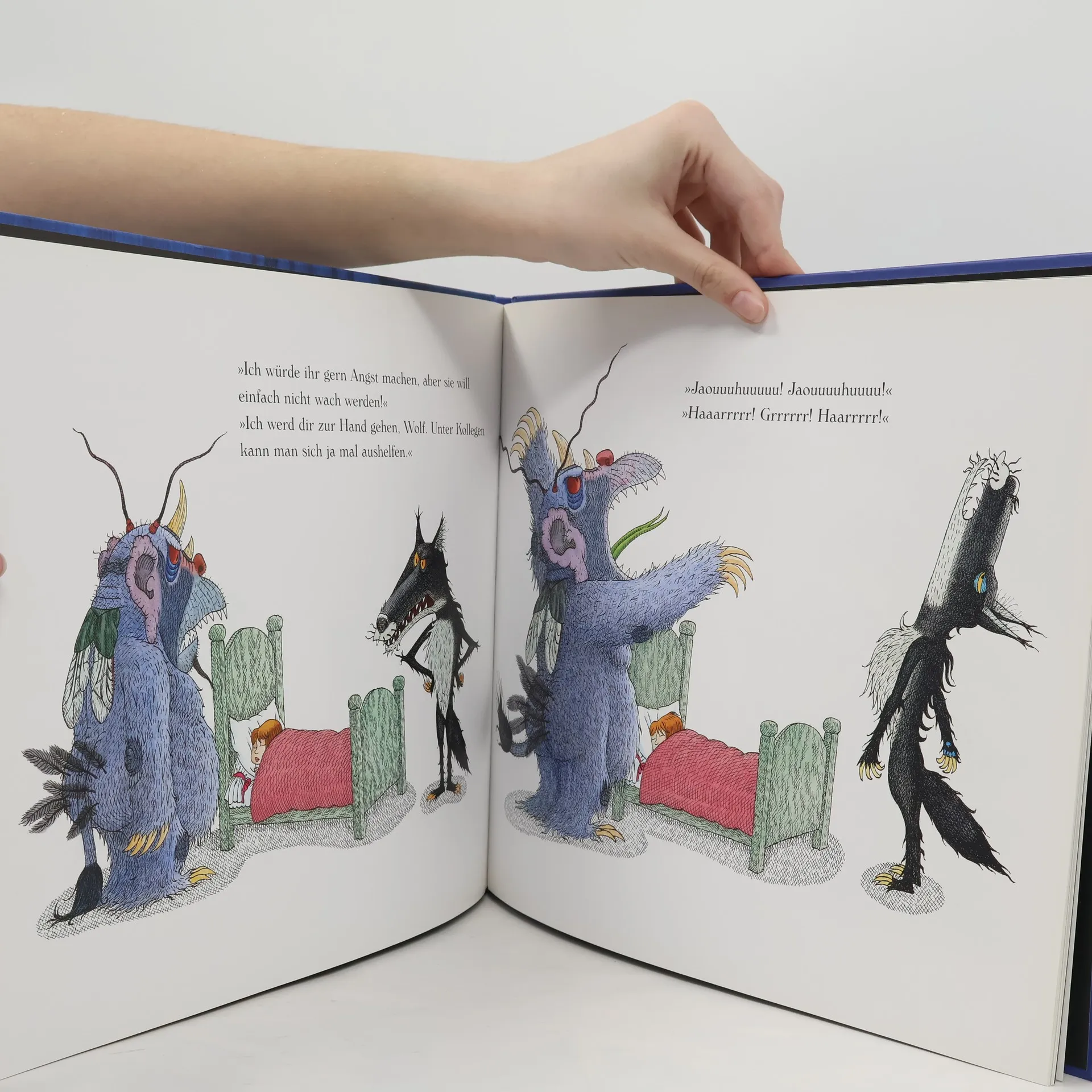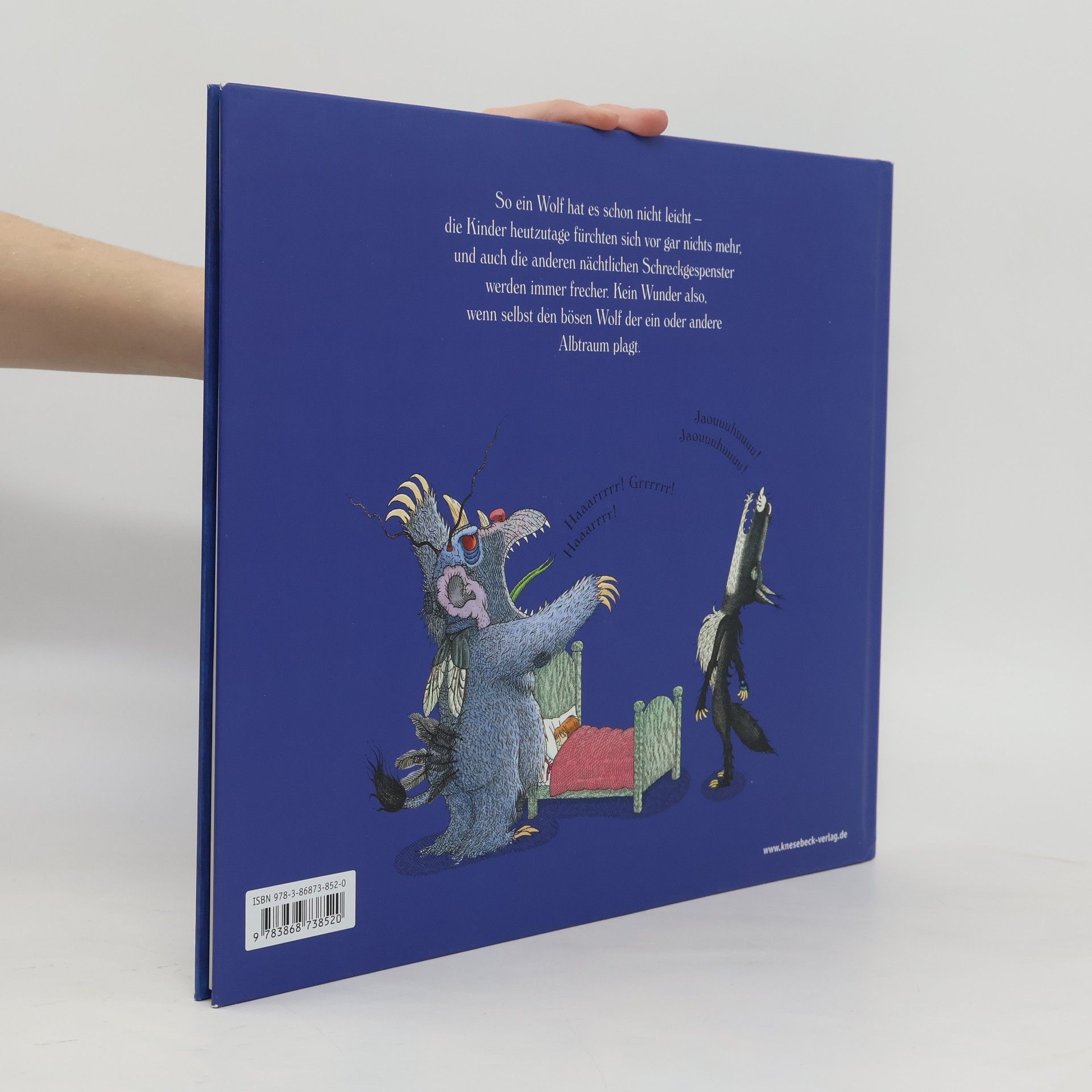 Am Bett eines tief schlafenden kleinen Mädchens heult in der Nacht ein böser schwarzer Wolf – und weckt den schrecklichen Alptraum, der unter dem Bett des Mädchens lebt. Da streiten sich der Alptraum und der böse Wolf, wer dem Mädchen mehr Angst macht. Und dann taucht auch noch der schlimme Alptraum der Großmutter auf. Aber halt, wer träumt denn hier eigentlich ? In dieser Geschichte entschärft André Bouchard mit viel Humor ein ernstes Thema: nächtliche Ängste bei Kindern.