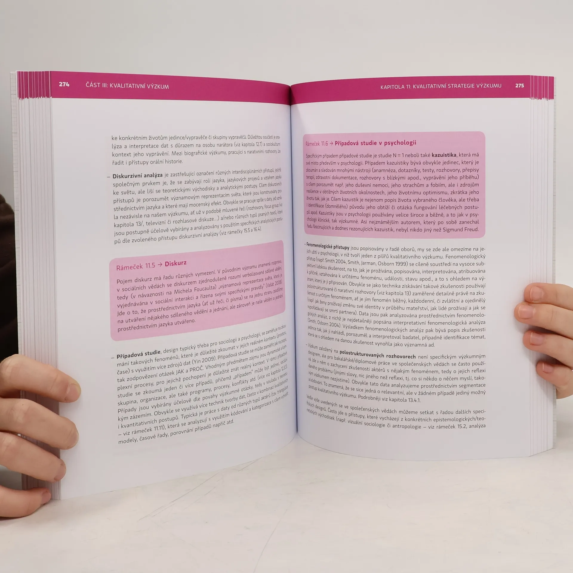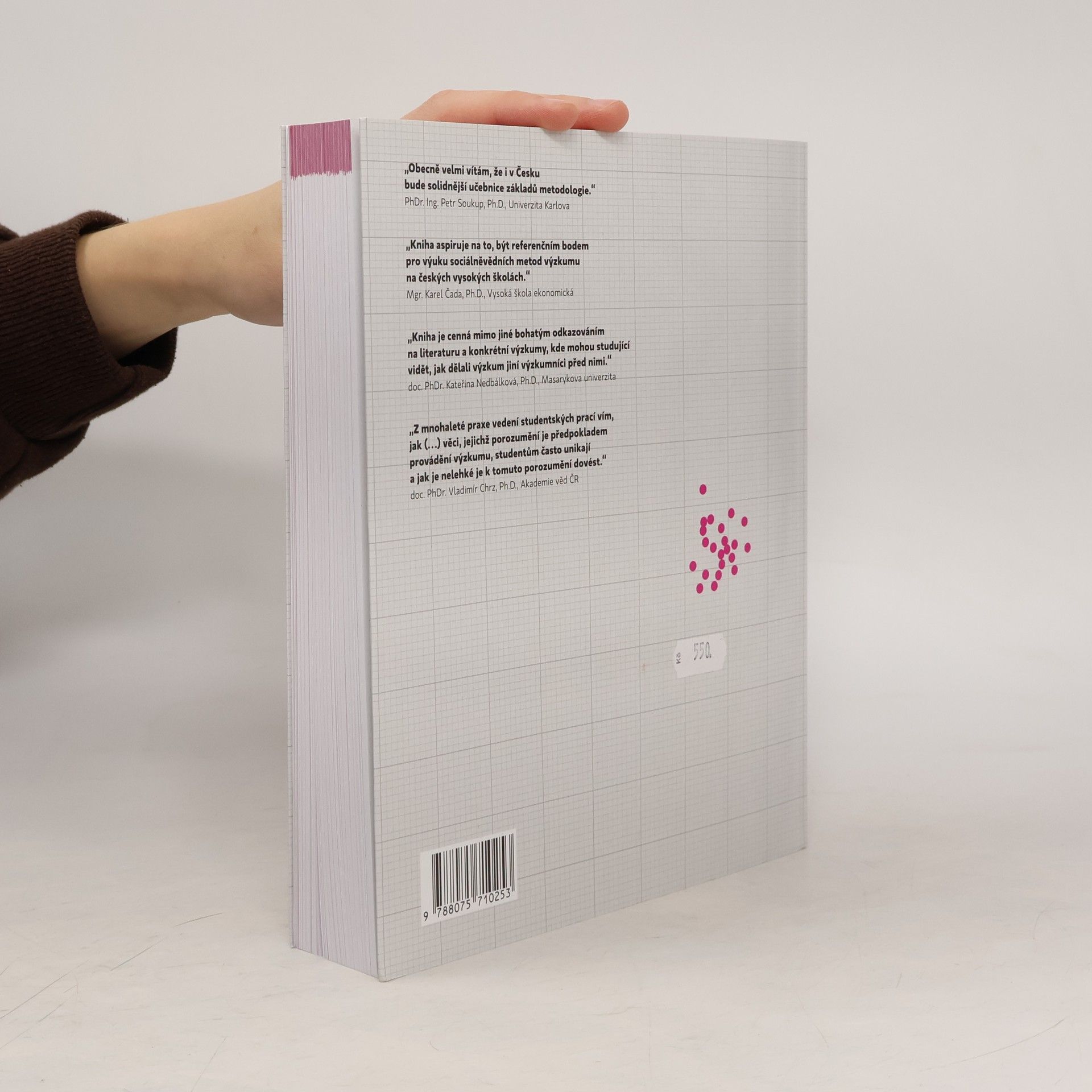 Učebnice přináší představení základních principů a metod empirického výzkumu ve společenských vědách. Hlavním cílem knihy je poskytnout studentům společenskovědních oborů oporu pro orientaci v širokém poli užívaných výzkumných metod, představit stěžejní způsoby uvažování v oblasti metodologie, ale i konkrétní postupy empirického výzkumu. Jednotlivé kapitoly nabízejí široce rozkročený přehled z oblasti kvantitativních i kvalitativních přístupů a zohledňují tak různorodé potřeby jednotlivých společenskovědních oborů i teoretických směrů bádání. Autorský tým čerpá ze svých zkušeností s výukou metodologie společenských věd na Fakultě humanitních studií Univerzity Karlovy. Zároveň přináší multidisciplinární perspektivu – výzkumně i pedagogicky je ukotven v sociologii, sociální antropologii a psychologii. Toto oborové rozložení se do určité míry promítá i do učebnice, která zprostředkovává současné uvažování o empirickém výzkumu ve společenských vědách z pohledu právě těchto tří disciplín. Představené metodologické základy ale mohou být stejně tak užitečné pro studenty dalších disciplín, jako je politologie, sociální geografie či třeba mediální studia, a řady dalších aplikovaných společenskovědních oborů.