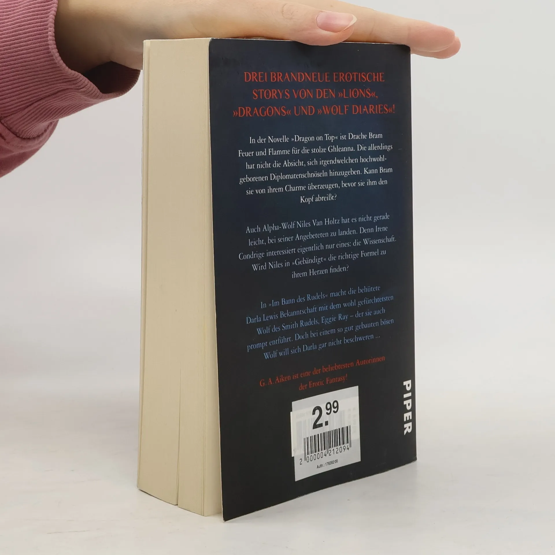 Mit ihren »Lions«, »Dragons« und »Wolf Diaries« gehört G. A. Aiken zu den beliebtesten Autorinnen der Erotic Fantasy. Ihre Anthologie »Wildes Feuer, scharfe Krallen« beinhaltet drei brandneue erotische Storys aus G. A. Aikens Gestaltwandler-Universum - unverzichtbar für jeden Aiken-Fan! In der Novelle »Dragon on Top« ist Drache Bram Feuer und Flamme für die stolze Ghleanna. Alpha-Wolf Niles hingegen muss in »Gebändigt« alles tun, damit seine geliebte Irene ihn überhaupt wahrnimmt. Und »Im Bann des Rudels« macht die behütete Darla Lewis Bekanntschaft mit einem Wolf, der ihre animalischen Instinkte weckt.