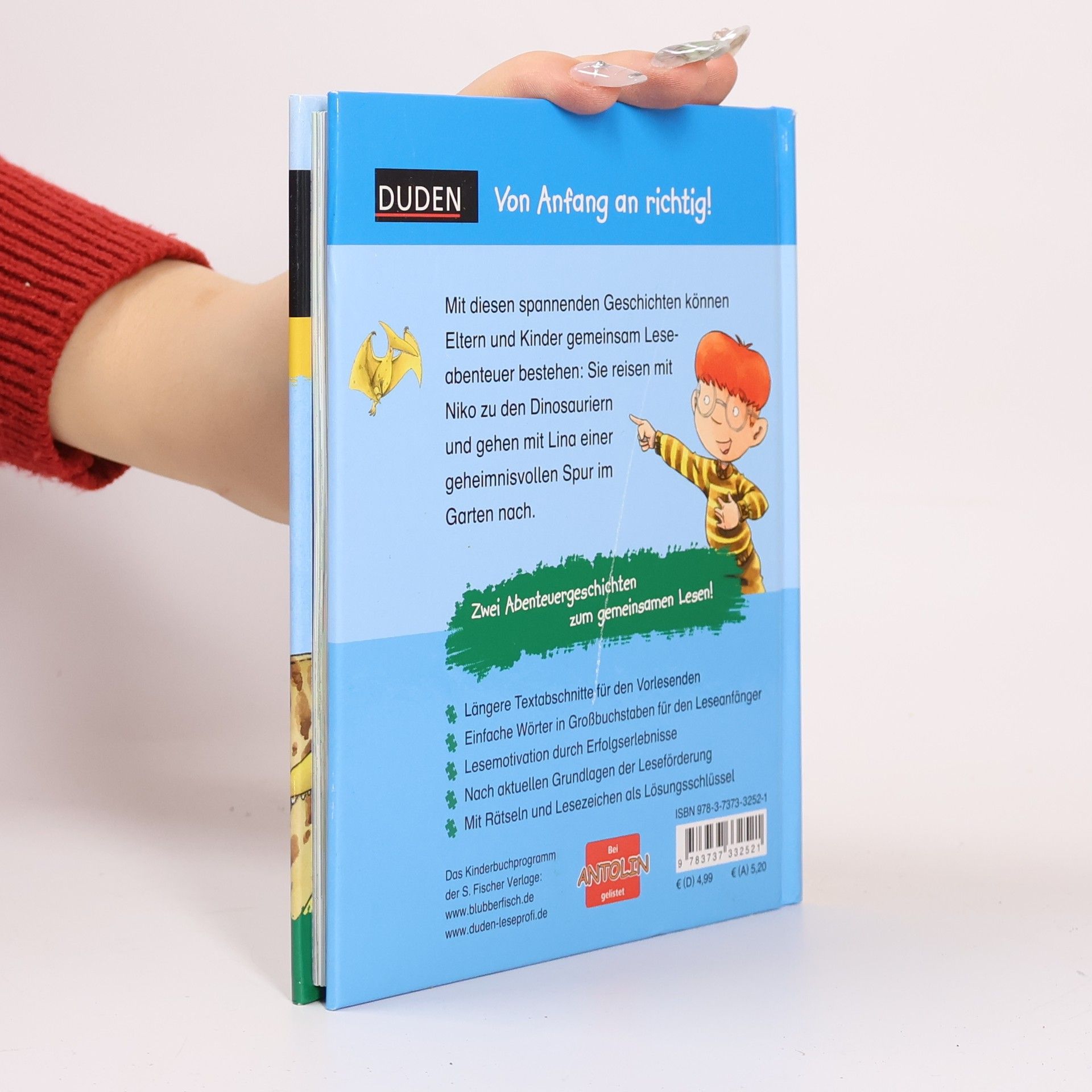 +++ 2 Abenteuergeschichten zum gemeinsamen Lesen +++ Mit diesen spannenden Geschichten im praktischen Geschenkformat können Eltern und Kinder gemeinsam große und kleine Abenteuer bestehen: Sie reisen mit Niko zu den Dinosauriern und gehen mit detektivischem Gespür einer geheimnisvollen Spur im Garten nach. Zum absoluten Sonderpreis! Dieses Buch aus der Erstlesereihe "Leseprofi" von FISCHER Duden Kinderbuch sorgt mit spannenden Geschichten und tollen Illustrationen für Lesespaß. Der geübte Vorlesende liest größere Textpassagen. Der Leseanfänger liest einfach, lautgetreue Passagen in großer Fibelschrift. Erfolgserlebnisse bei der Lektüre erhöhen die Lesemotivation, denn der Text ist genau auf die Bedürfnisse der Kinder zugeschnitten. Kleine Leserätsel begleiten beim Lesen. Ein tolles Lesezeichen dient als Lösungsschlüssel. Alle Titel der Reihe werden bei Antolin gelistet. +++ Duden von Anfang an richtig! +++