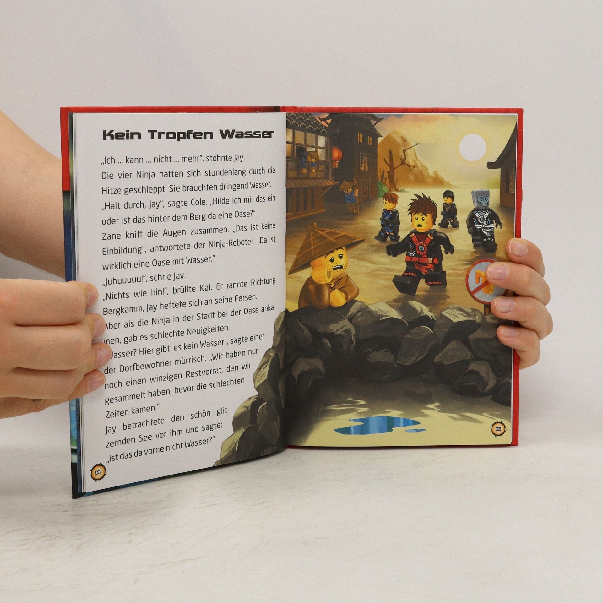 Die neuen Abenteuer der Ninja in drei spannenden Geschichten sind da! Was hat es mit dem eigenartigen Verhalten der Bewohner des Wüstendorfes auf sich, und können die jungen Helden die geheimnisvolle Schriftrolle finden? Sie verrät ihnen, wie die neue Technik des Airjitzu funktioniert, und das wollen sie unbedingt beherrschen. Werden sie das Geheimnis lüften, und wird es ihnen gelingen, diese neue Kampftechnik einzusetzen? Drei Geschichten in gut lesbarer Schrift, illustriert mit handgemalten Bildern zu den drei Geschichten, sind ein Genuss für jeden Leseanfänger und NINJAGO™ Fan. Mit einer Einführung zu Beginn und einem Glossar am Ende des Buches werden Hintergründe und wichtige Begriffe erklärt.