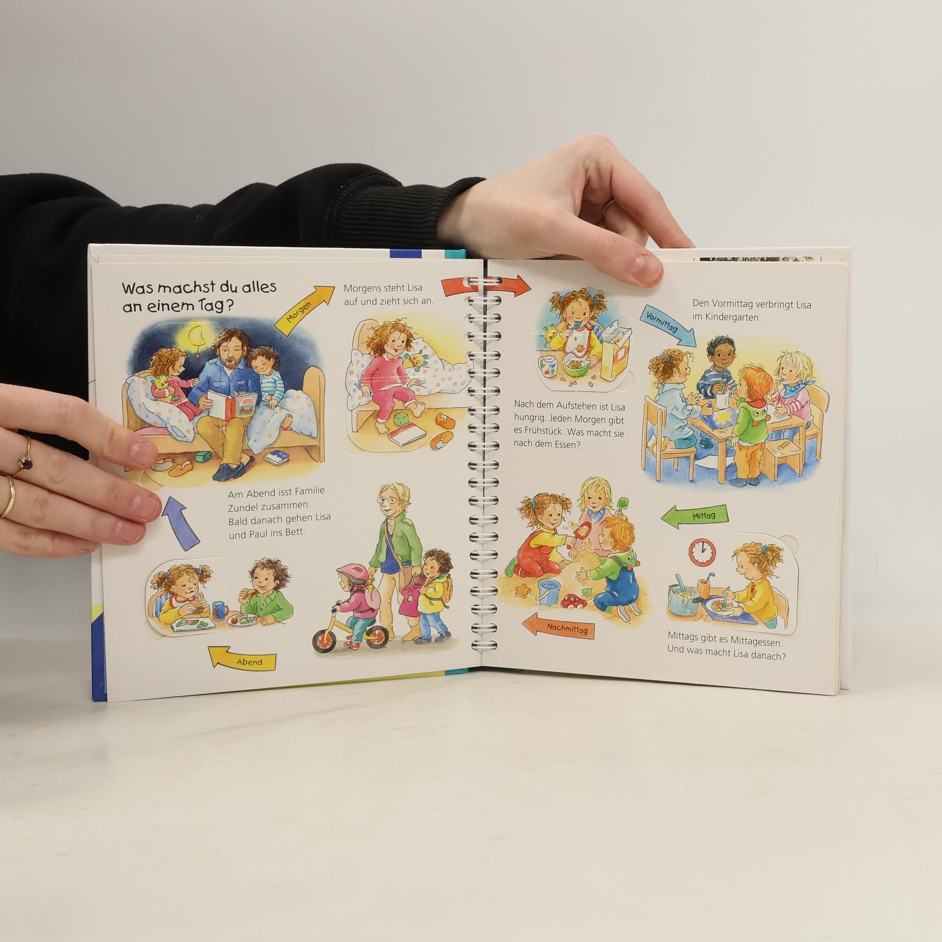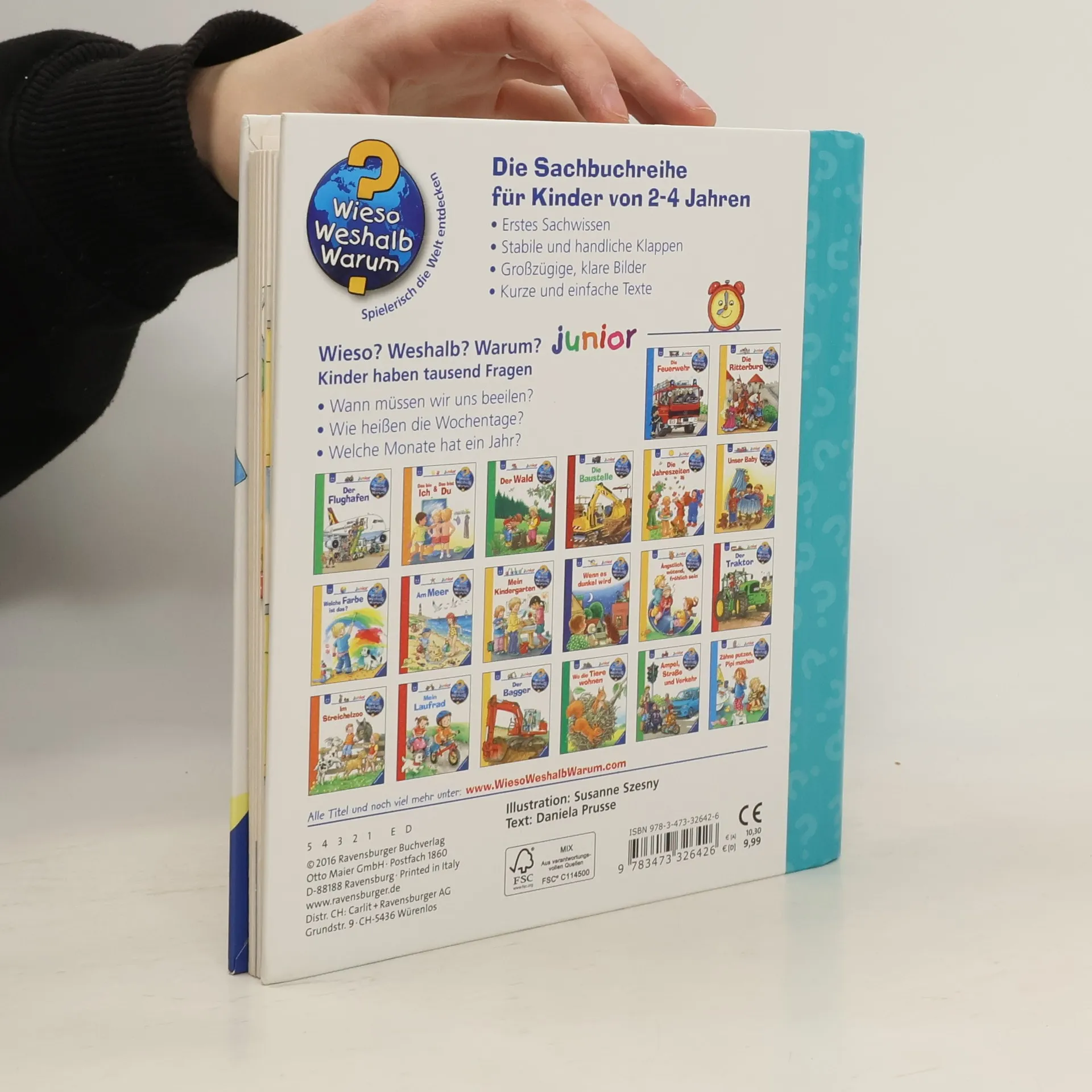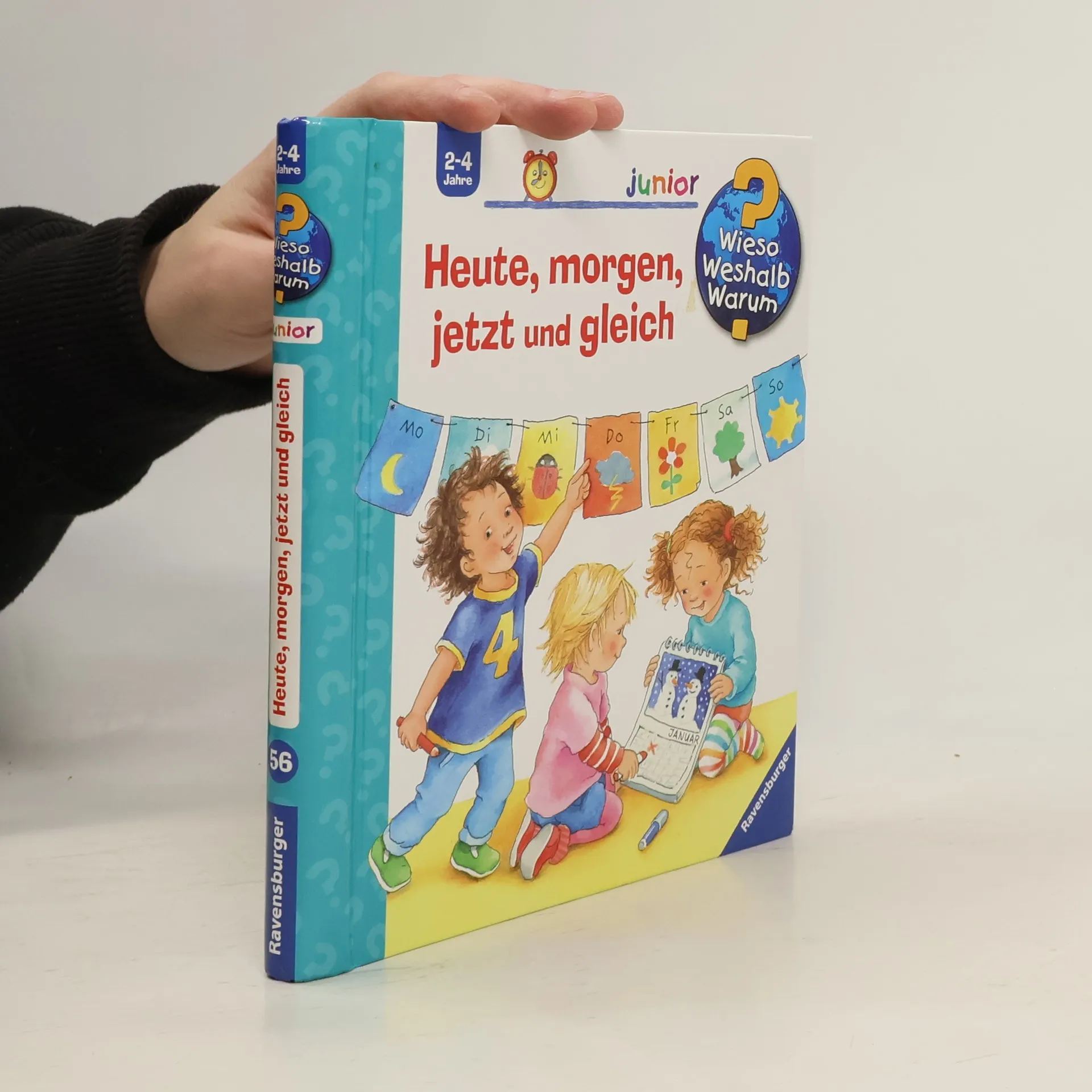 Gestern, morgen, in einer Stunde, nächste Woche - unsere Zeiteinteilung ist für kleine Kinder nur schwer zu begreifen. Wann ist „gleich“? Was geht schnell und was dauert lange? Welche Wochentage und Monate gibt es? Was ist morgens, mittags, abends? Mithilfe von anschaulichen Alltagssituationen macht dieses Buch auch abstrakte Zeitbegriffe schon für Kinder ab 2 Jahren fassbar und hilft ihnen, Zeitpunkte und -räume besser einzuschätzen. Wieso? Weshalb? Warum? junior Die Sachbuchreihe für Kinder von 2-4 Jahren Jeden Tag entdecken Kinder etwas Neues – und haben viele Fragen. Wann kommt die Feuerwehr? Was machen die Tiere im Winter? Warum muss ich Zähne putzen? Die beliebte Sachbuchreihe Wieso? Weshalb? Warum? junior beantwortet die Fragen der Kinder auf Augenhöhe. Sie beleuchtet unterschiedlichste Themen aus ihrer Alltags- und Interessenswelt altersgerecht und mit viel Liebe zum Detail. Die Reihe ist speziell auf kleine Hände und die Bedürfnisse der Kleinsten angepasst. Klare und liebevolle Bilder, kurze Sachtexte sowie handliche Klappen, die Bewegungen veranschaulichen und überraschende und lustige Einblicke gewähren, ermöglichen Kindern, sich ihre Themen selbst zu erschließen. Der Spaß am eigenhändigen Entdecken, die liebevolle Umsetzung und die hochwertige Ausstattung garantieren langanhaltende Freude an jedem Buch.