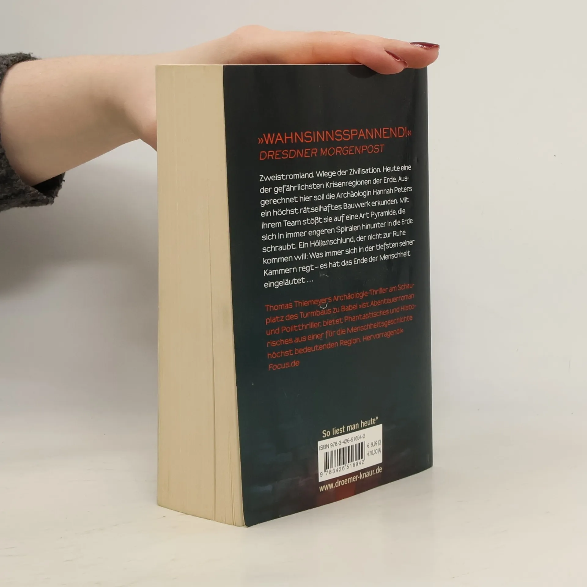 Aktuell - phantastisch - hochspannend: Thomas Thiemeyers Abenteuer-Thriller am Schauplatz des Turmbaus zu Babel Das irakisch-syrische Grenzgebiet. Naher Osten, Zweistromland, Wiege der Zivilisation. Heute eine der gefährlichsten Krisenregionen der Erde. Ausgerechnet hierhin entsendet Multimilliardär Norman Stromberg die Archäologen Hannah Peters und ihren Mann John Evans. Der Auftrag: die Erkundung eines der rätselhaftesten Zeugnisse der Menschheitsgeschichte. Hannah und ihr Team stoßen auf ein pyramidenartiges Bauwerk, das sich in immer engeren Spiralen hinunter in die Erde schraubt. Ein Schlund der Hölle, der fatal an Dantes Unterwelt erinnert. Was immer in der tiefsten seiner Kammern erwacht ist – ein vorzeitlicher Mechanismus oder eine uralte rachsüchtige Gottheit –, es hat das Ende der Menschheit eingeläutet.