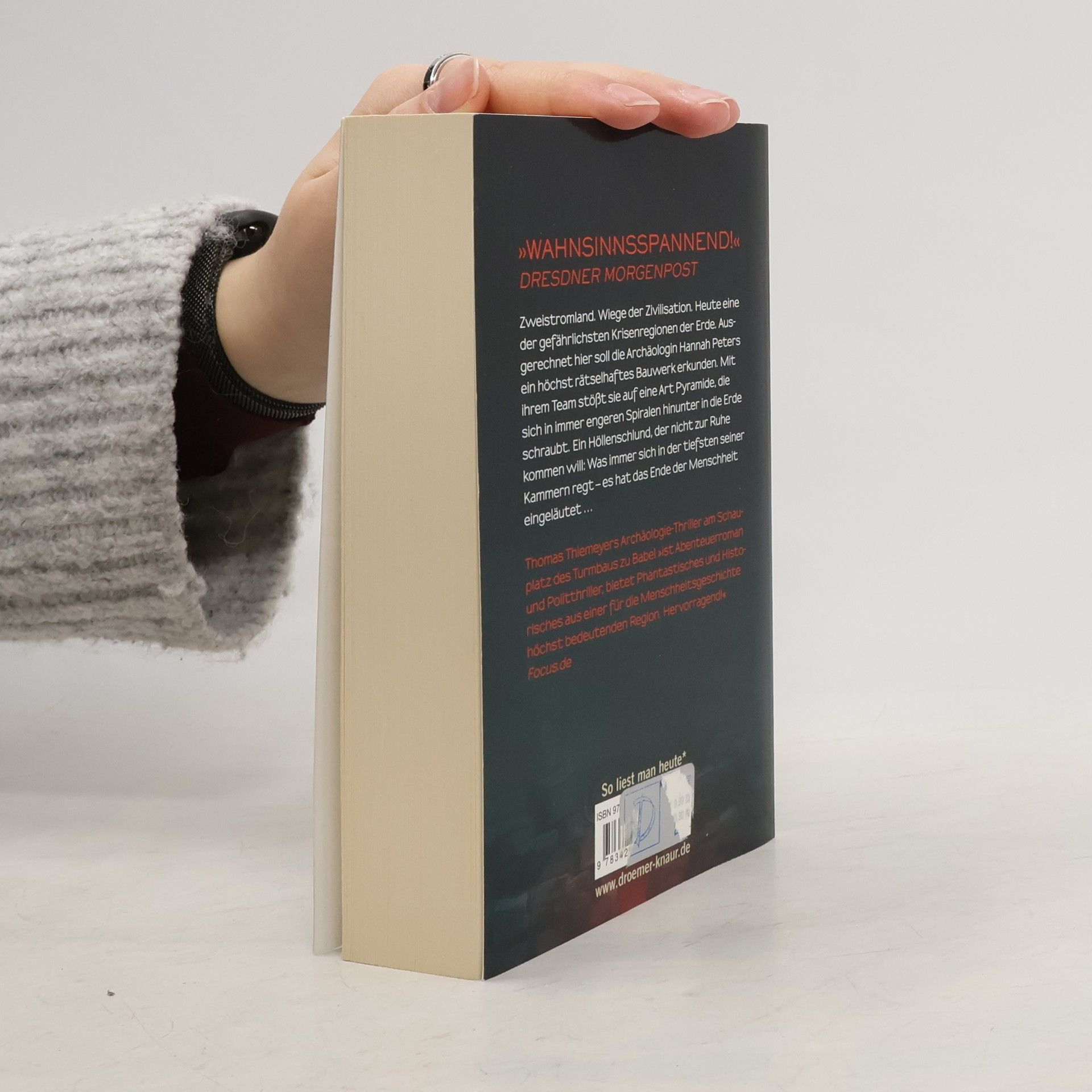 Aktuell - phantastisch - hochspannend: Thomas Thiemeyers Abenteuer-Thriller am Schauplatz des Turmbaus zu Babel Das irakisch-syrische Grenzgebiet. Naher Osten, Zweistromland, Wiege der Zivilisation. Heute eine der gefährlichsten Krisenregionen der Erde. Ausgerechnet hierhin entsendet Multimilliardär Norman Stromberg die Archäologen Hannah Peters und ihren Mann John Evans. Der Auftrag: die Erkundung eines der rätselhaftesten Zeugnisse der Menschheitsgeschichte. Hannah und ihr Team stoßen auf ein pyramidenartiges Bauwerk, das sich in immer engeren Spiralen hinunter in die Erde schraubt. Ein Schlund der Hölle, der fatal an Dantes Unterwelt erinnert. Was immer in der tiefsten seiner Kammern erwacht ist – ein vorzeitlicher Mechanismus oder eine uralte rachsüchtige Gottheit –, es hat das Ende der Menschheit eingeläutet.