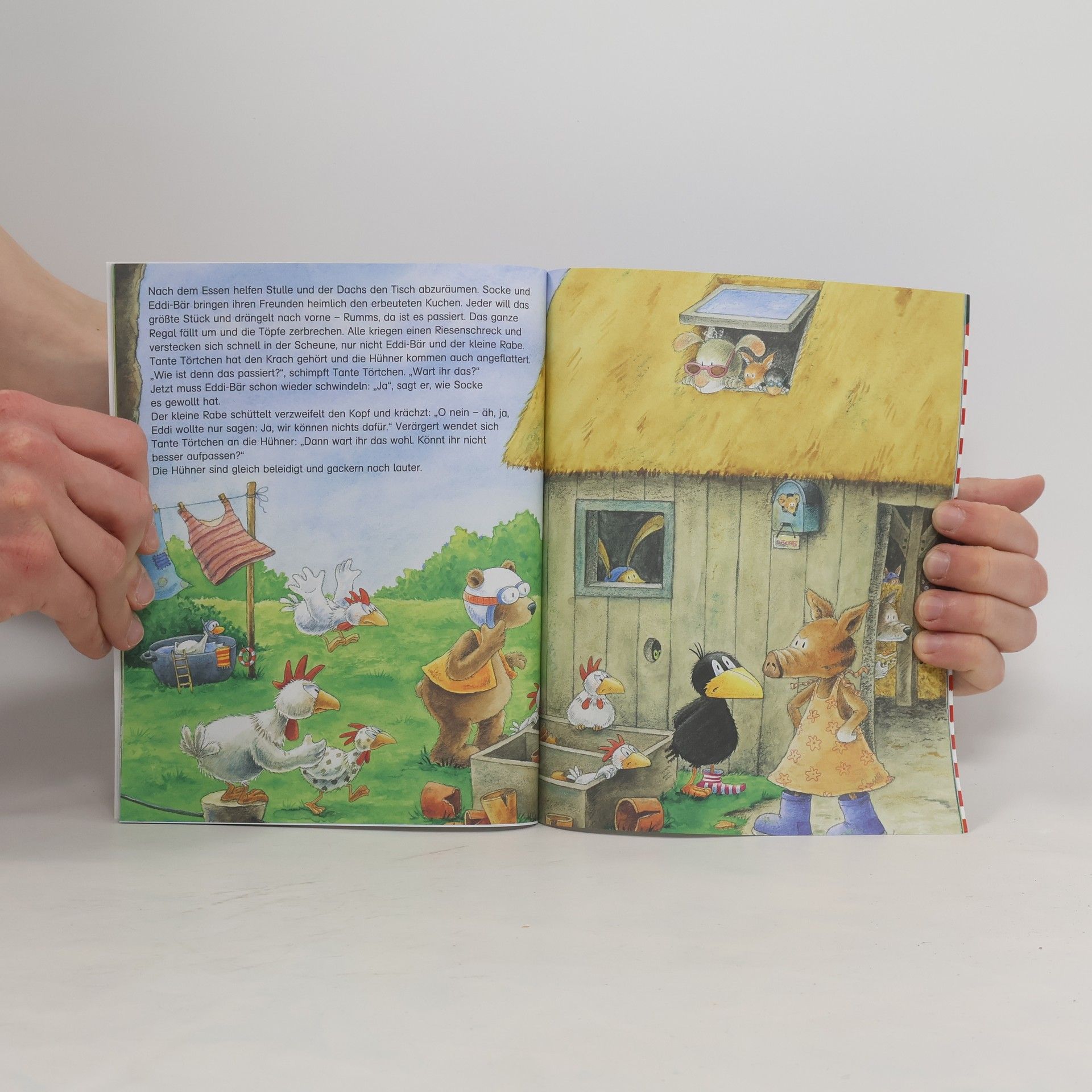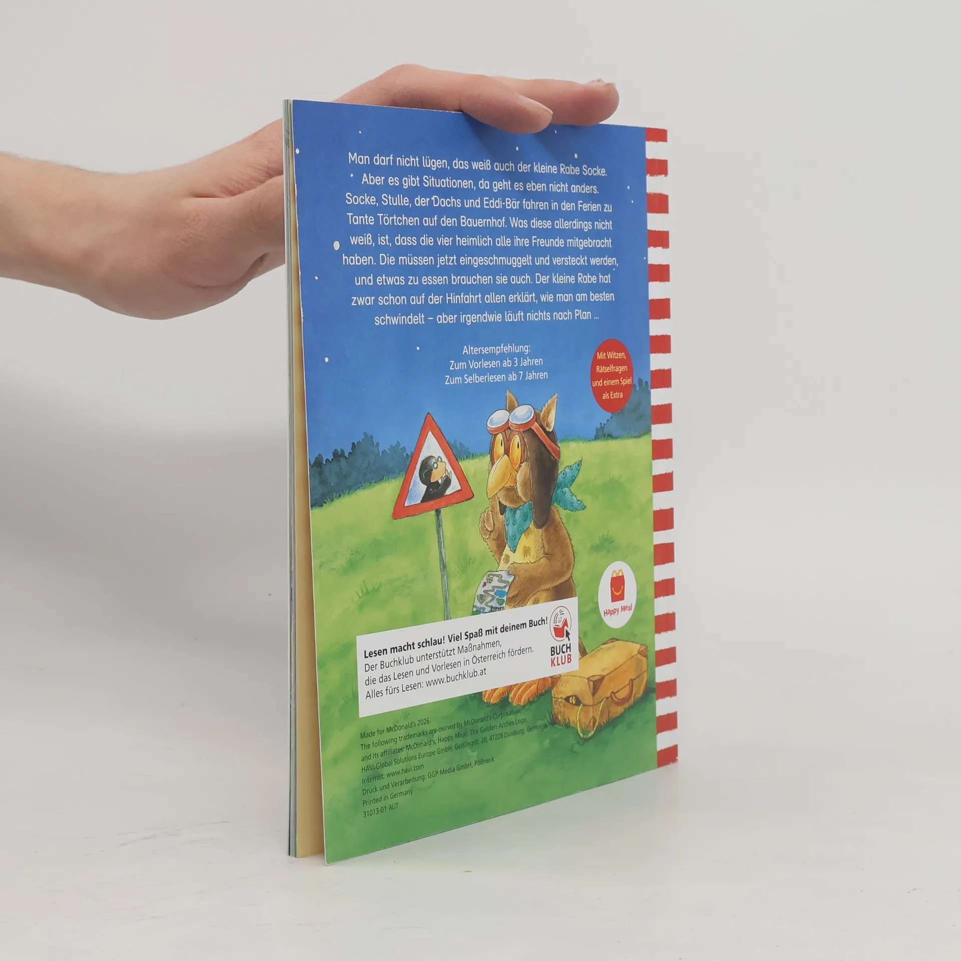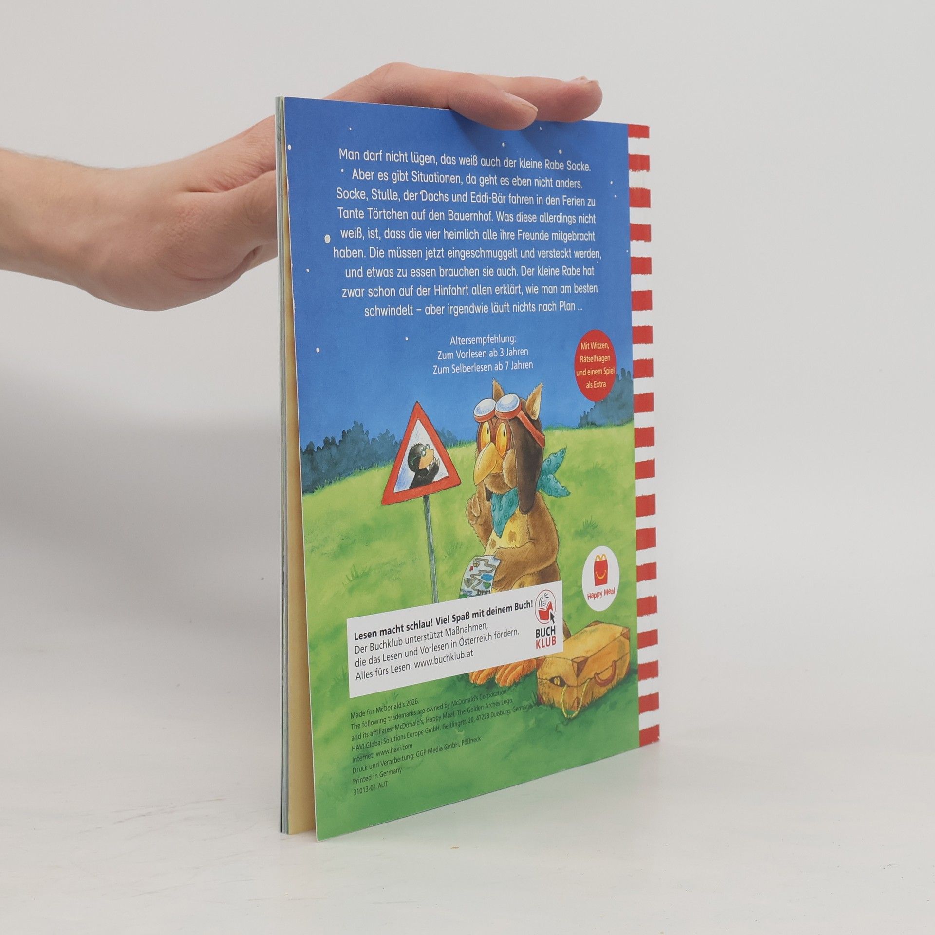Man darf nicht lügen, das weiß auch der kleine Rabe Socke. Aber es gibt Situationen, da geht es eben nicht anders. Socke, Stulle, der Dachs und Eddi-Bär fahren in den Ferien zu Tante Törtchen auf den Bauernhof. Was diese allerdings nicht weiß, ist, dass die vier heimlich alle ihre Freunde mitgebracht haben. Die müssen jetzt eingeschmuggelt und versteckt werden, und etwas zu essen brauchen sie auch. Der kleine Rabe hat zwar schon auf der Hinfahrt allen erklärt, wie man am besten schwindelt – aber irgendwie läuft nichts nach Plan … Als Sonderausgabe zum 20jährigen Jubiläum des kleinen Raben Socke mit einem bekannten Kinderlied und Rabenstrophe als Extra!