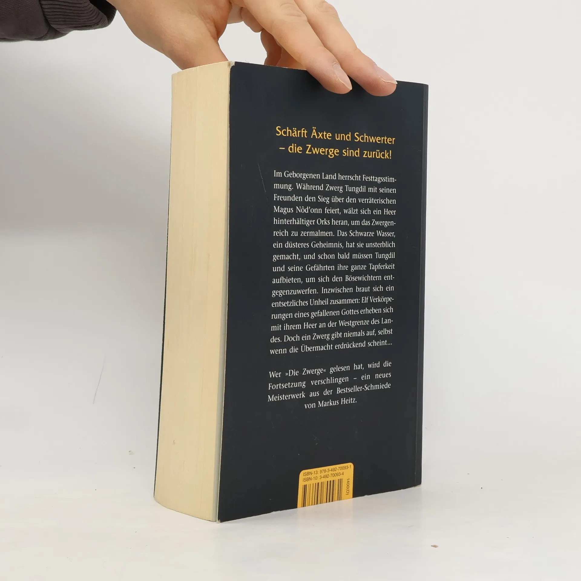 Im Geborgenen Land herrscht Festtagsstimmung. Während Zwerg Tungdil mit seinen Freunden den Sieg über den verräterischen Magus Nôd'onn feiert, wälzt sich ein Heer hinterhältiger Orks heran, um das Zwergenreich zu zermalmen. Das Schwarze Wasser, ein düsteres Geheimnis, hat sie unsterblich gemacht, und schon bald müssen Tungdil und seine Gefährten ihre ganze Tapferkeit aufbieten, um sich den Bösewichtern entgegenzuwerfen. Inzwischen braut sich ein entsetzliches Unheil zusammen: Elf Verkörperungen des Gottes des Bösen stehen mit ihrem Heer an der Westgrenze des Landes. Doch ein Zwerg gibt seinen Besitz erst auf, wenn die letzte Axt geschwungen ist … – Wer »Die Zwerge« gelesen hat, wird die Fortsetzung verschlingen – ein neues Meisterwerk aus der Bestsellerschmiede von Markus Heitz.