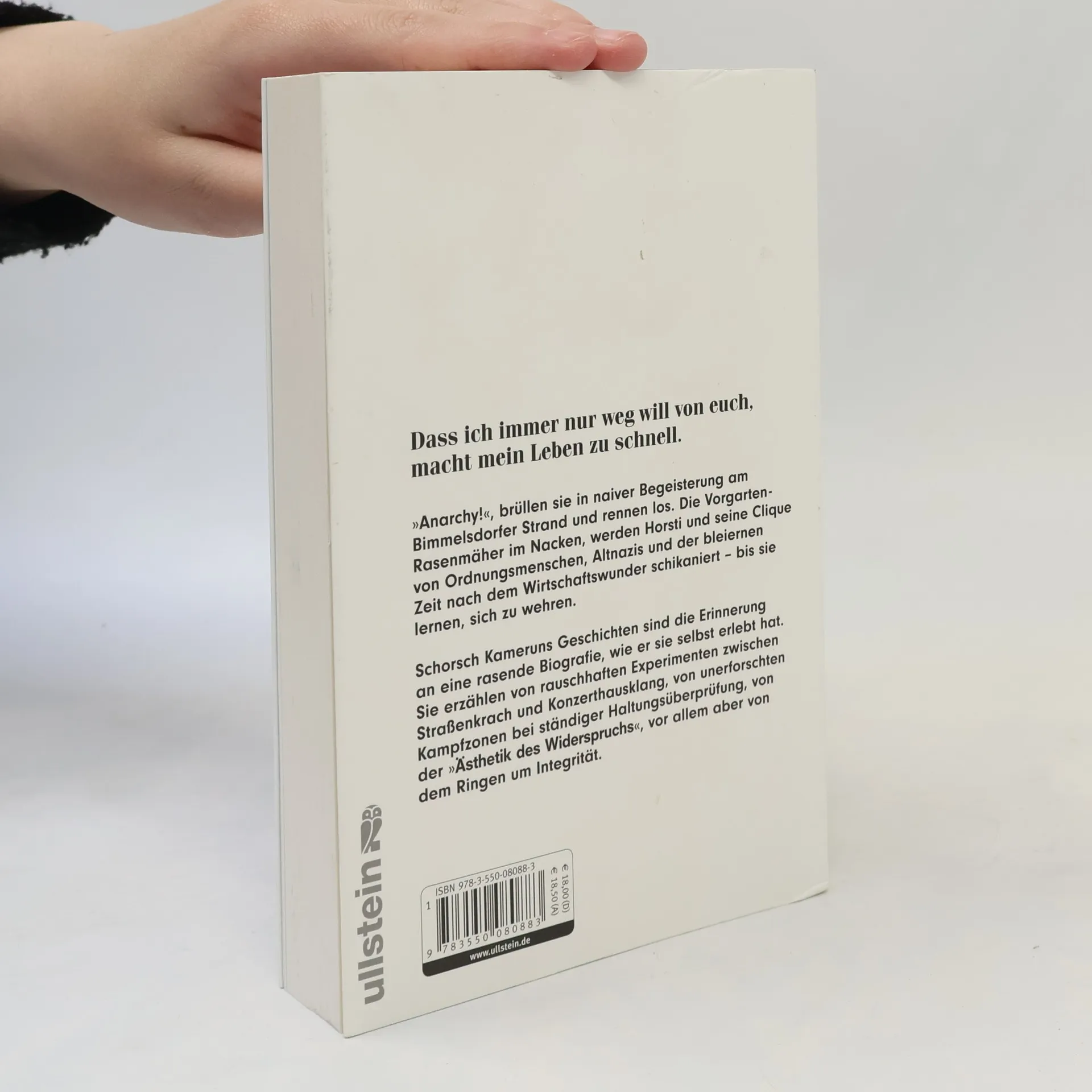 Am Bimmelsdorfer Strand rufen Horsti und seine Freunde begeistert „Anarchy!“ und fliehen vor den Ordnungsmenschen und der tristen Nachkriegszeit. Sie lernen, sich zu wehren und suchen Freiräume. Horsti wird zum Meister des Überlistens, entwickelt dadaistische Täuschungskonzepte, verweigert den Wehrdienst und zieht in die Großstadt. Gemeinsam mit seinen „genialen Dilettanten“ streben sie nach einer kollektiven Haltung, geprägt von Gegenkultur, 'penniless jetset', Anti-Kunst und unvergesslicher Musik. Ihre Angriffe sind von der Sehnsucht nach Zugehörigkeit und lebenswerten Utopien getrieben. Horsti inszeniert Opern und taucht in die Welt der Hochkultur ein, bleibt jedoch Aktivist und Zweifler. Er erkennt, dass die Widersprüche Teil seines Lebens sind. Schorsch Kameruns Geschichten reflektieren eine rasante Biografie voller rauschhafter Experimente und unerforschter Kampfzonen, die stets auf der Suche nach Integrität sind. Sein Werk wird als Schelmen- und Künstlerroman beschrieben, der die Abenteuer einer Spaßguerilla auf gesellschaftskritischer Mission beleuchtet. In Hamburg erlebte Kamerun die befreienden Momente einer Subkultur, die er mitgestaltete, und erzählt von der Entscheidung, als Störfaktor zu leben, trotz aller Herausforderungen.