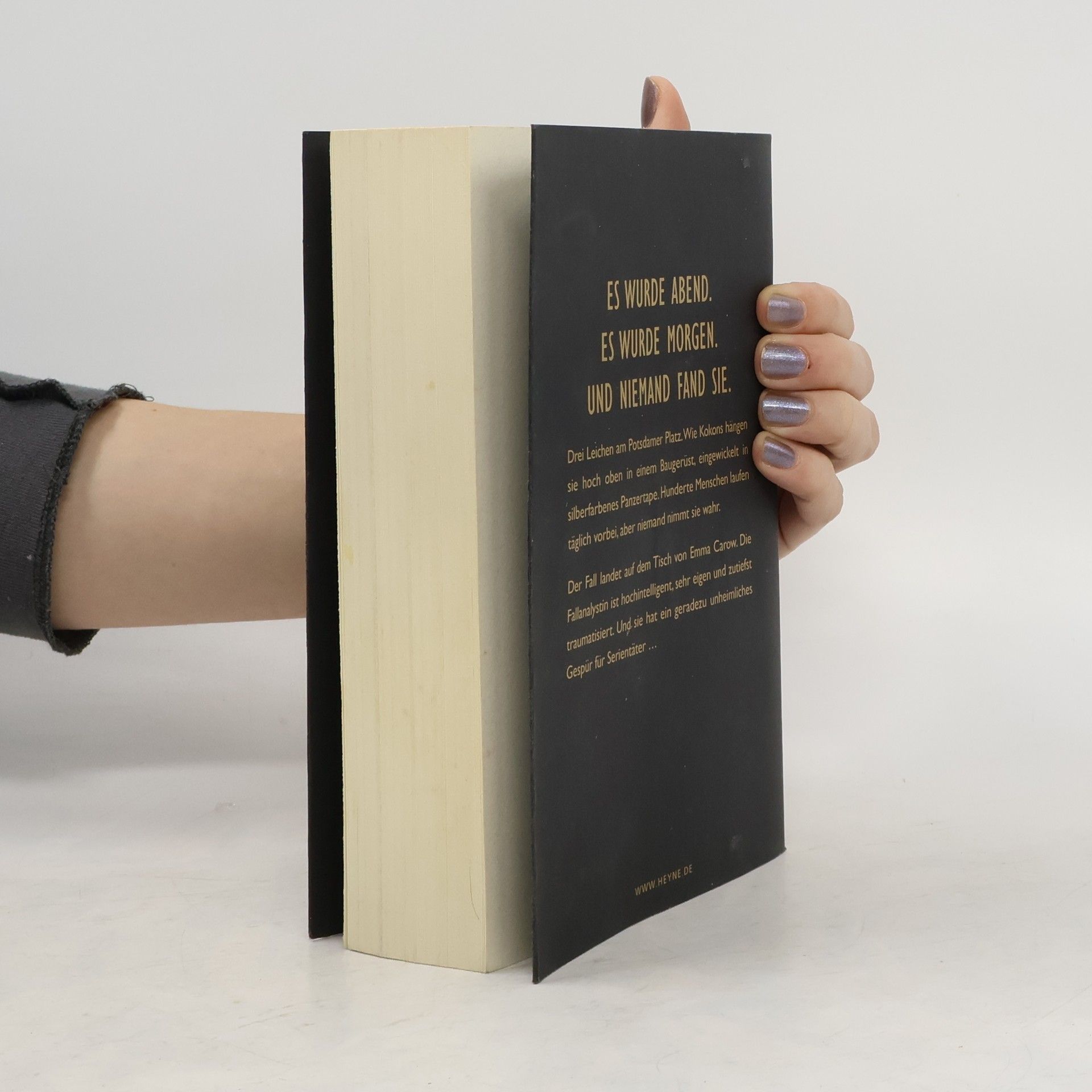 Vor Menschen hat sie Angst. Serienmörder versteht sie. Berlin, Potsdamer Platz. Beim Klettern auf einem Baugerüst macht ein Junge eine grausame Entdeckung: Drei Leichen, einbandagiert in Panzertape, hängen in schwindelerregender Höhe an den Gerüststangen. Sie sehen aus wie Mumien und scheinen in dieselbe Richtung zu blicken, als würden sie auf etwas warten. Als die menschenscheue Fallanalystin Emma Carow auf den Fall angesetzt wird, ist ihr schnell klar, dass er für ihre Karriere entscheidend ist. Doch je fester sie sich verbeißt, desto mehr droht ein altes Trauma sie in den Abgrund zu ziehen.