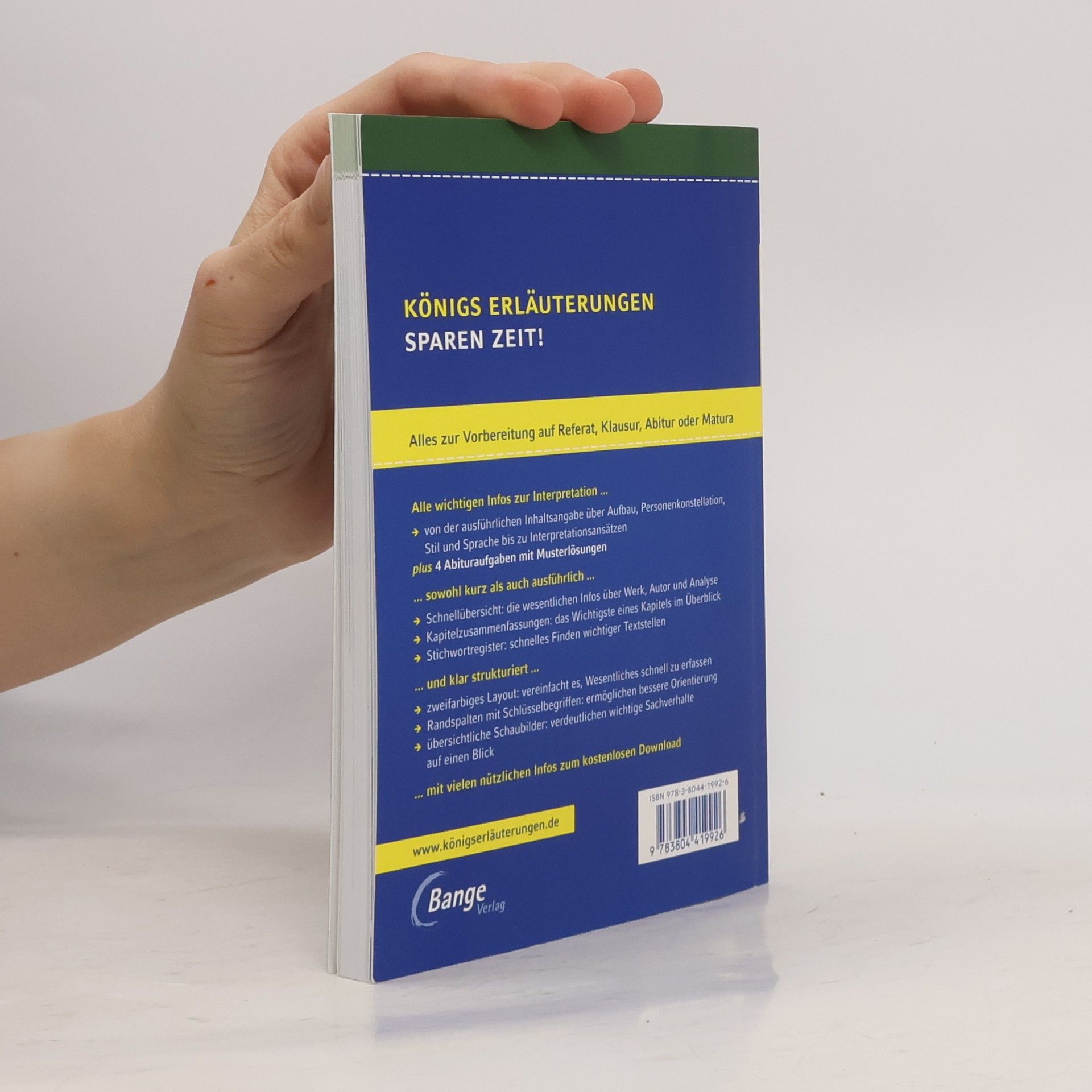 Königs Erlä Textyse und Interpretation mit ausführlicher Inhaltsangabe und AbituraufgabenDasspart dir lästiges Recherchieren und kostetweniger Zeit zur Vorbereitung .In einem Band bieten dir die neuen Königs Erläuterungen ALLES, was du zur Vorbereitung auf Referat, Klausur, Abitur oder Matura benötigst.Alle wichtigen Infos zur Interpretation...- von der ausführlichen Inhaltsangabe über Infos zu Leben und Werk bis zu Stil und Sprache u. v. m.- plus 4 Abituraufgaben mit Musterlösungen und 2 weitere zum kostenlosen Download... findest du kurz und knapp aber auch ausführlich- Die Schnellübersicht ft alle wesentlichen Infos zu Werk und Autor zusammen.- Die Kapitelzusammenfungen zeigen dir das Wichtigste eines Kapitels im Überblick ideal auch zum Wiederholen.- Das Stichwortregister ermöglicht dir schnelles Finden wichtiger Textstellen.... und klar strukturiert- Ein zweifarbiges Layout hilft dir Wesentliches einfacher und schneller zu erfen.- Die Randspalte mit Schlüsselbegriffen gibt dir bessere Orientierung beim Suchen wichtiger Textstellen.- Klar strukturierte Schaubilder zeigen dir wichtige Sachverhalte auf einen Blick.... mit weiteren extra Abituraufgaben und vielen zusätzlichen Infos zum kostenlosen Download .