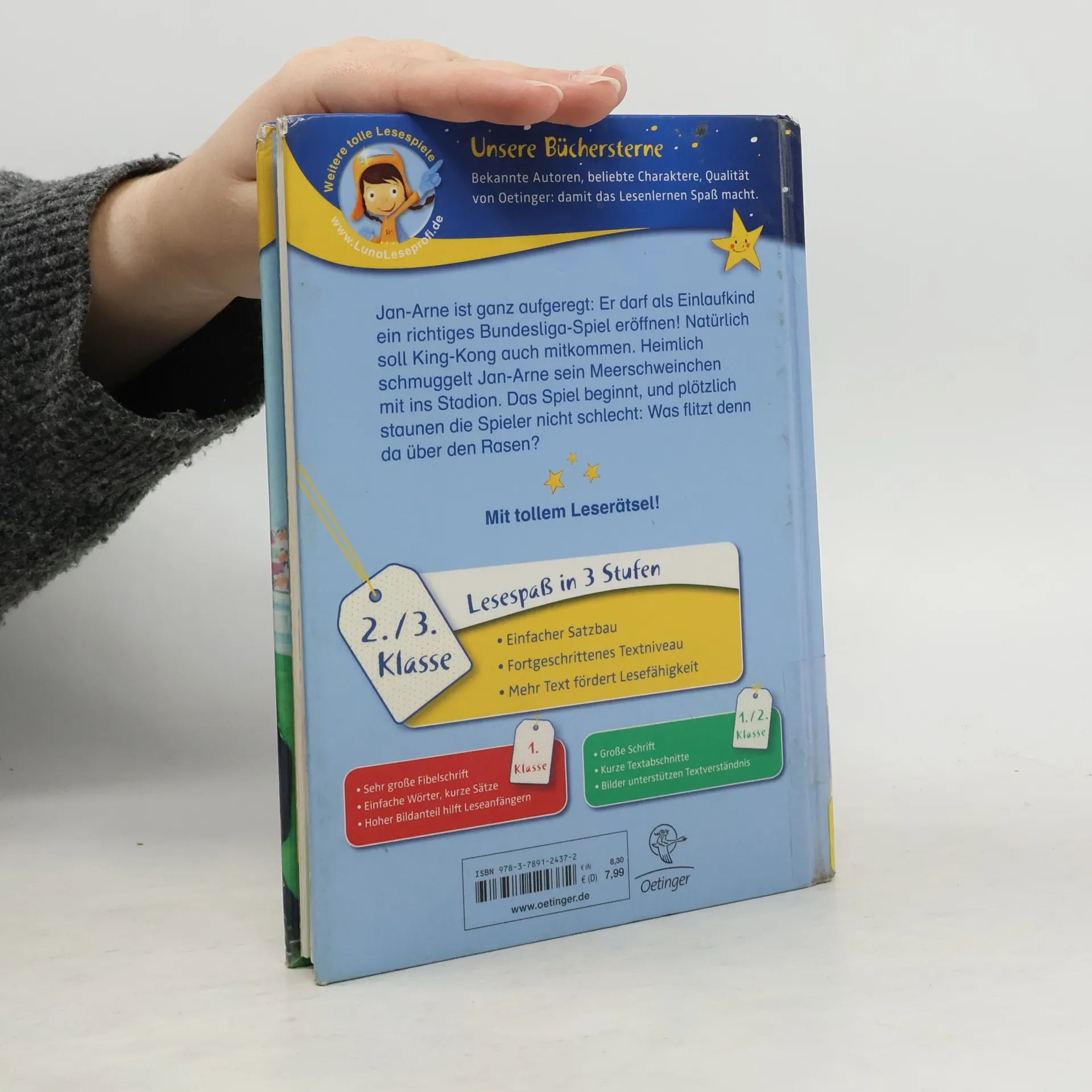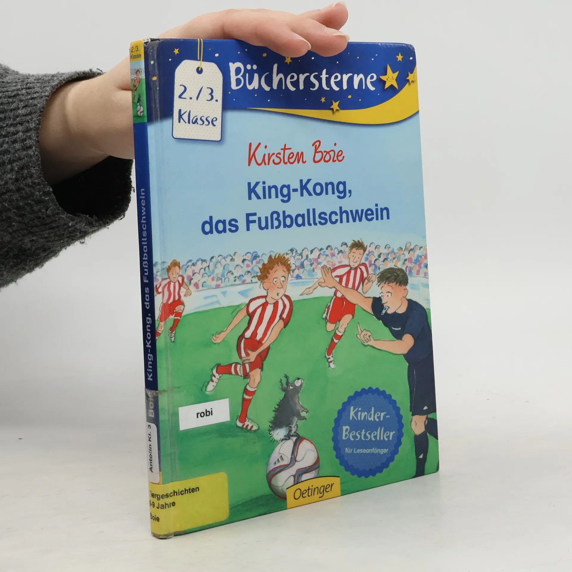 Jan-Arne ist ganz aufgeregt: Seine Fußballmannschaft wurde ausgelost, um bei einem richtigen Bundesligaspiel zusammen mit seiner Lieblingsmannschaft ins Stadion einzulaufen. So nah waren Jan-Arne und Michi ihren Fußballhelden noch nie! Klar, dass auch King-Kong das Spiel nicht verpassen darf. Heimlich schmuggelt Jan-Arne King-Kong in seiner Sporttasche ins Stadion. Doch vergisst er ihn völlig, als der große Moment kommt und er das Spiel mit eröffnen darf. Das Spiel beginnt! Da entdecken die Zuschauer plötzlich ein kleines, puscheliges Wesen auf dem Rasen, direkt vor dem Concordia-Tor. King-Kong ist aus der Tasche geflitzt und hat das saftige Grün entdeckt! Die Zuschauer sind ganz aus dem Häuschen. King-Kong bringt alles durcheinander, entpuppt sich aber auch als echtes Glücksschwein. Kirsten Boies „King-Kong, das Fußballschwein“ behandelt DEN Traum jedes kleinen Fußballers: Einmal „Einlaufkind“ sein! Lesen lernen mit „Büchersterne“ für die 2./3. Klasse: Einfacher Satzbau Fortgeschrittenes Textniveau Mehr Text fördert Lesefähigkeit Mit tollem Leserätsel Bekannte Autoren und beliebte Charaktere, damit das Lesenlernen Spaß macht Gelistet bei Antolin.