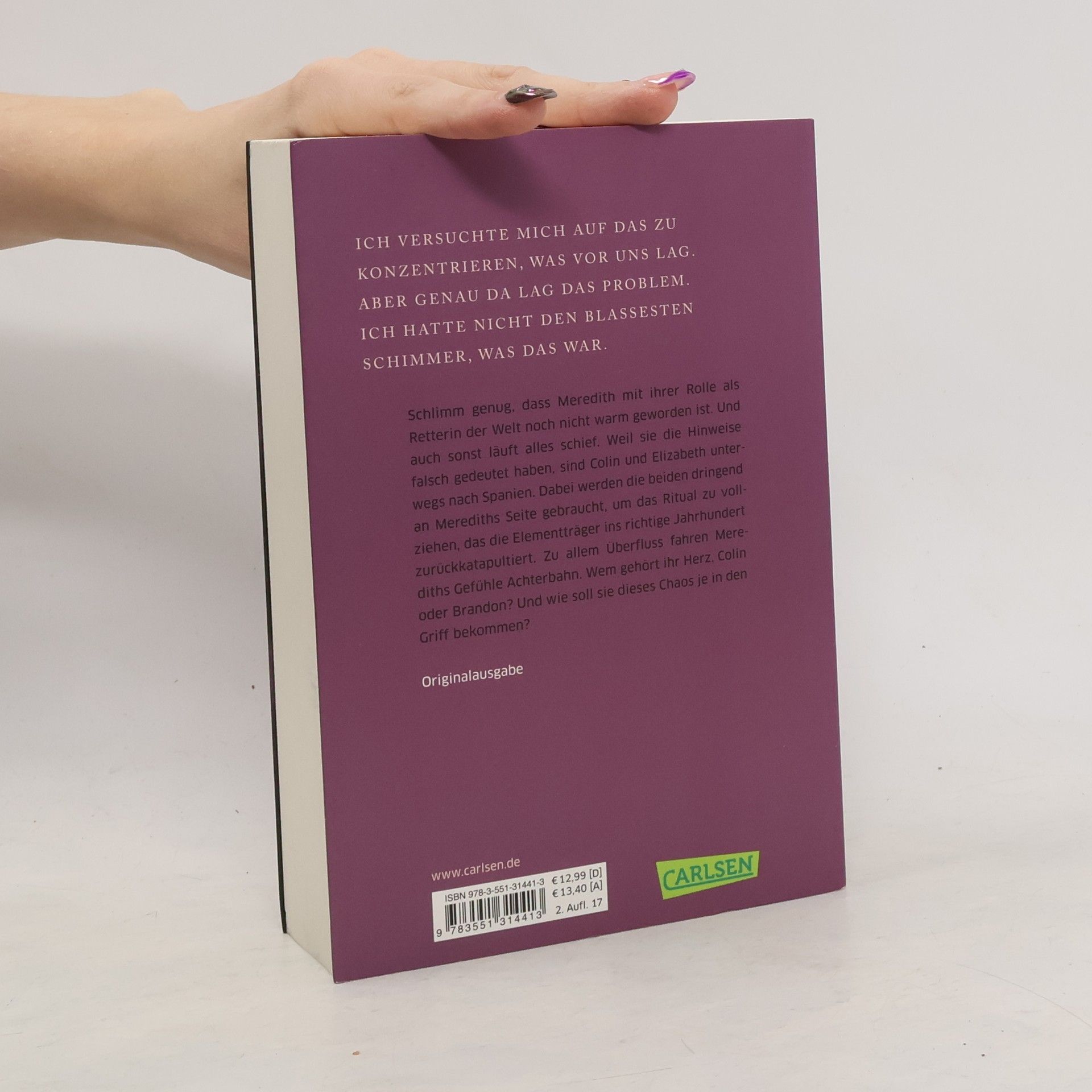Schlimm genug, dass Meredith mit ihrer Rolle als Retterin der Welt noch nicht warm geworden ist. Doch auch sonst läuft nichts so, wie es soll. Weil sie die Hinweise falsch gedeutet haben, sind Colin und Elizabeth unterwegs nach Spanien. Dabei werden die beiden dringend an Merediths Seite gebraucht, um das Ritual zu vollziehen, das die Elementträger ins richtige Jahrhundert zurückkatapultiert. Zu allem Überfluss fahren Merediths Gefühle Achterbahn. Wem gehört ihr Herz, Colin oder Brandon? Und wie soll sie dieses Chaos je in den Griff bekommen? //Alle Bände der Reihe: -- Zeitlos 1: Das Flüstern der Zeit -- Zeitlos 2: Die Wellen der Zeit -- Zeitlos 3: Die Flammen der Zeit// Die Zeitlos-Reihe ist abgeschlossen.